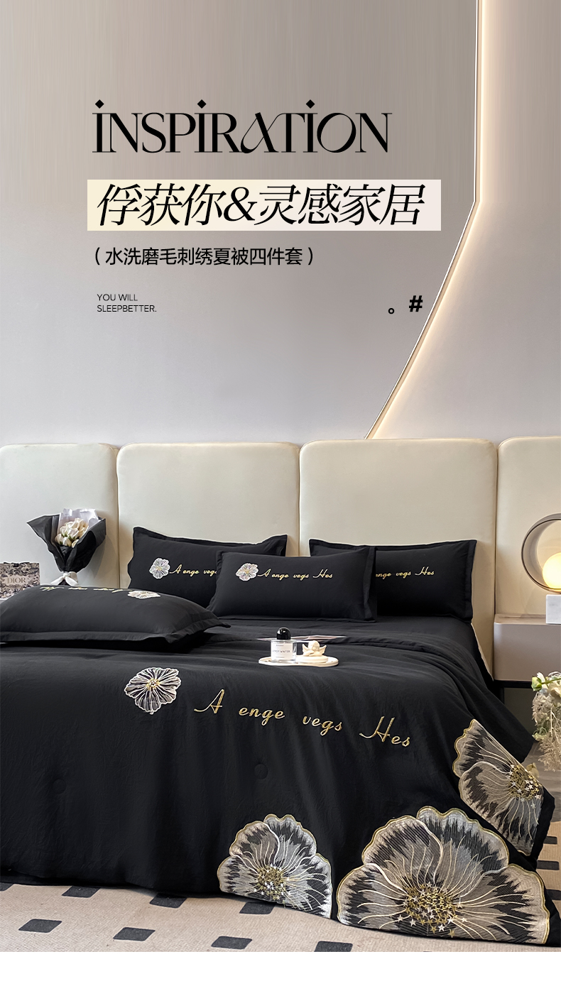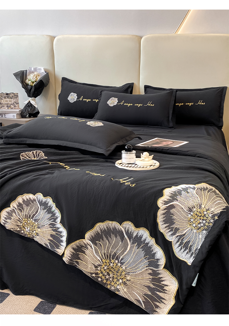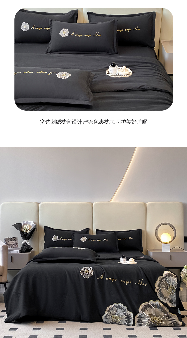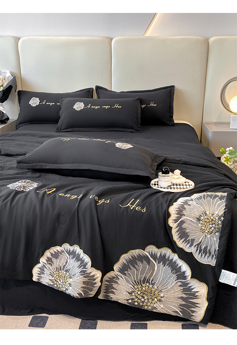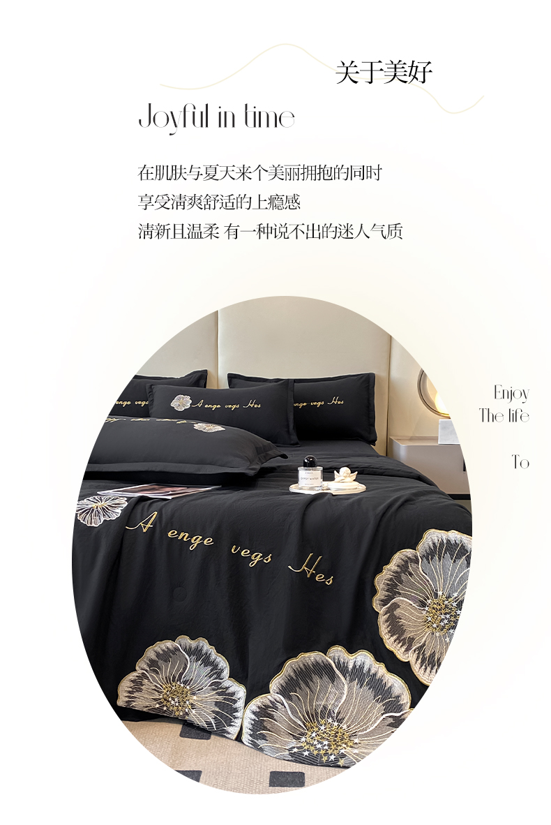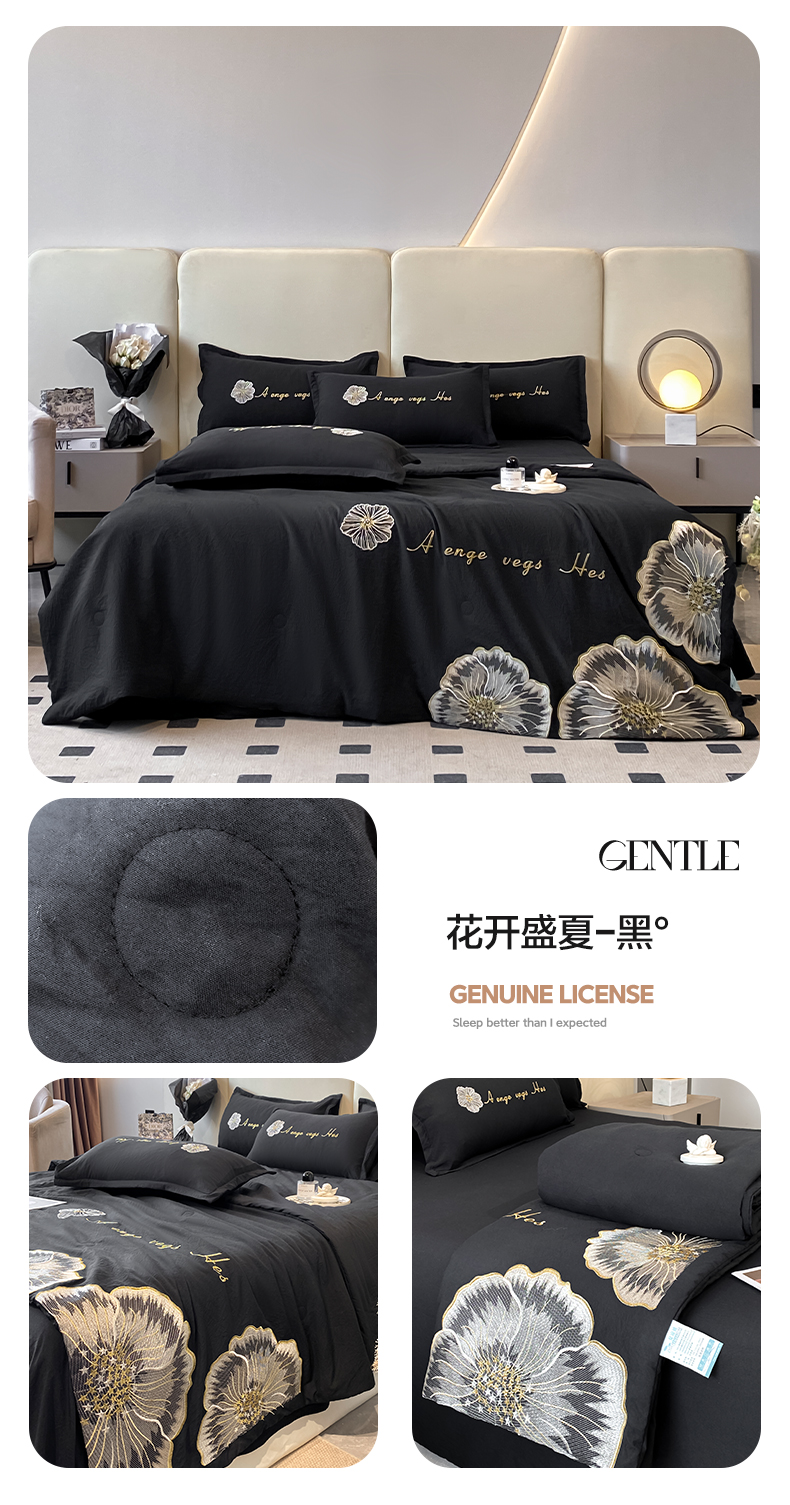 商品名称:你好美丽 2025新款水洗磨毛刺绣夏被四件套-花开盛夏 花开盛夏-黑