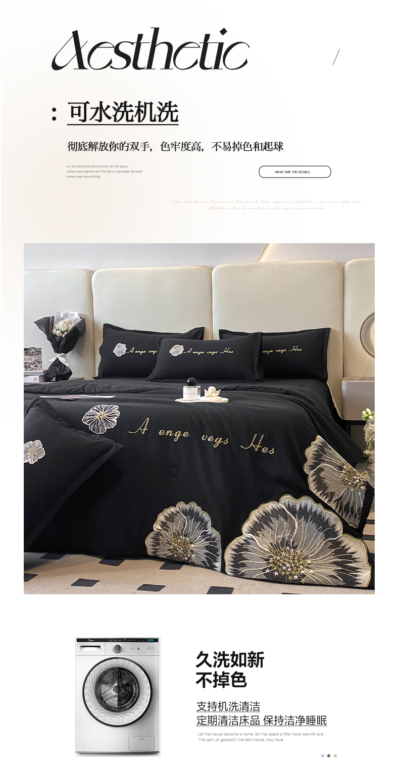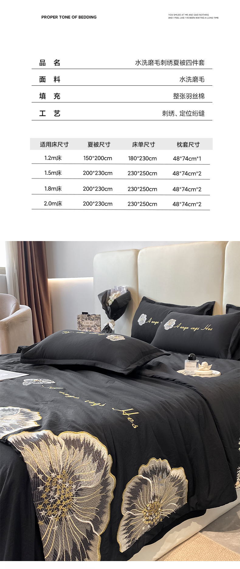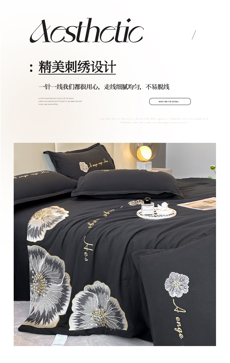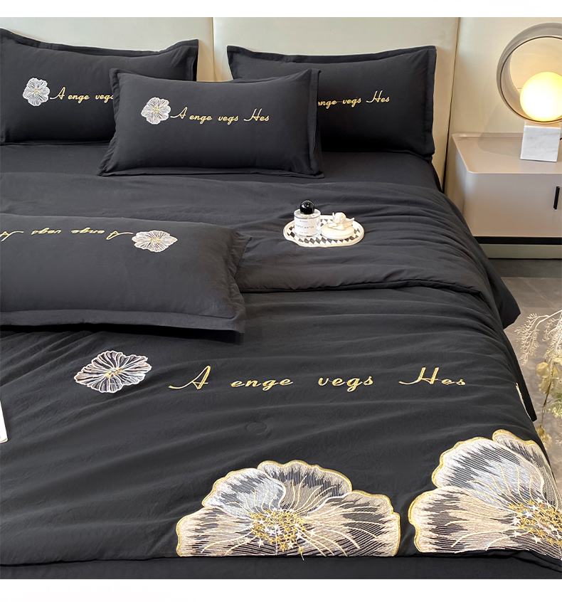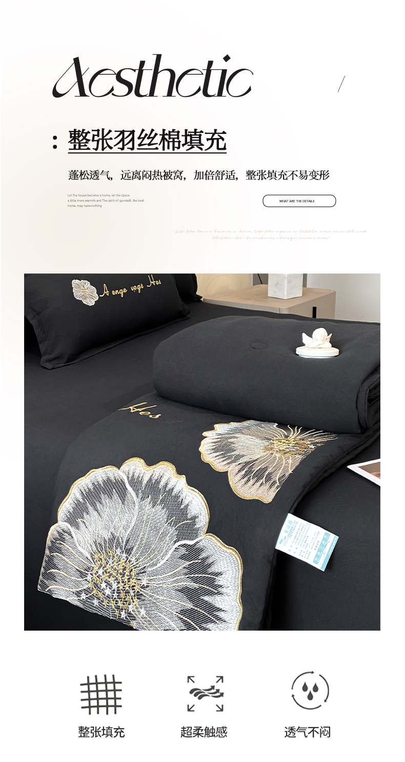 商品名称:你好美丽 2025新款水洗磨毛刺绣夏被四件套-花开盛夏 花开盛夏-黑