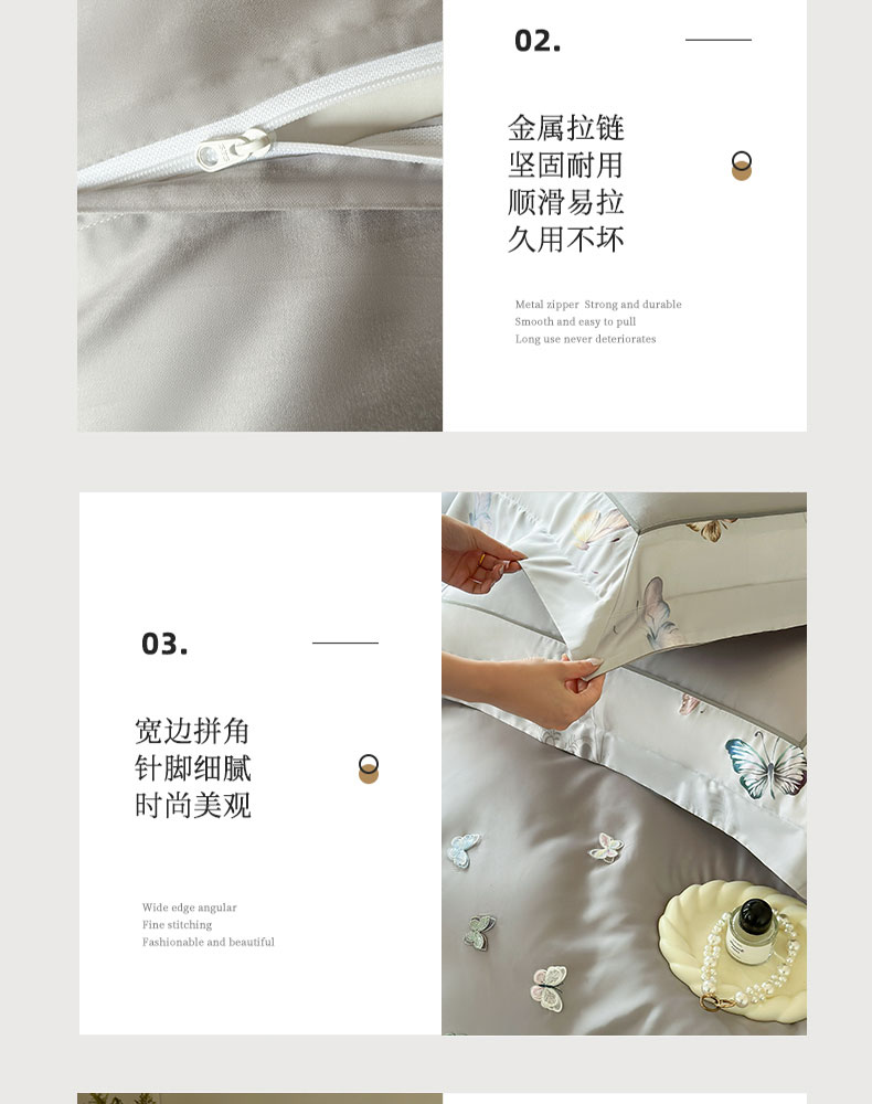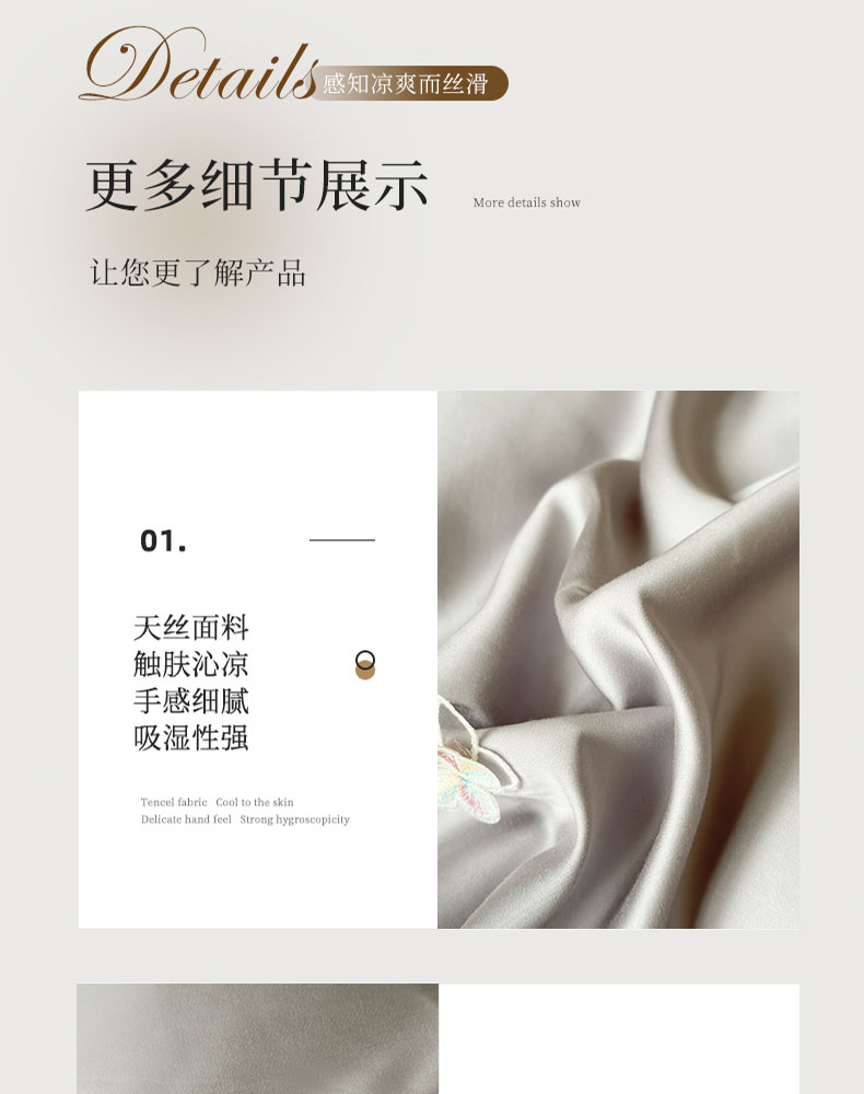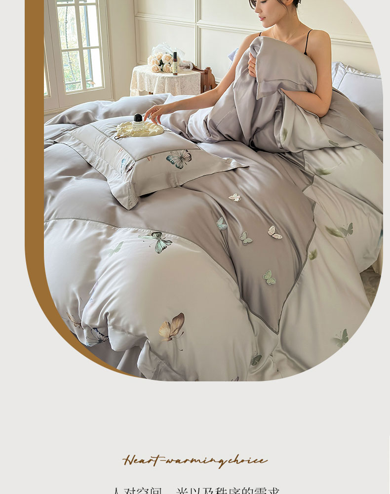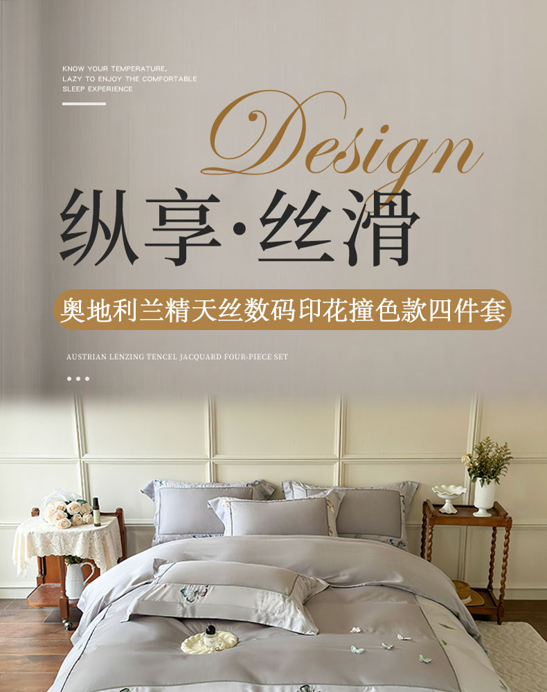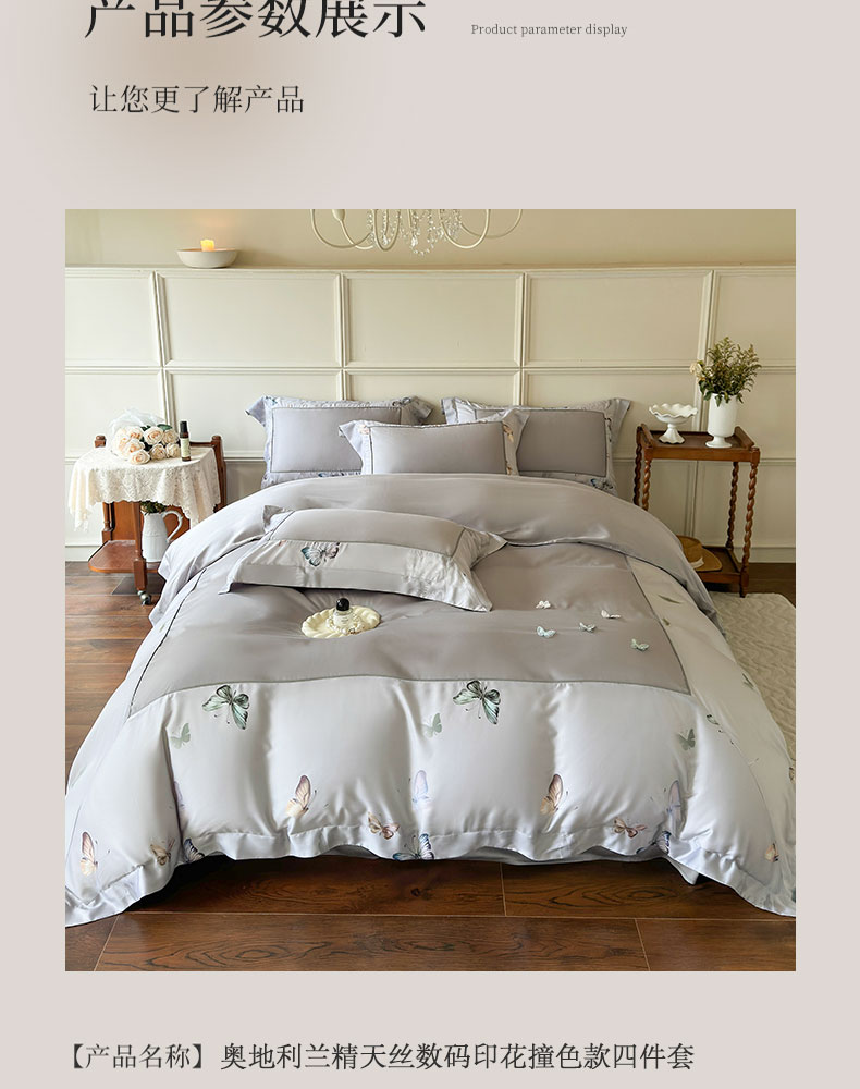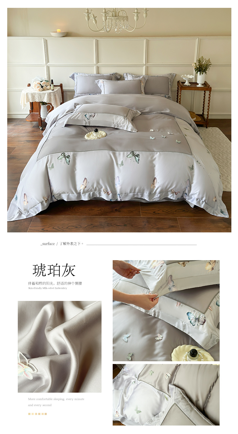 商品名称:娇逸家居 2025新款60支兰精天丝数码印花立体绣花天丝四件套-蝶翎 琥珀灰
