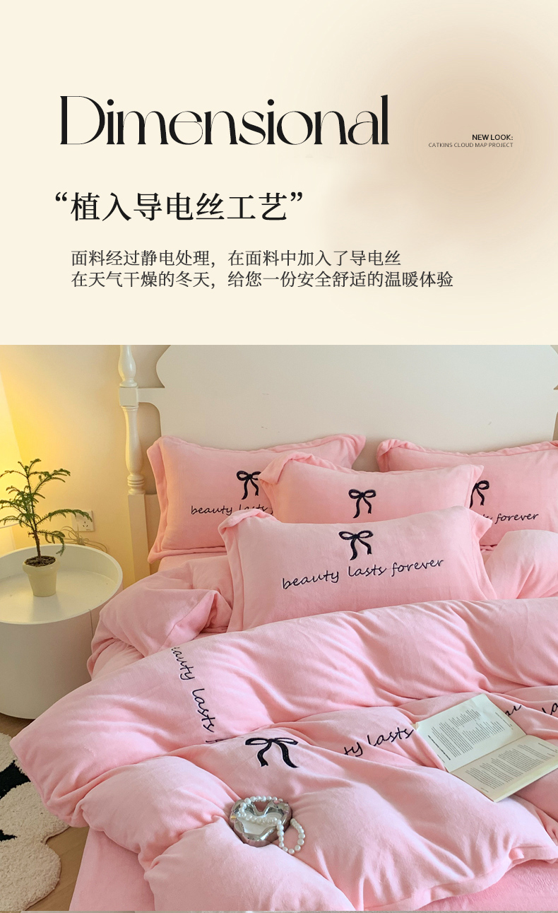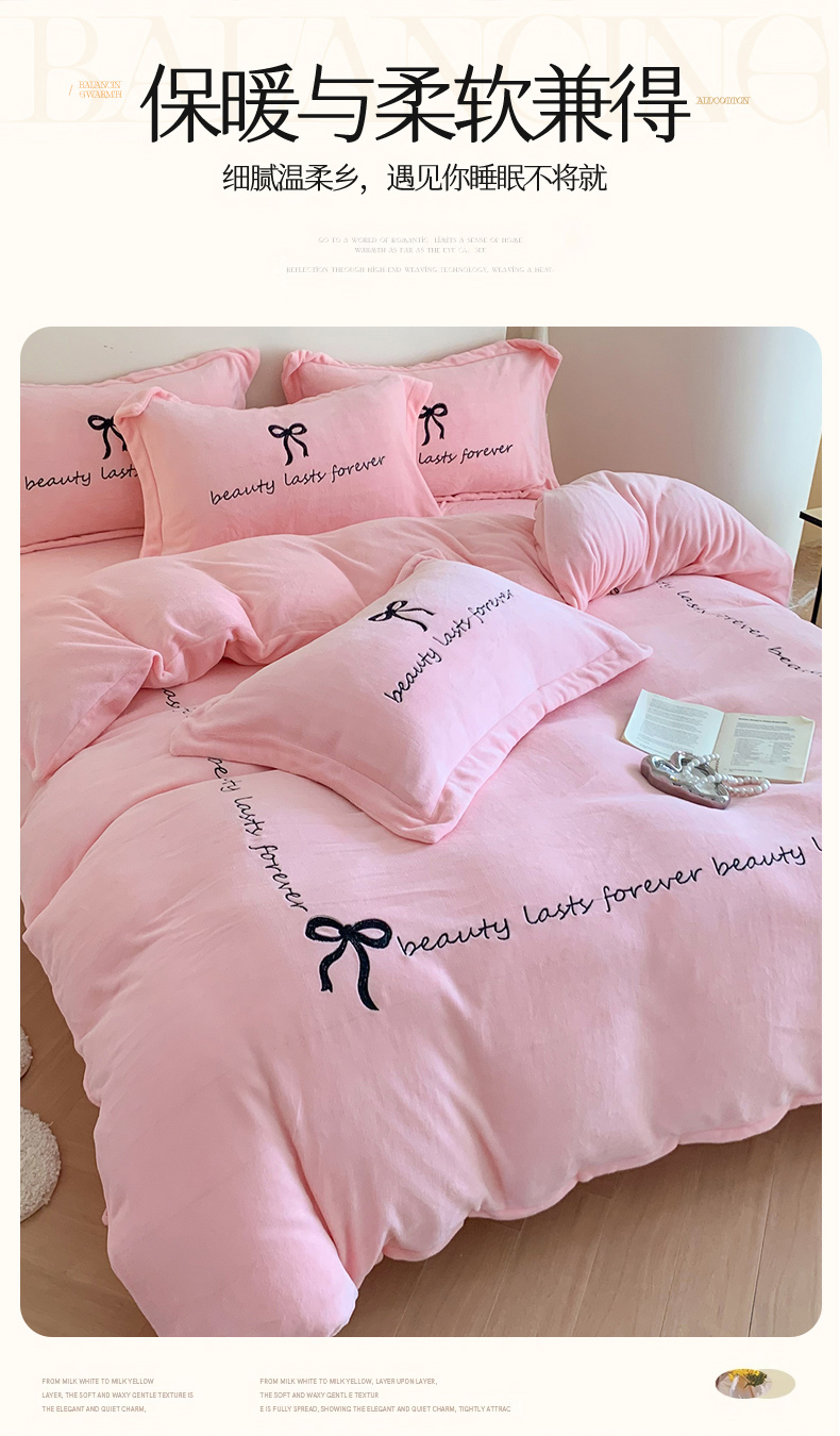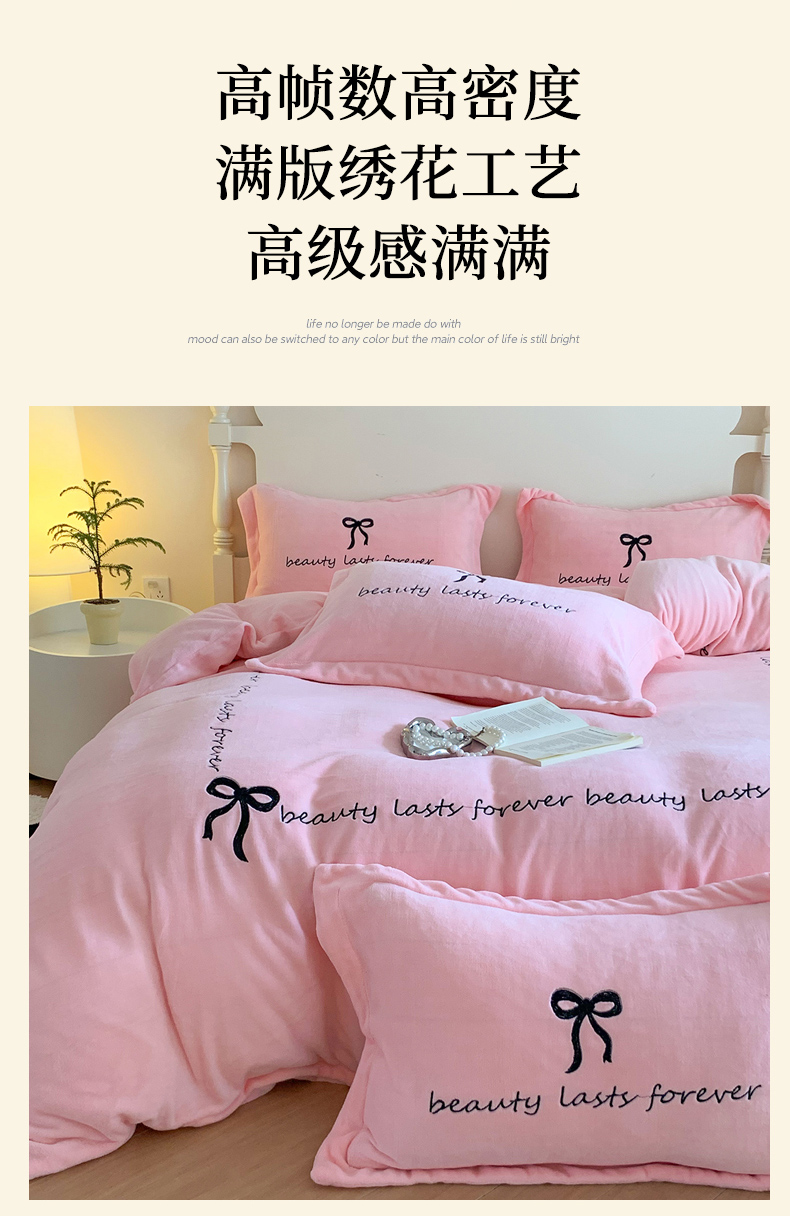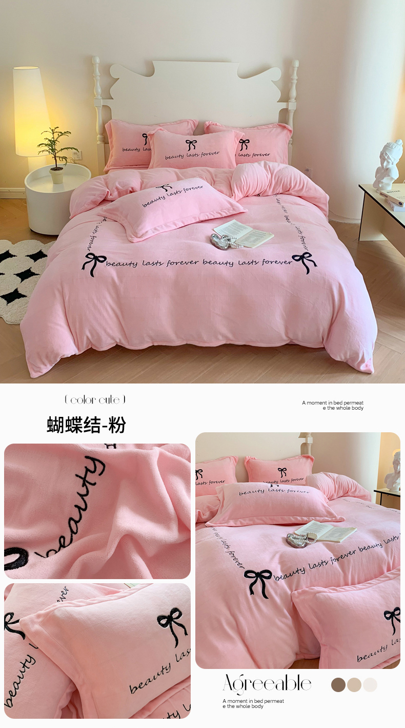 当前位置: 91家纺网 > 商品网购 > 床品套件 > 四件套 > 牛奶绒四件套 > 你好美丽 2025新款200克牛奶绒四件套--蝴蝶结 蝴蝶结粉