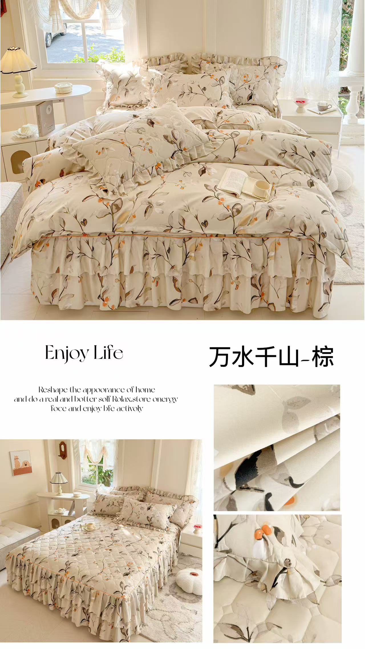 当前位置: 91家纺网 > 商品网购 > 床品套件 > 四件套 > 其它四件套 > 雨田家纺 2024新款印花夹棉床裙四件套万水千山-棕
