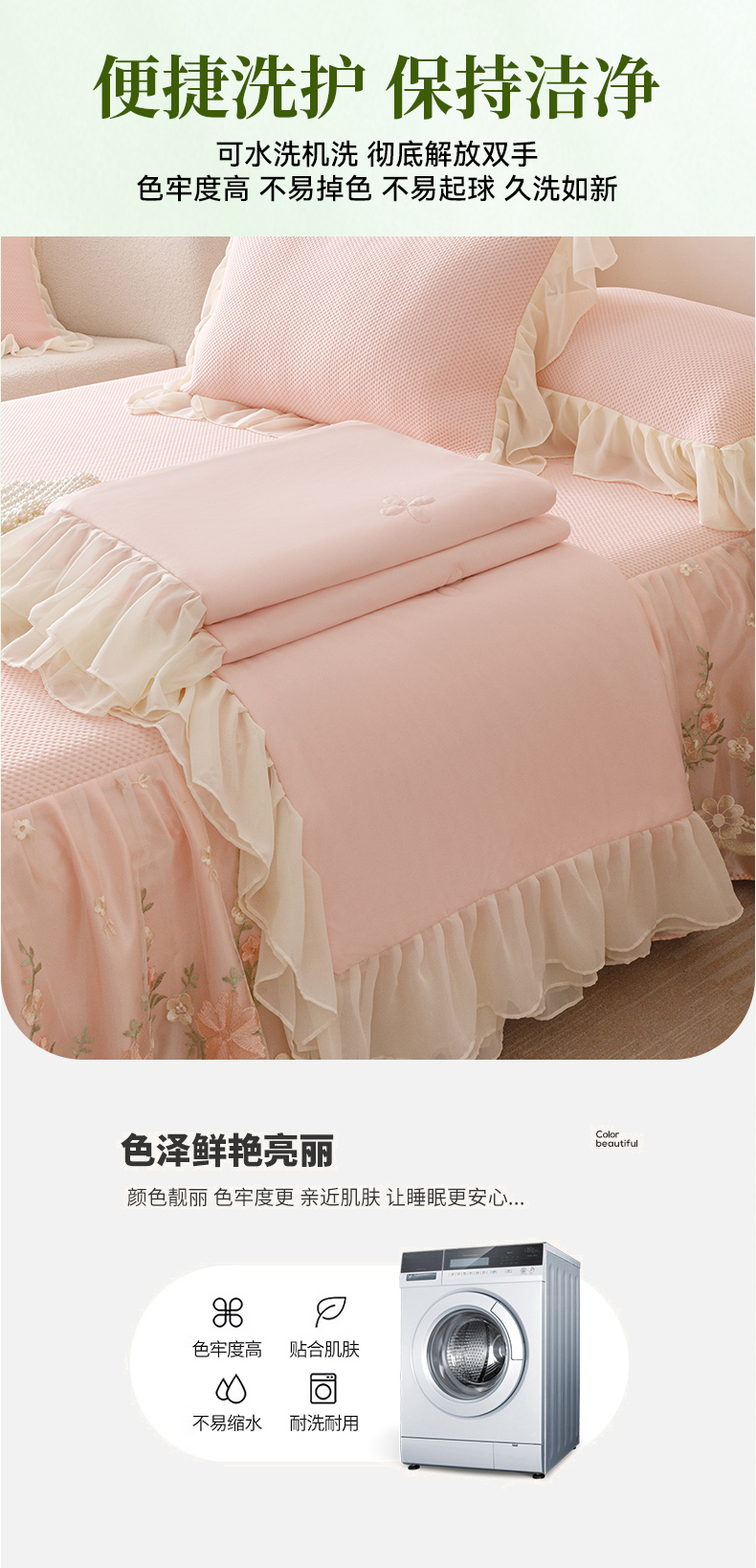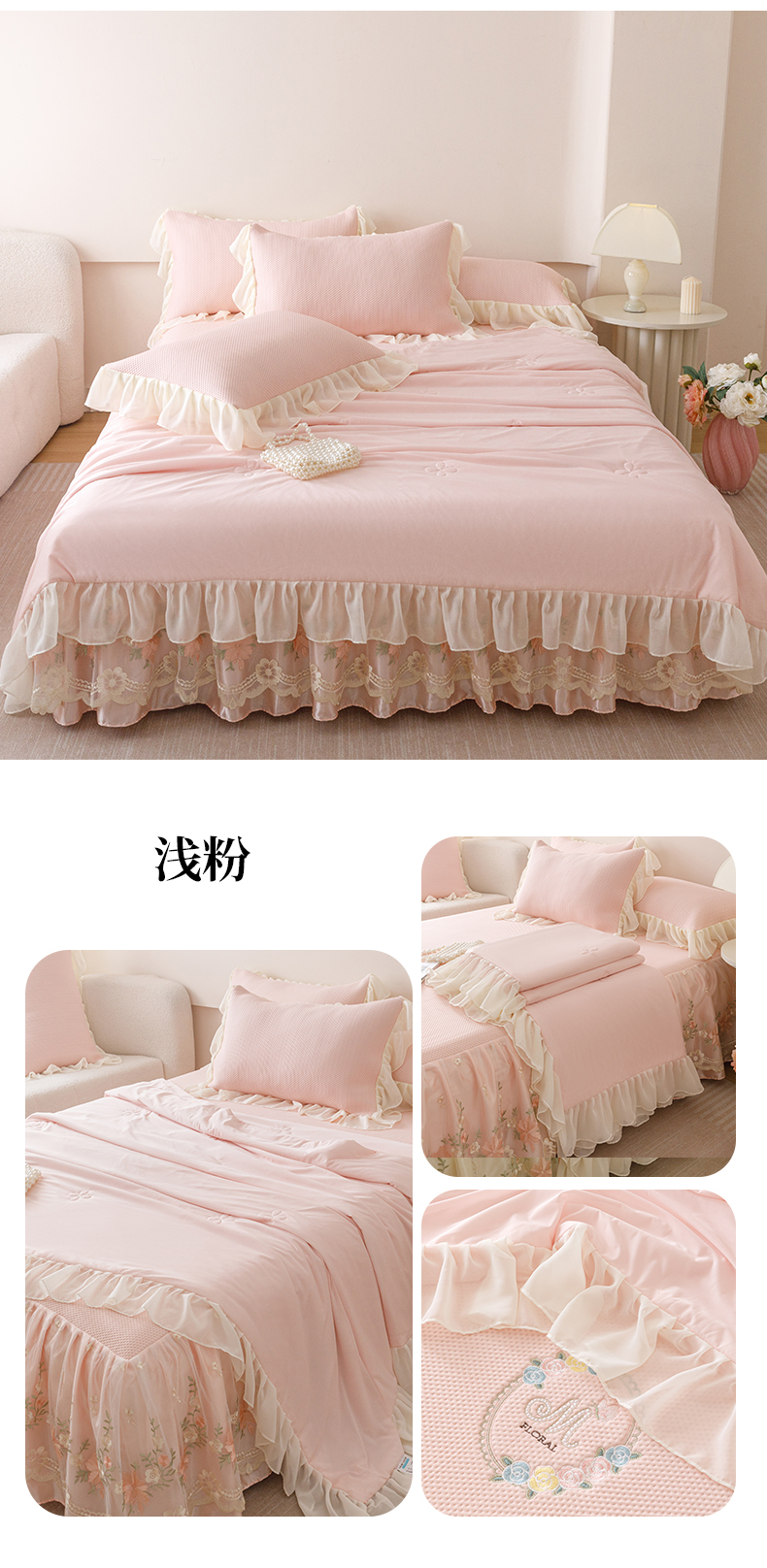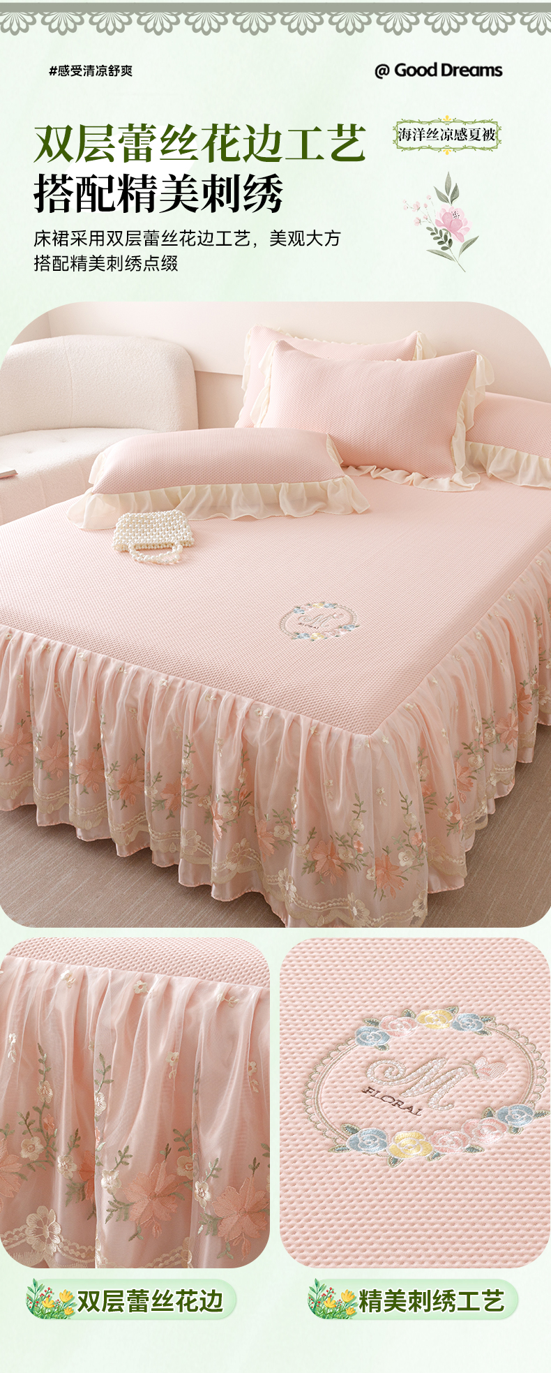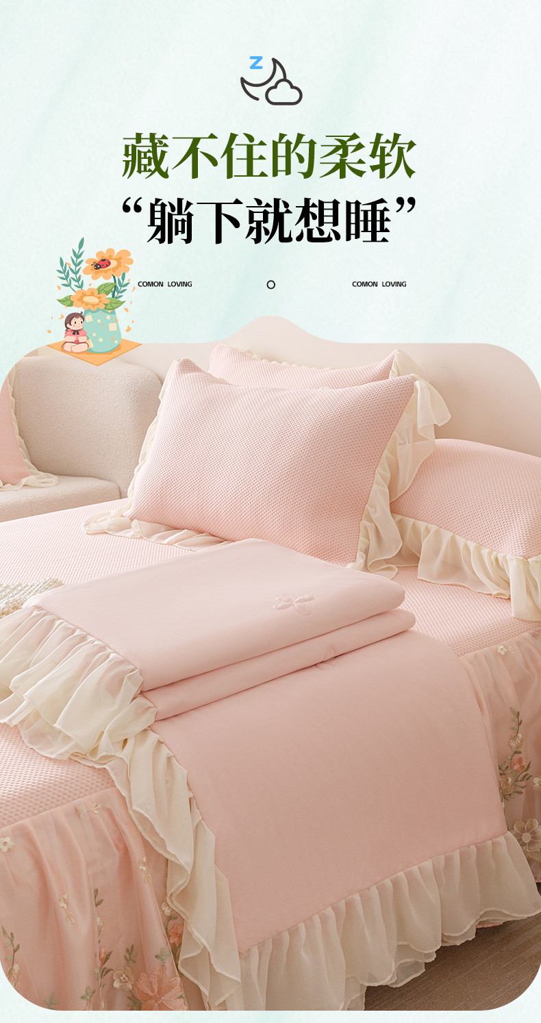 (总)好儿喜家纺 2024新款伊芙琳夏被凉席床裙四件套,浅绿,橄榄绿,奶白,浅粉,浅蓝