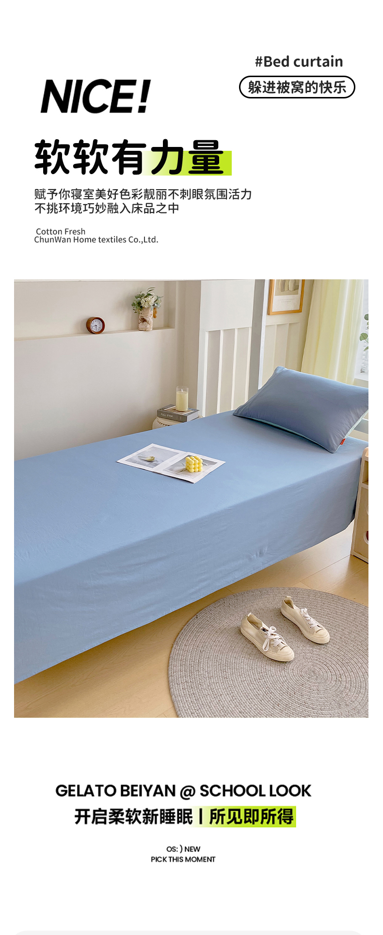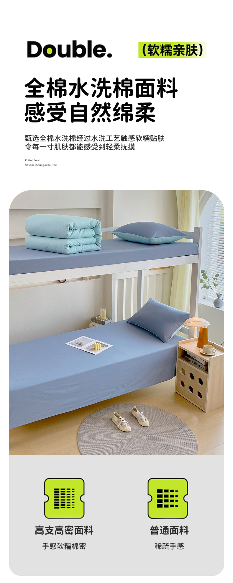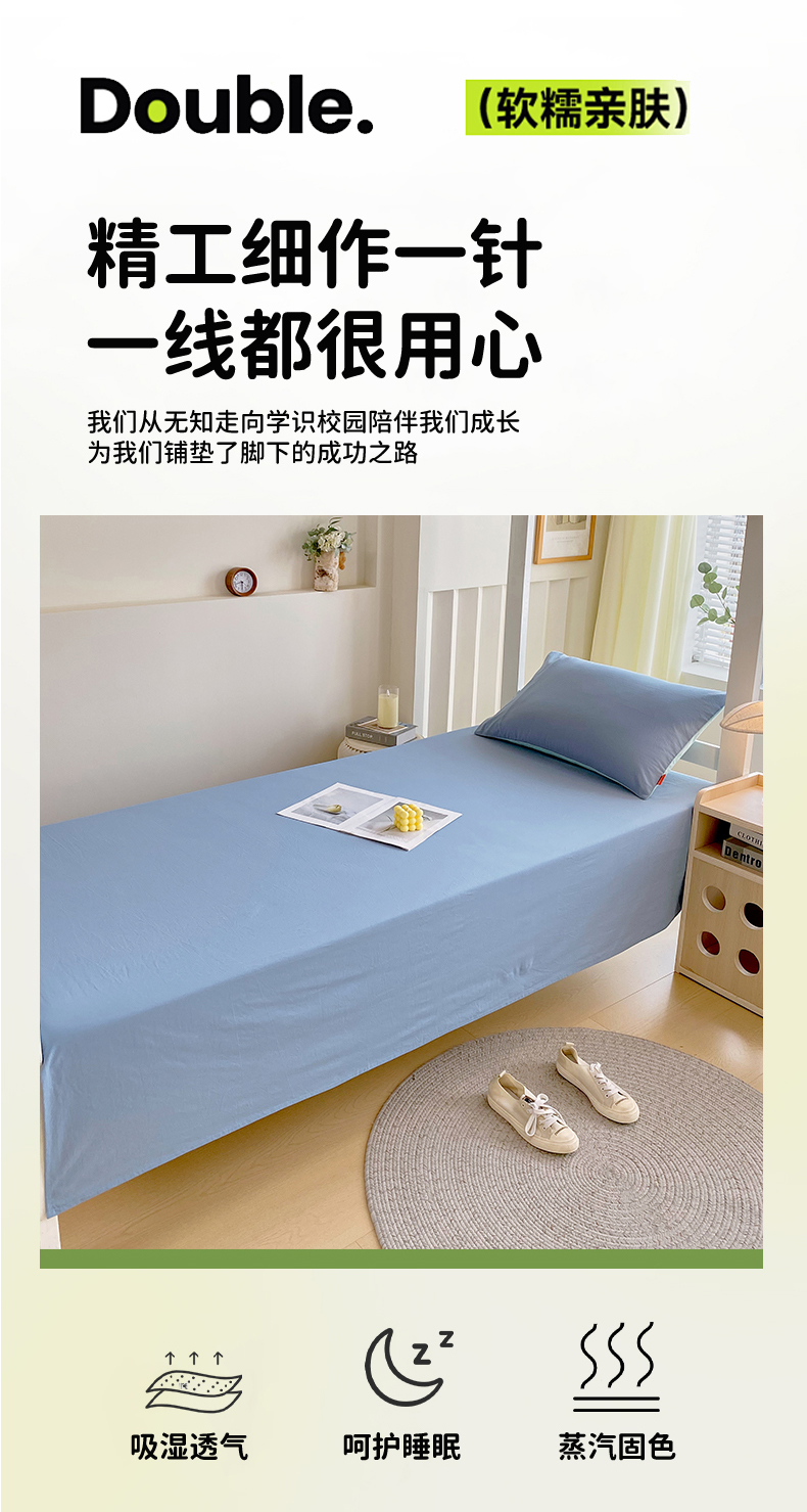 商品名称:春皖家纺 2025新款学生季A类双拼水洗棉小清新单品系列床单单件-单床单 素雅幻蓝