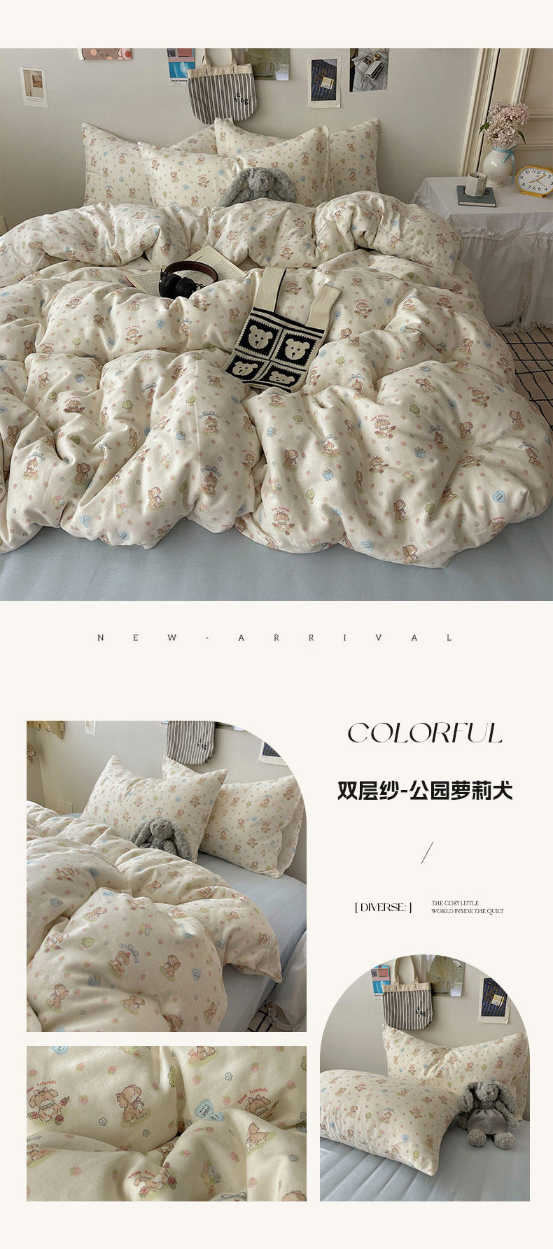 (总)六巷胡同 2026新款INS博主风卡通A类全棉双层纱四件套,双层纱-海盐樱桃熊,双层纱-贝雷腊肠狗,双层纱-达奇家政喵,双层纱-多乐背带熊,双层纱-花圃萝莉猫,双层纱-马卡龙蛋糕,双层纱-萌趣佩佩猪,双层纱-甜心童话猫,双层纱-元气蝴蝶结,双层纱-云朵苏萨犬