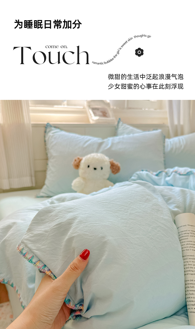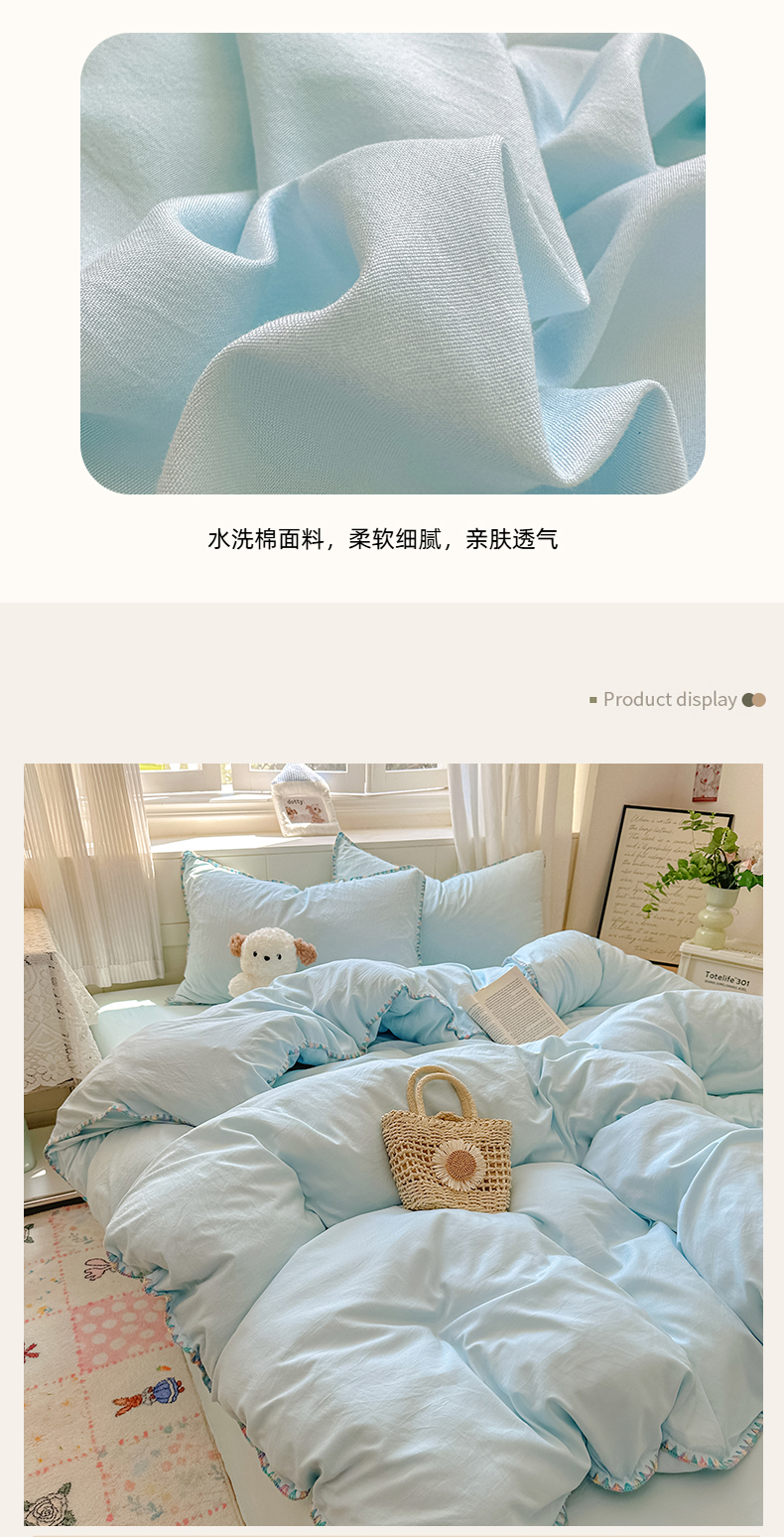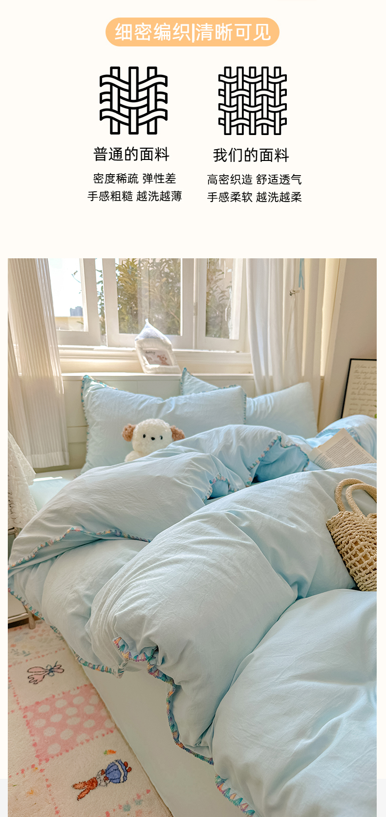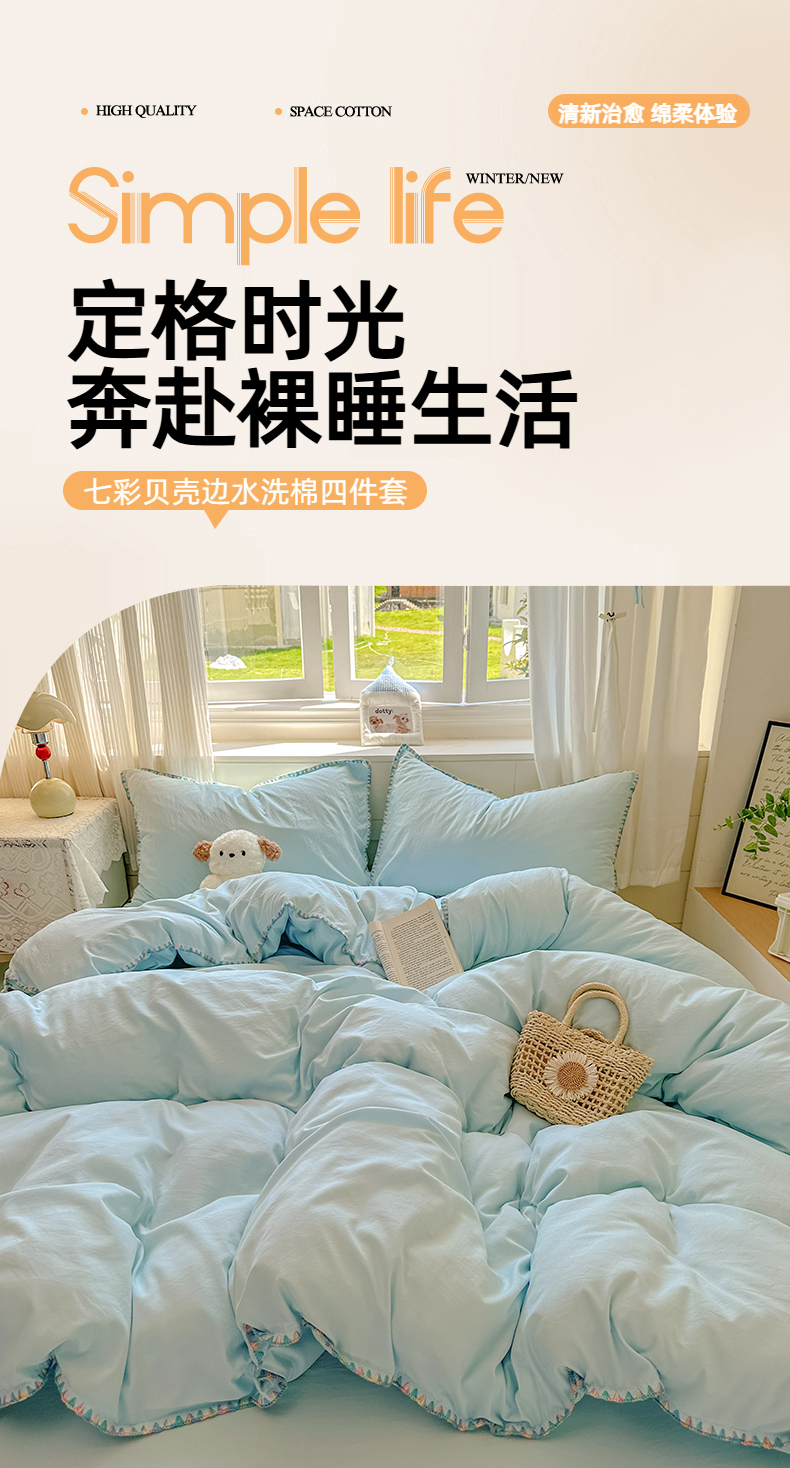 当前位置: 91家纺网 > 商品网购 > 床品套件 > 四件套 > 水洗棉四件套 > 冕悠家纺 2025新款A类七彩贝壳边水洗棉四件套 七彩-云水蓝