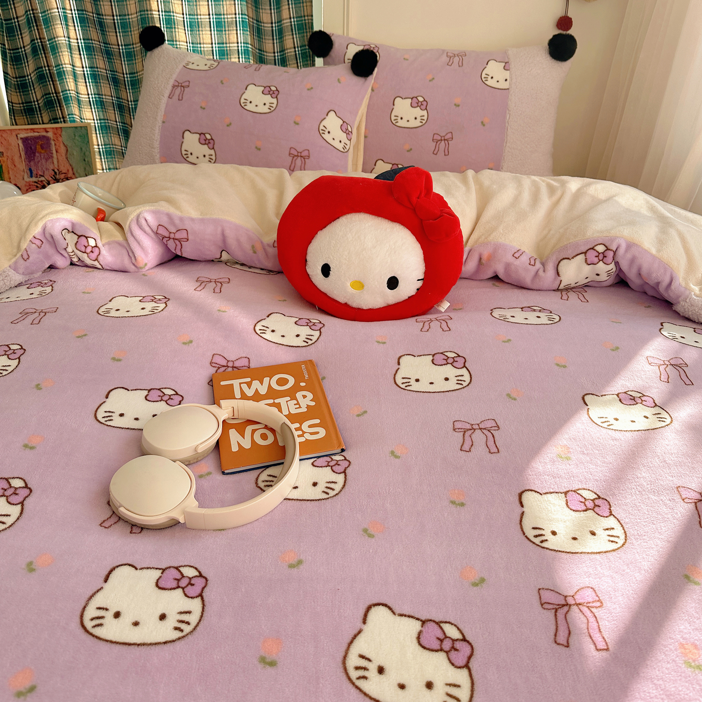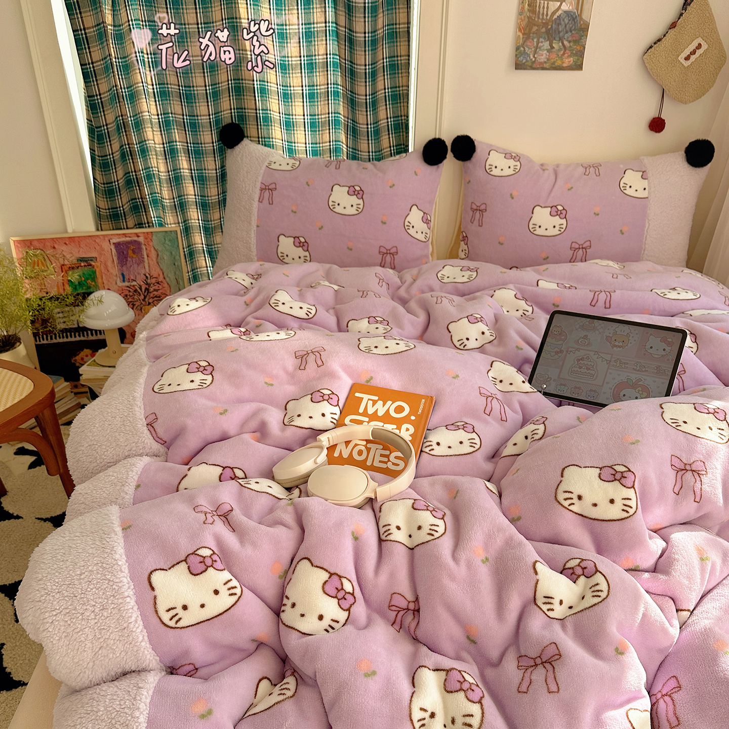 顾里家纺 2025新款甜风毛球羊羔拼接牛奶绒蝴蝶结花猫系列四件套 花猫紫
