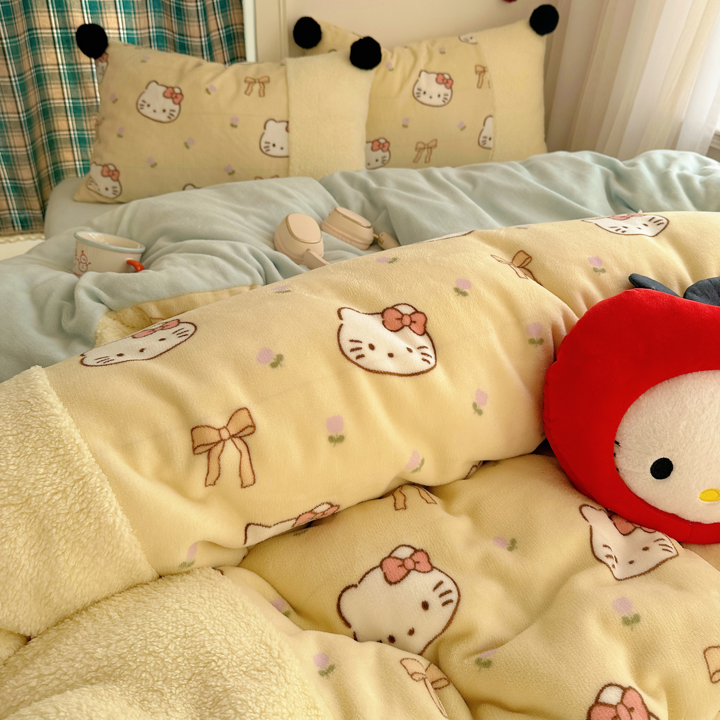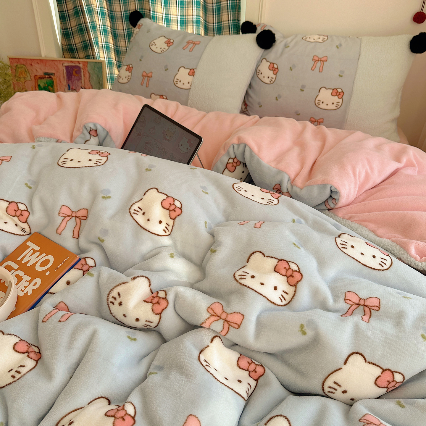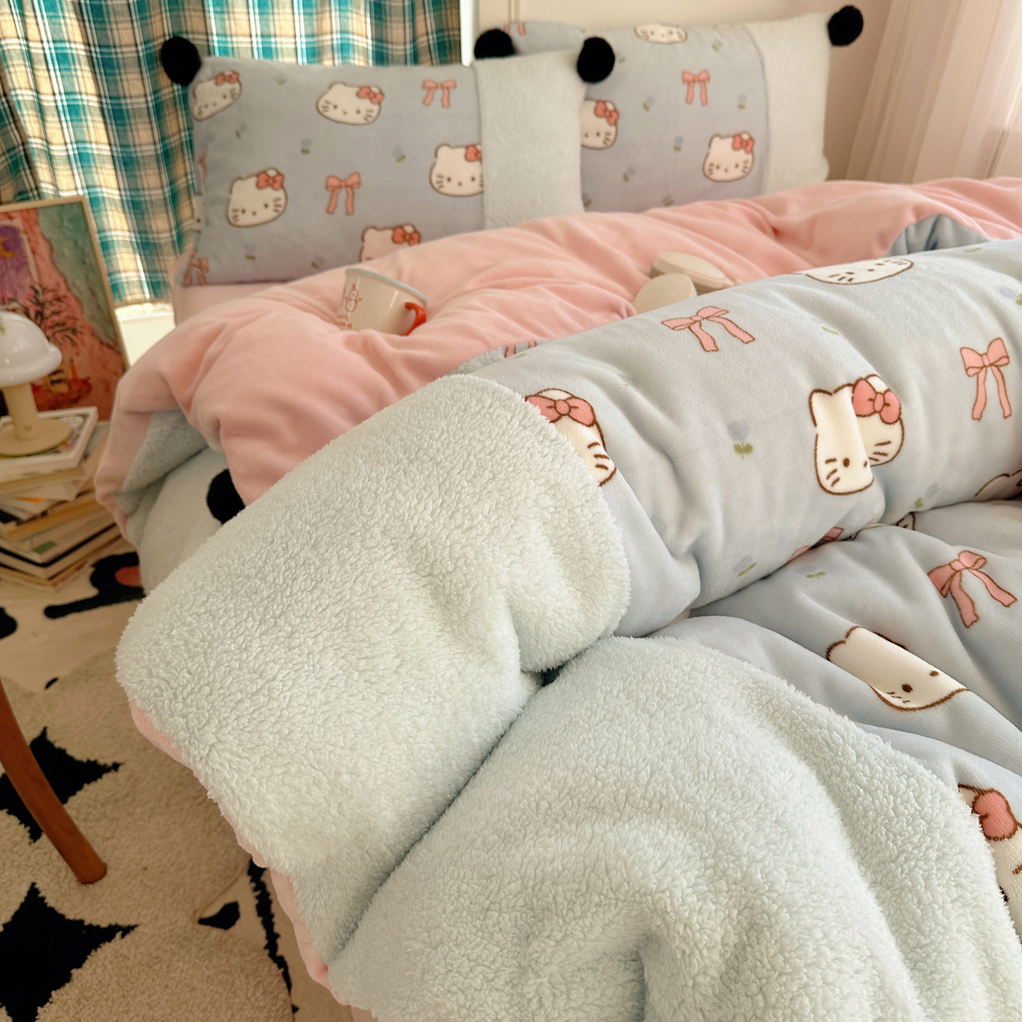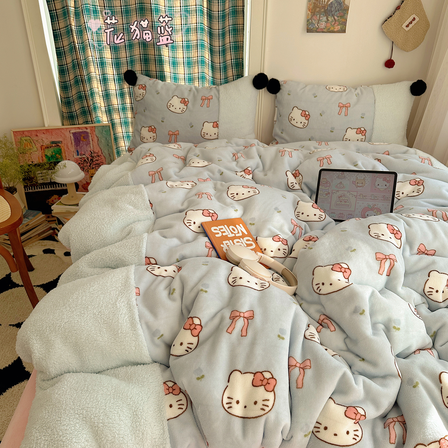 (总)顾里家纺 2025新款甜风毛球羊羔拼接牛奶绒蝴蝶结花猫系列四件套,花猫粉,花猫黄,花猫蓝,花猫紫