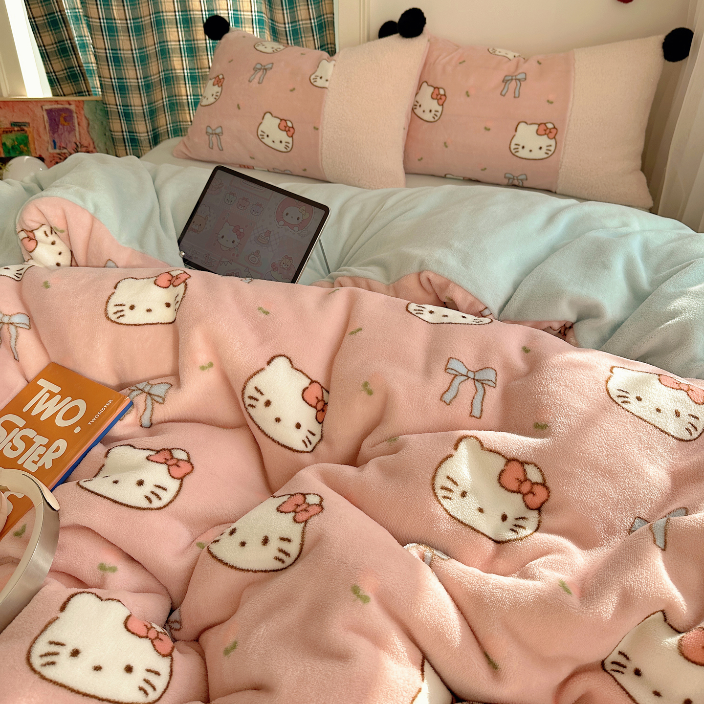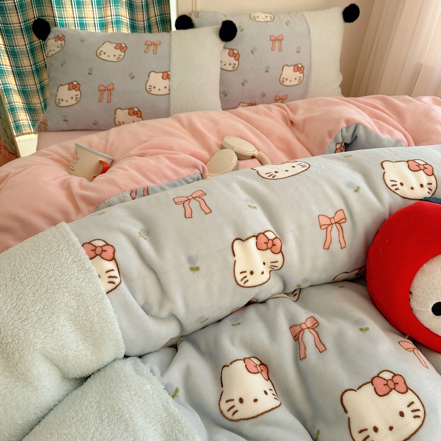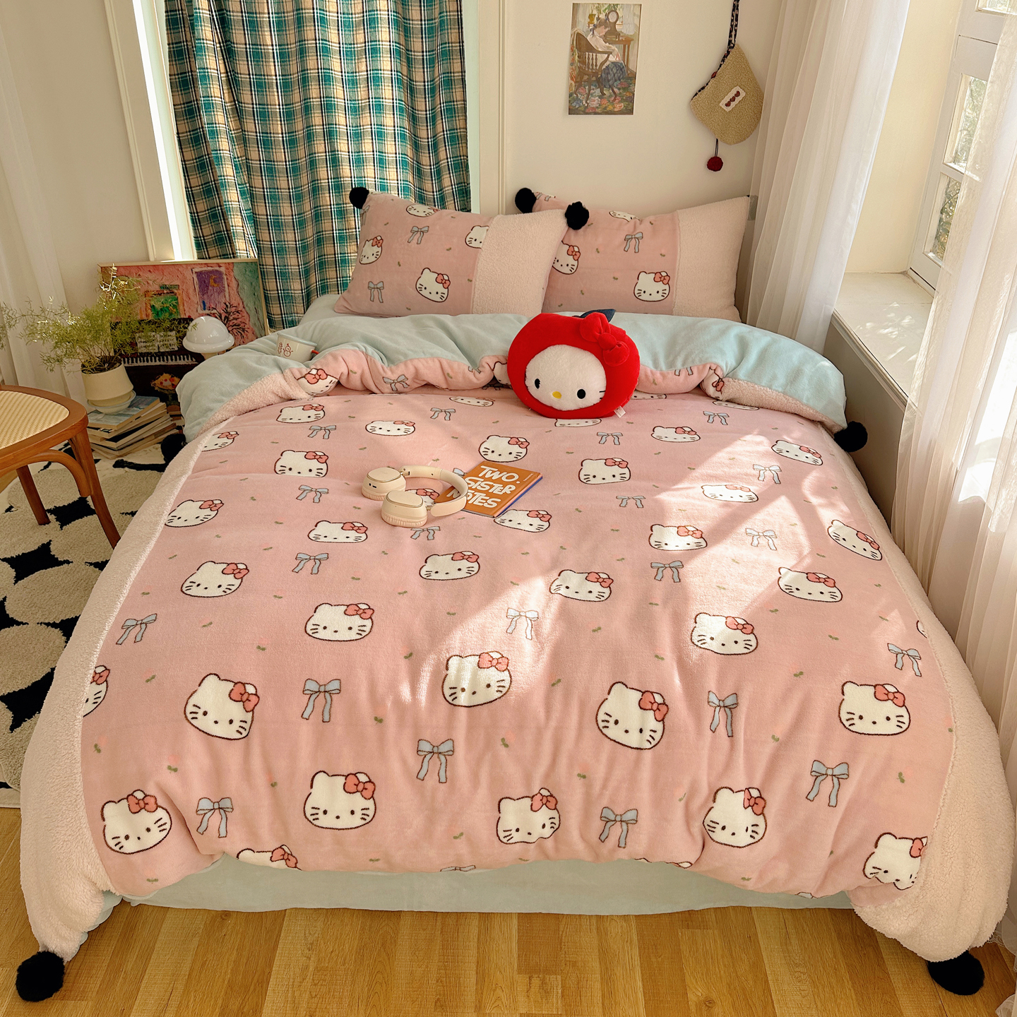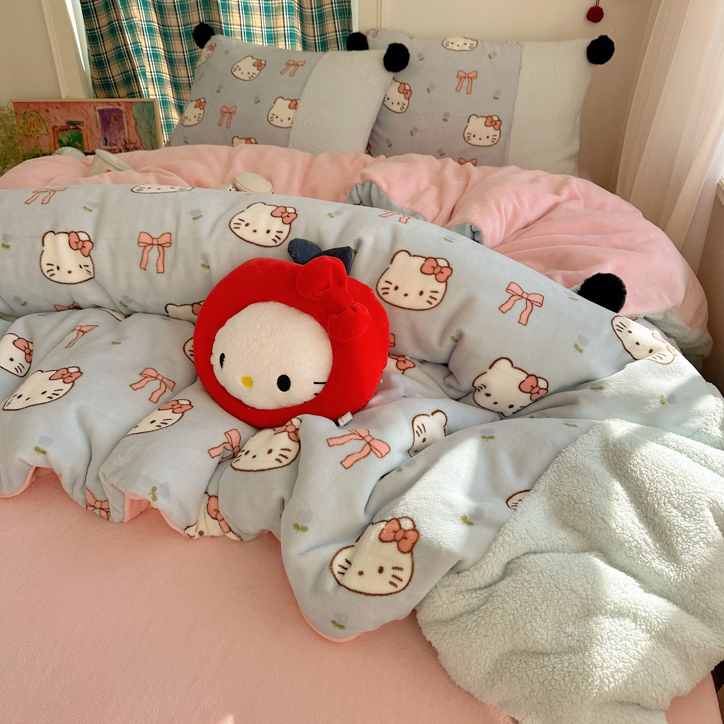 (总)顾里家纺 2025新款甜风毛球羊羔拼接牛奶绒蝴蝶结花猫系列四件套,花猫粉,花猫黄,花猫蓝,花猫紫