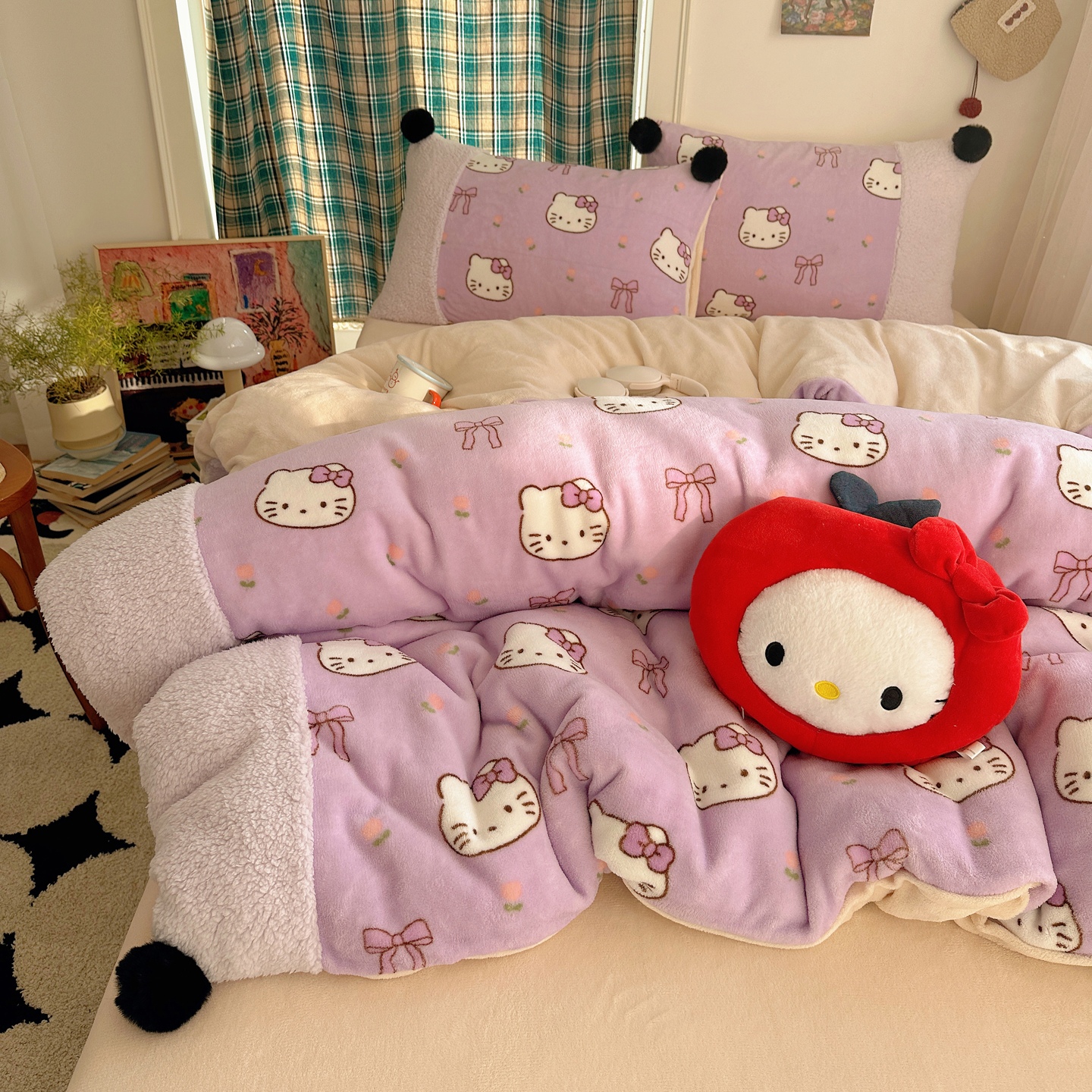 商品名称:顾里家纺 2025新款甜风毛球羊羔拼接牛奶绒蝴蝶结花猫系列四件套 花猫紫