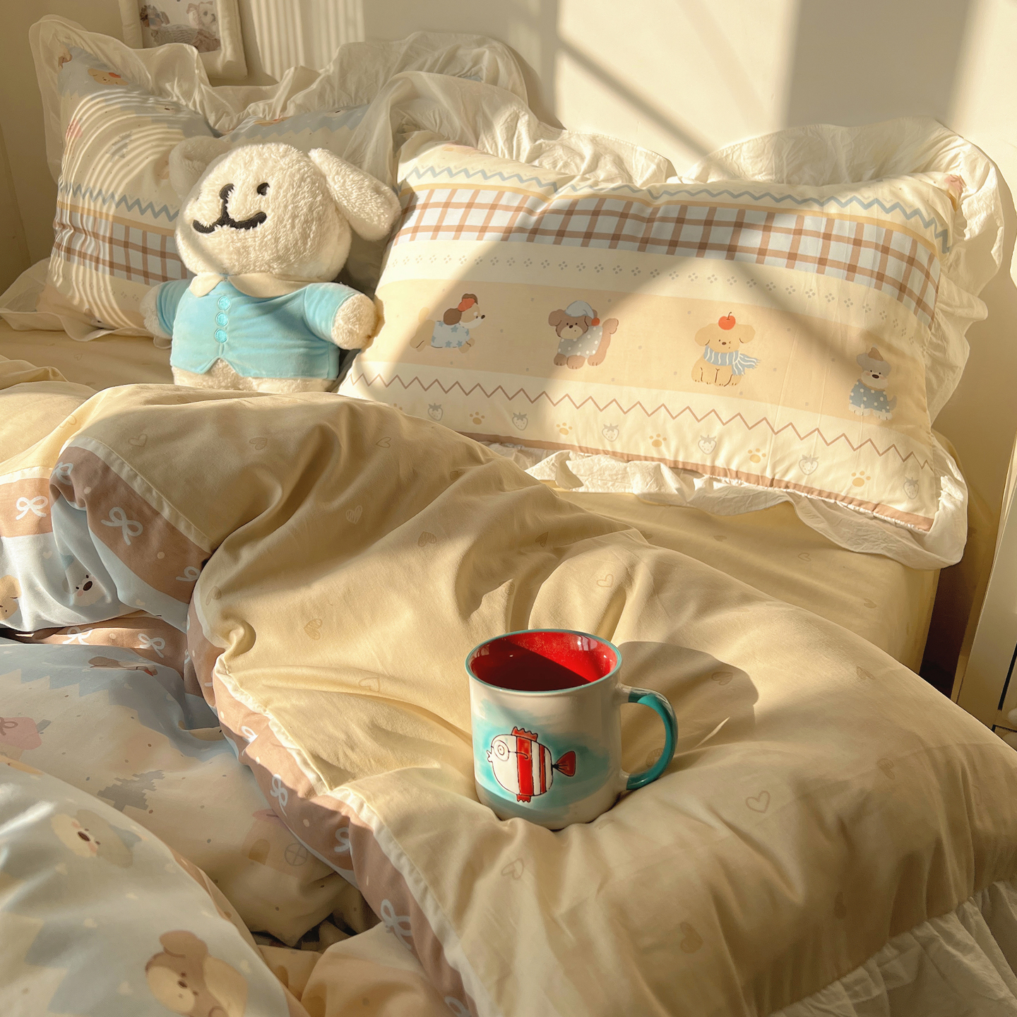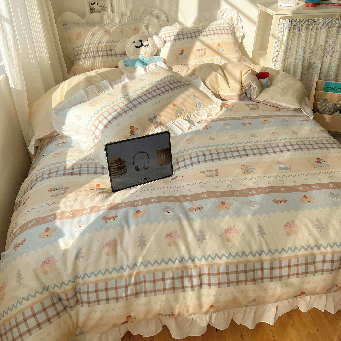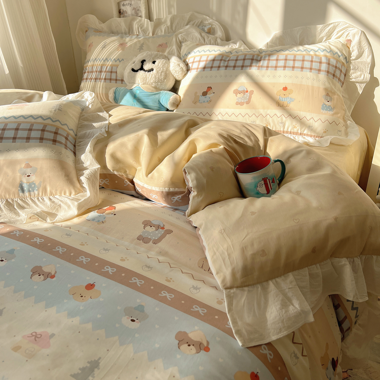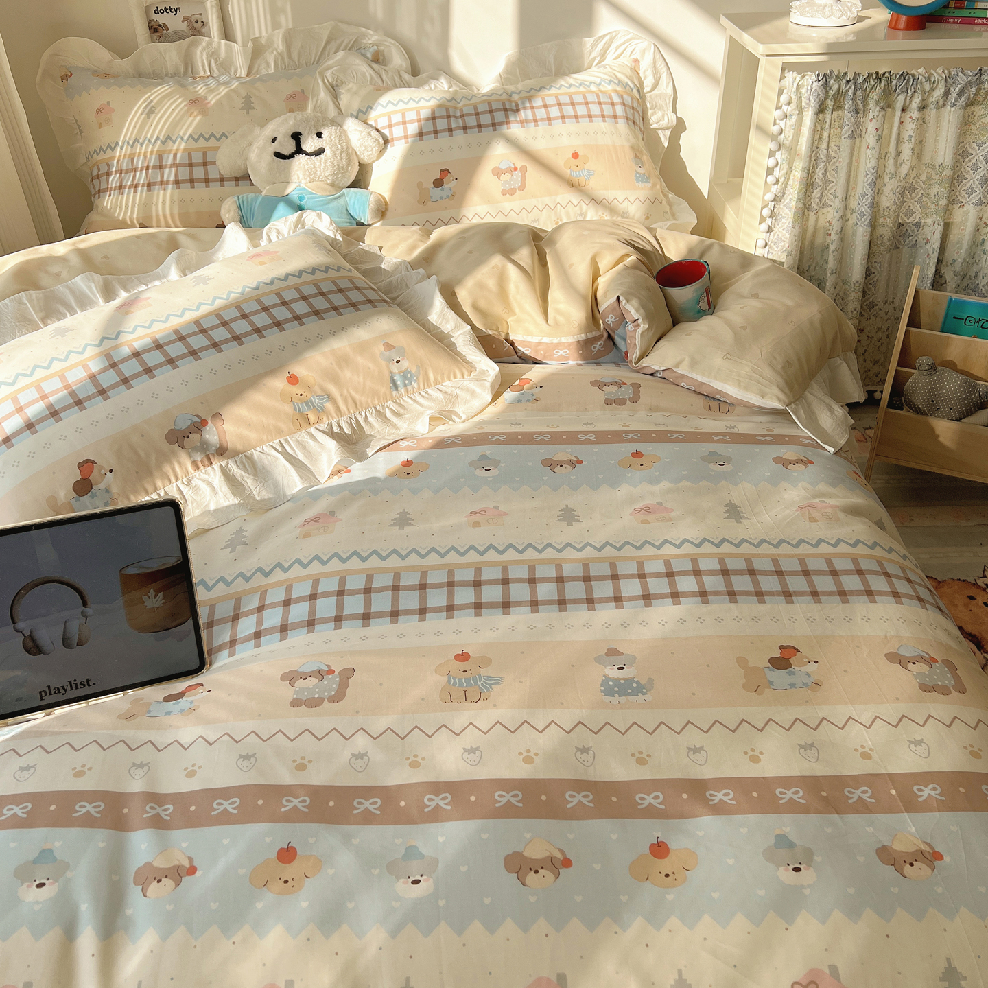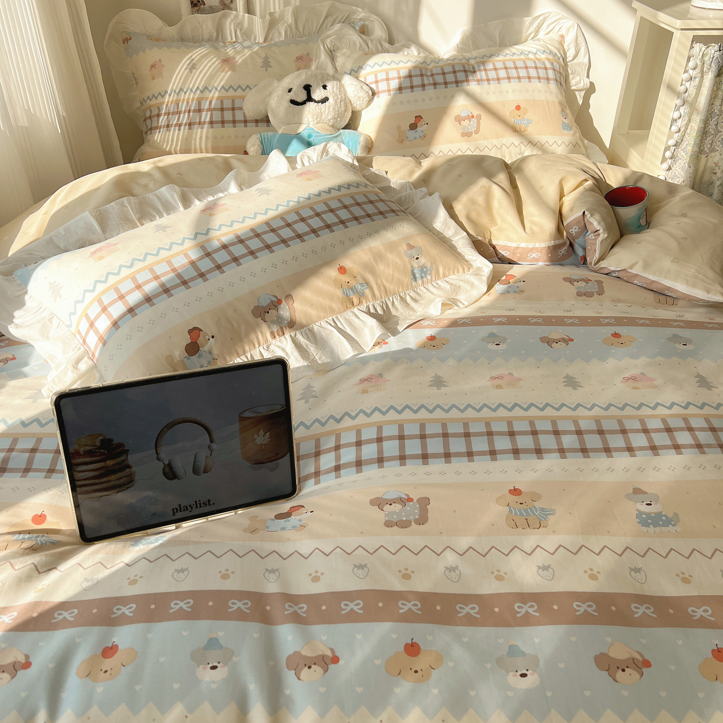 商品名称:六巷胡同 2026春夏新款韩系花边款卡通40支13070全棉四件套(第二系列)-风格二 花边费尔岛狗狗