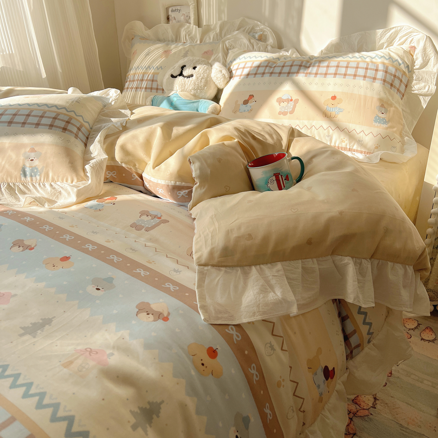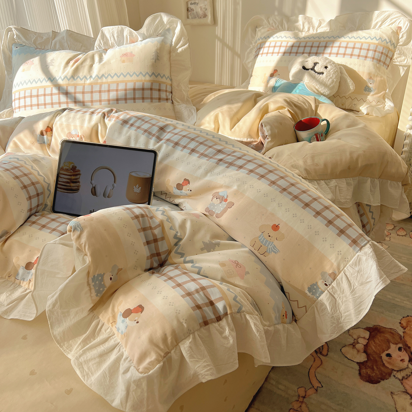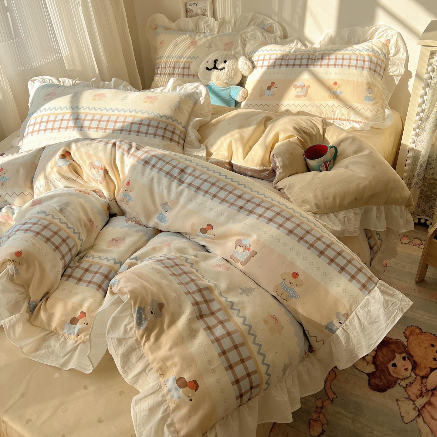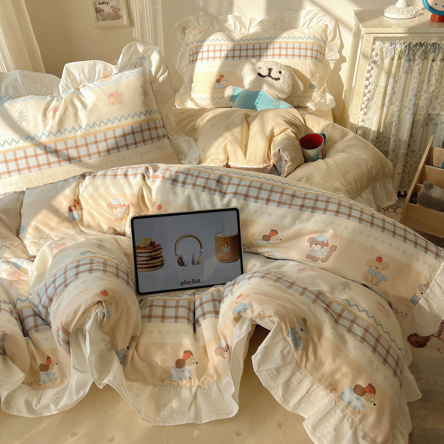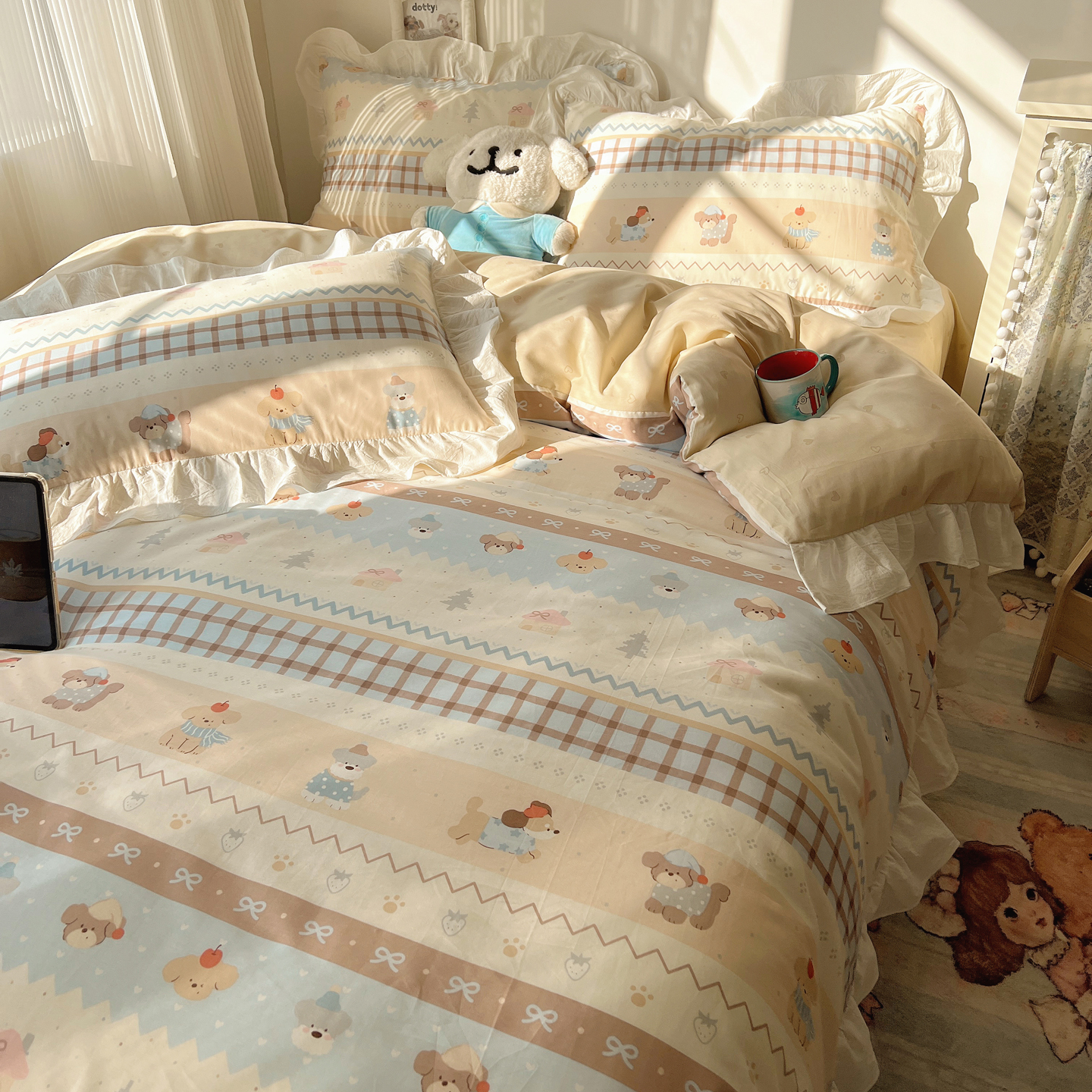 商品名称:六巷胡同 2026春夏新款韩系花边款卡通40支13070全棉四件套(第二系列)-风格二 花边费尔岛狗狗