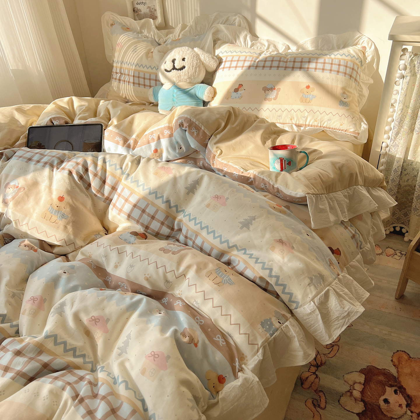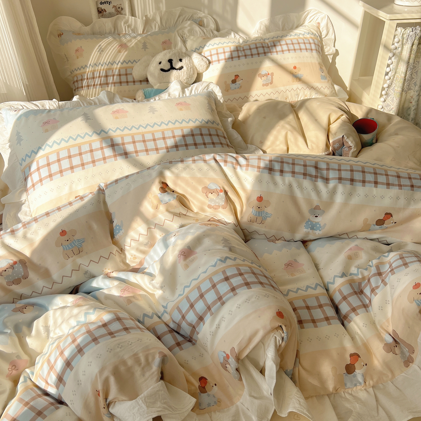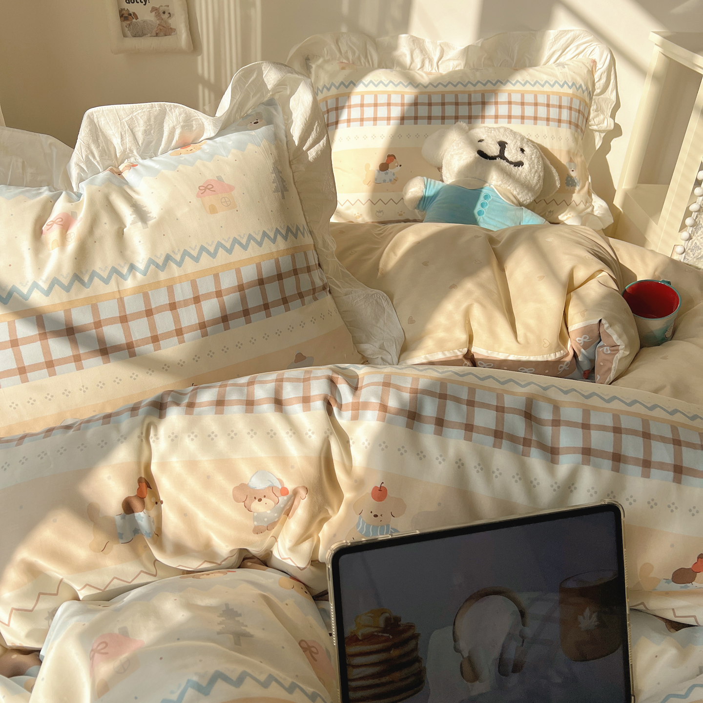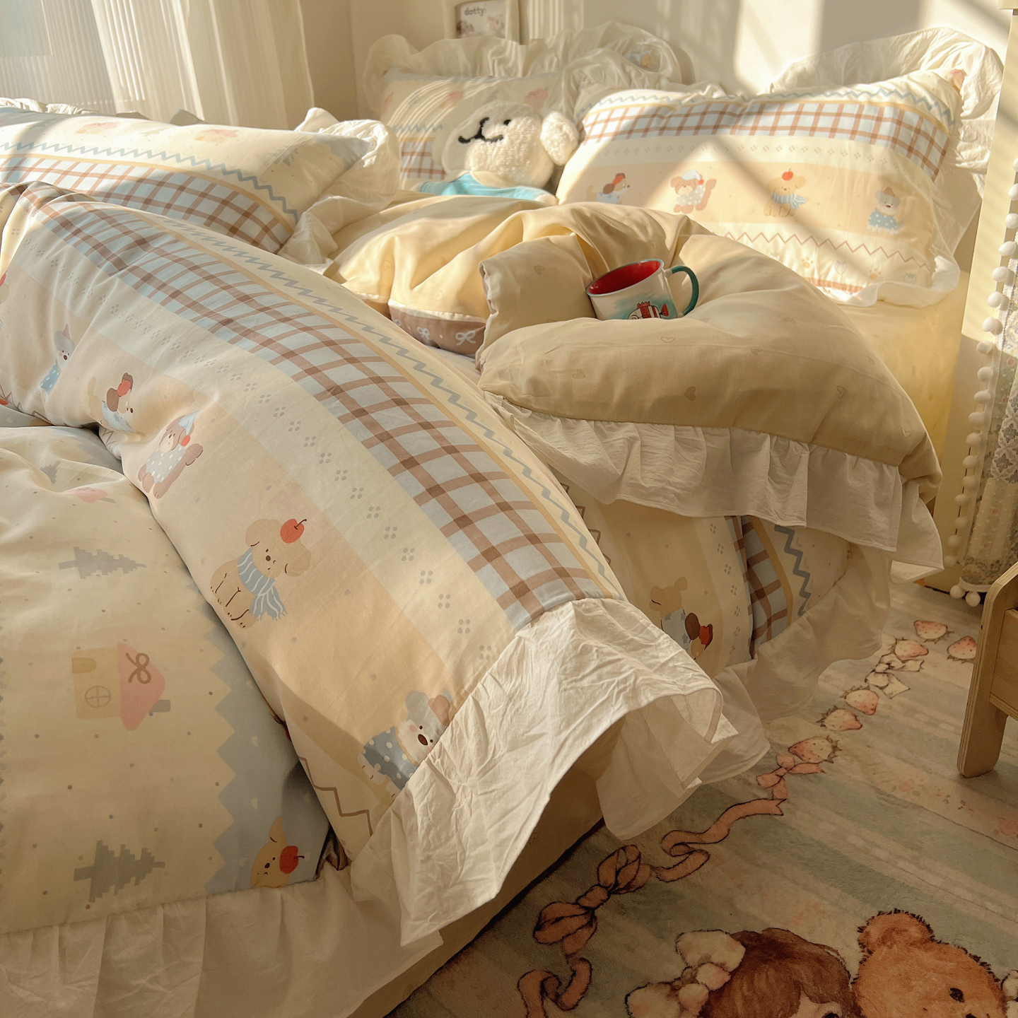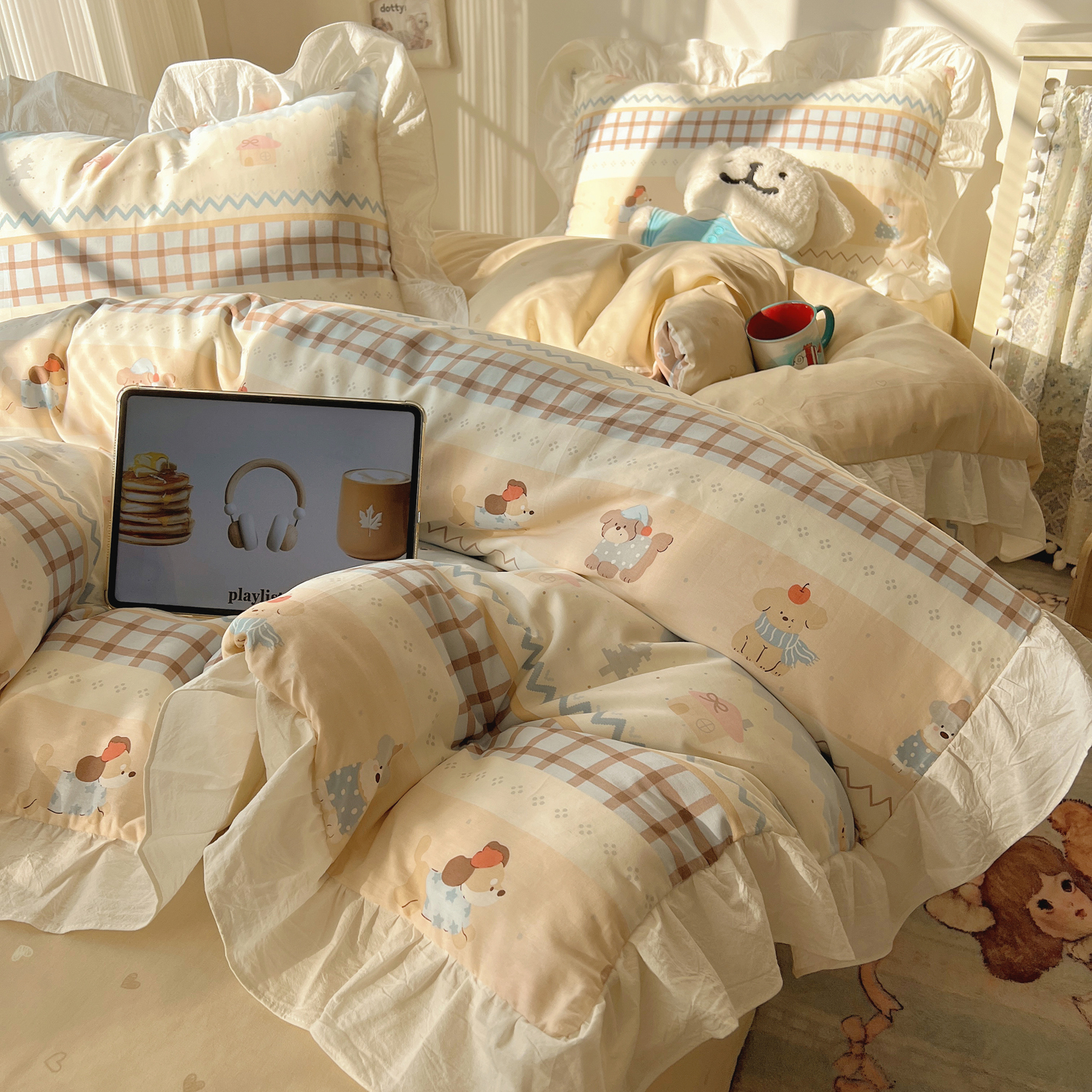 商品名称:六巷胡同 2026春夏新款韩系花边款卡通40支13070全棉四件套(第二系列)-风格二 花边费尔岛狗狗
