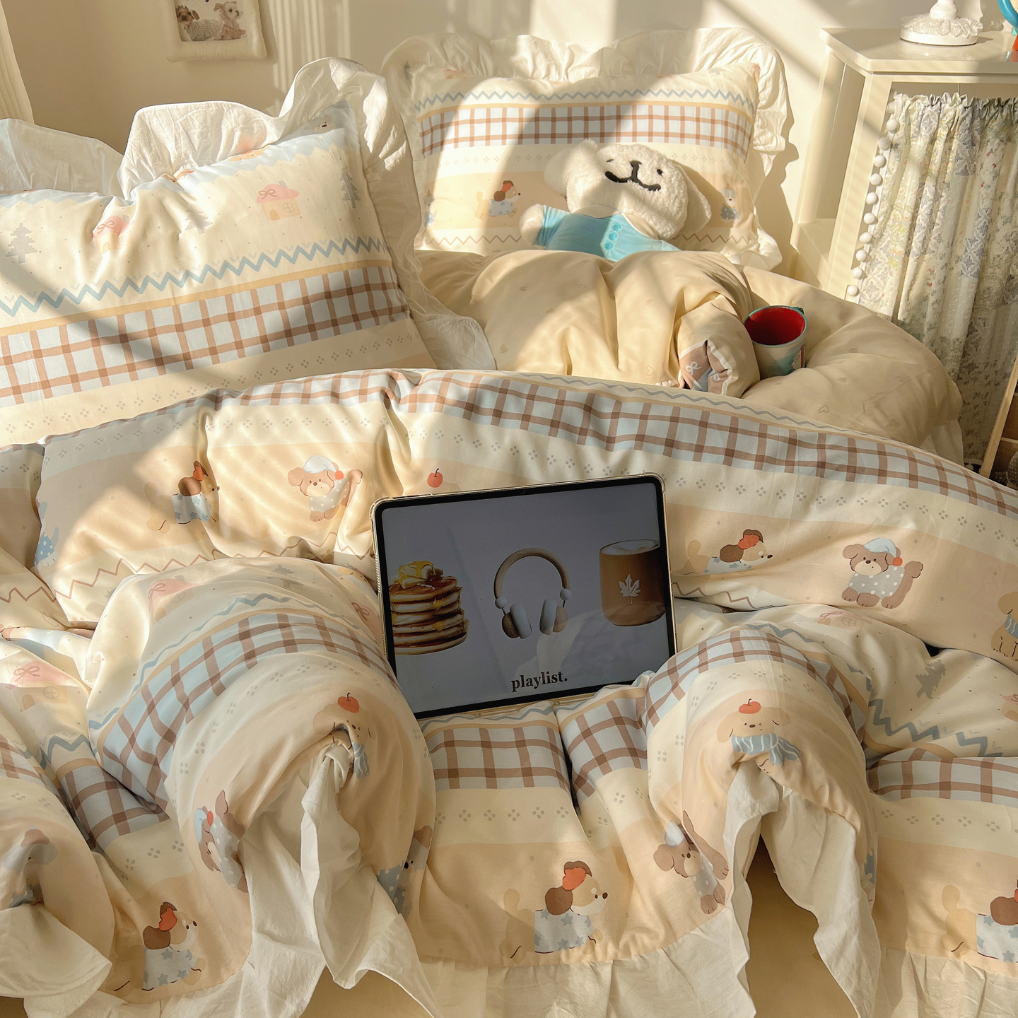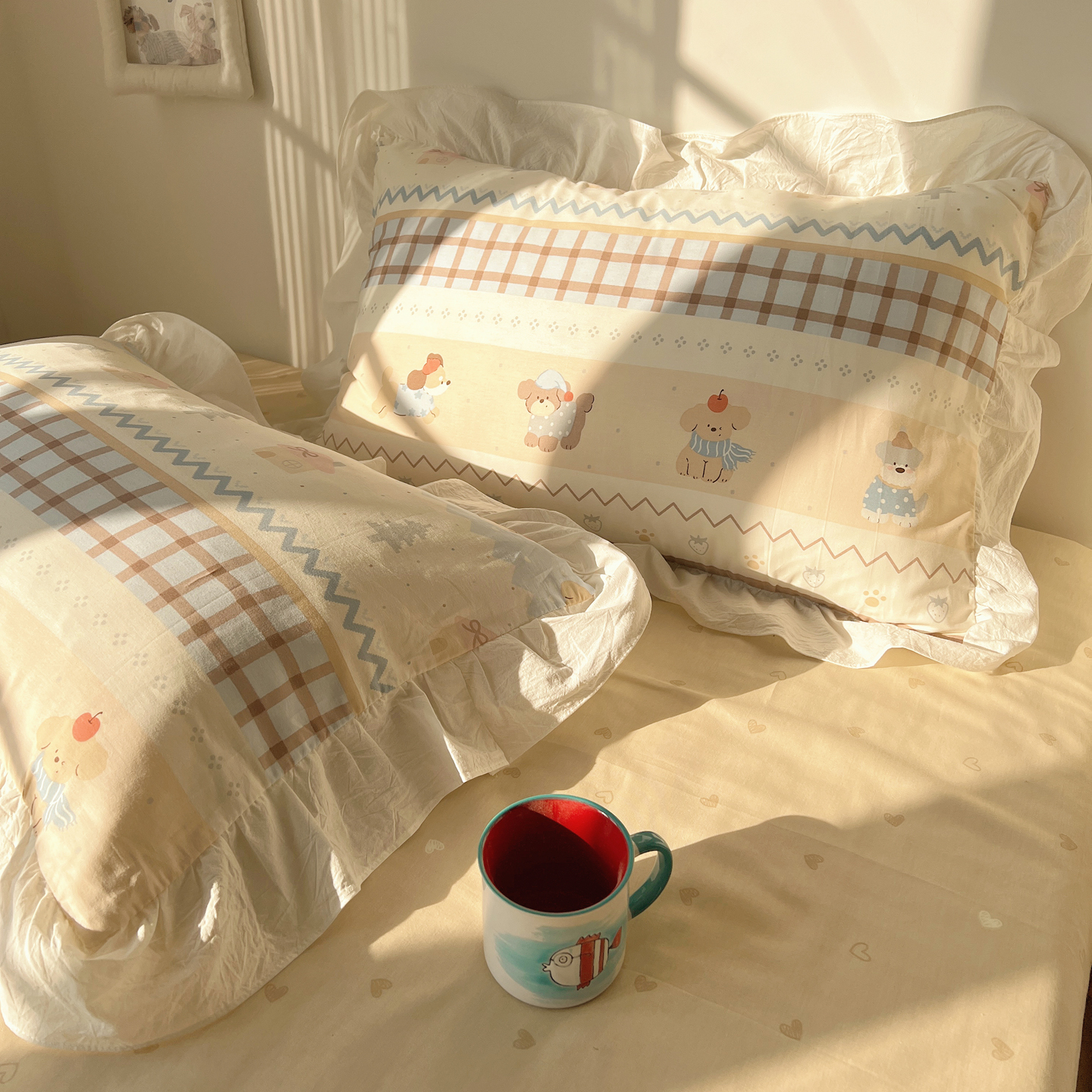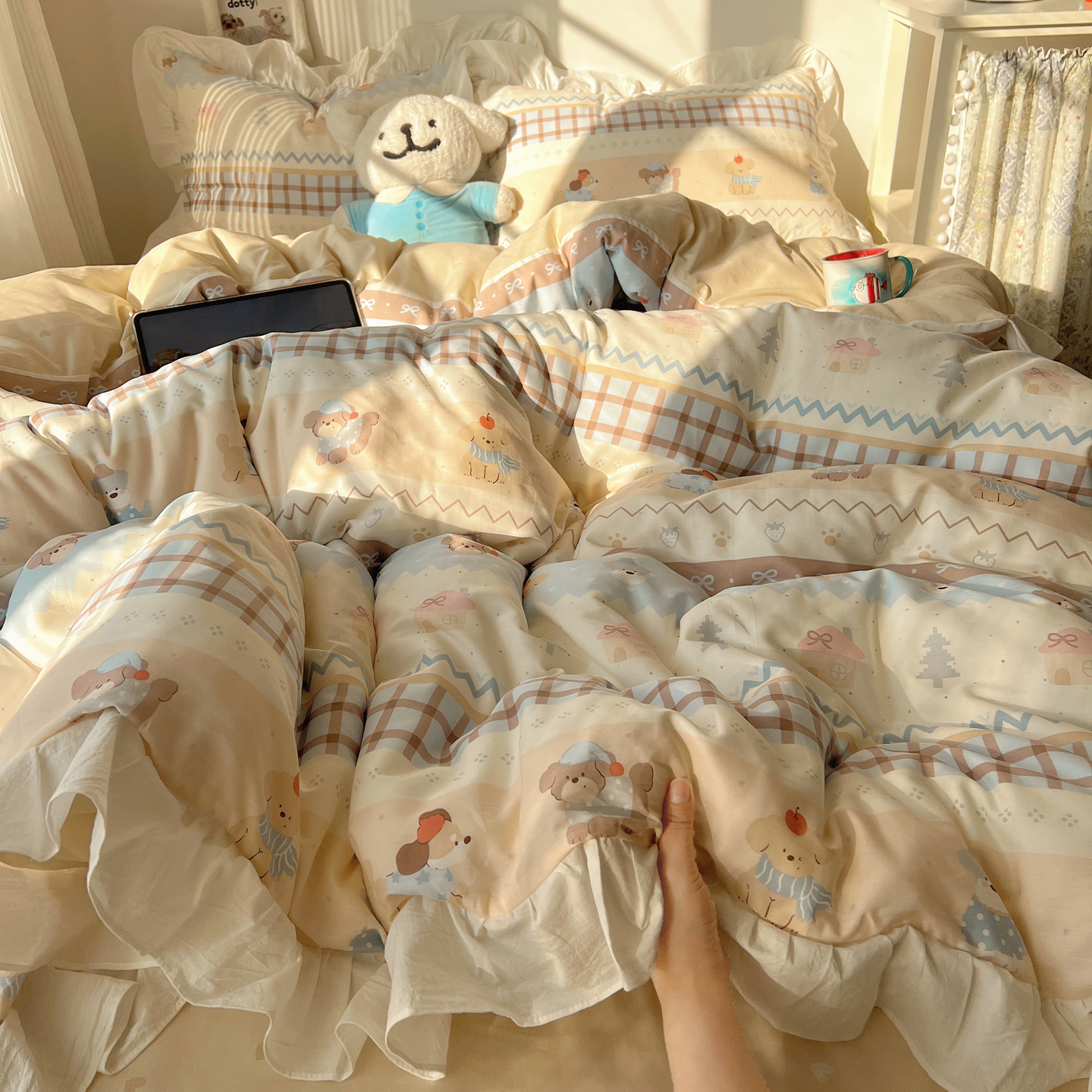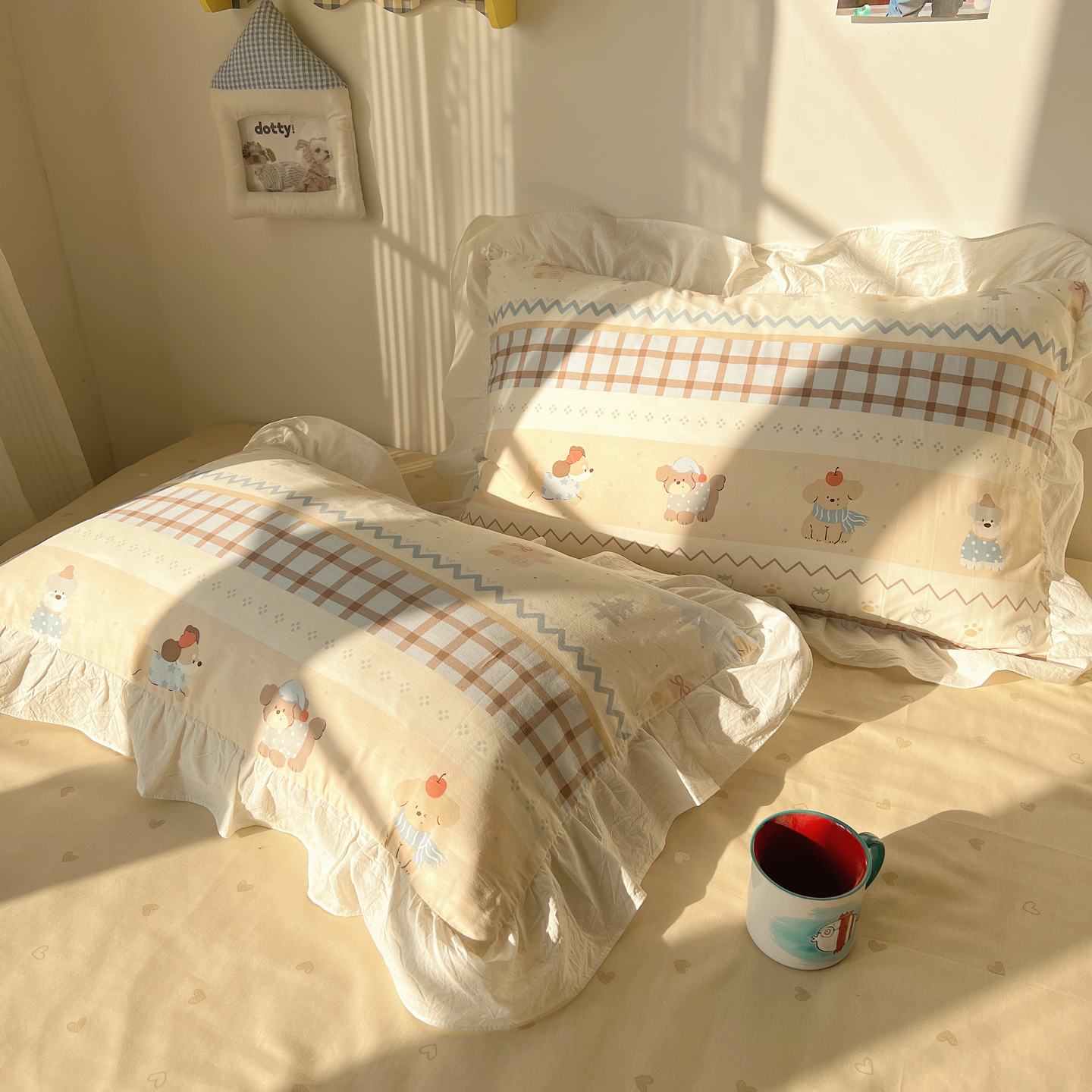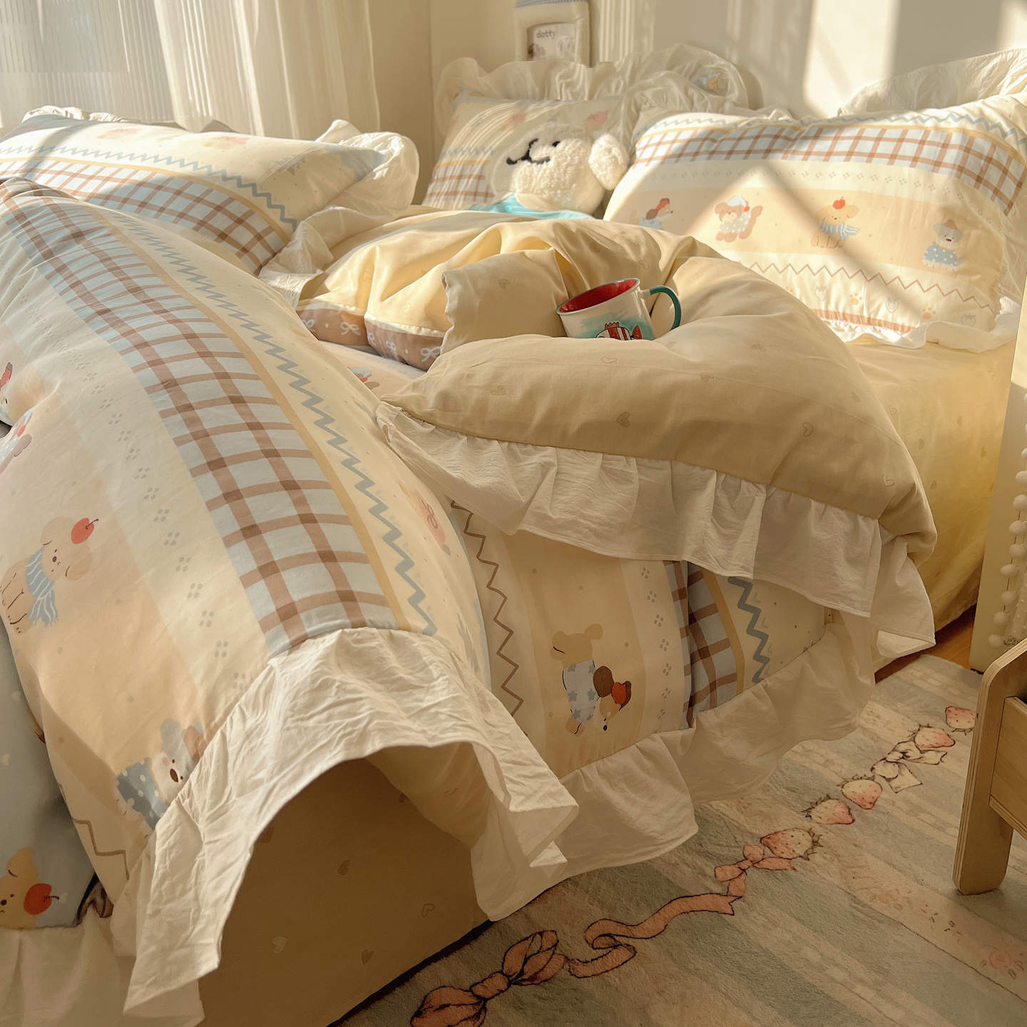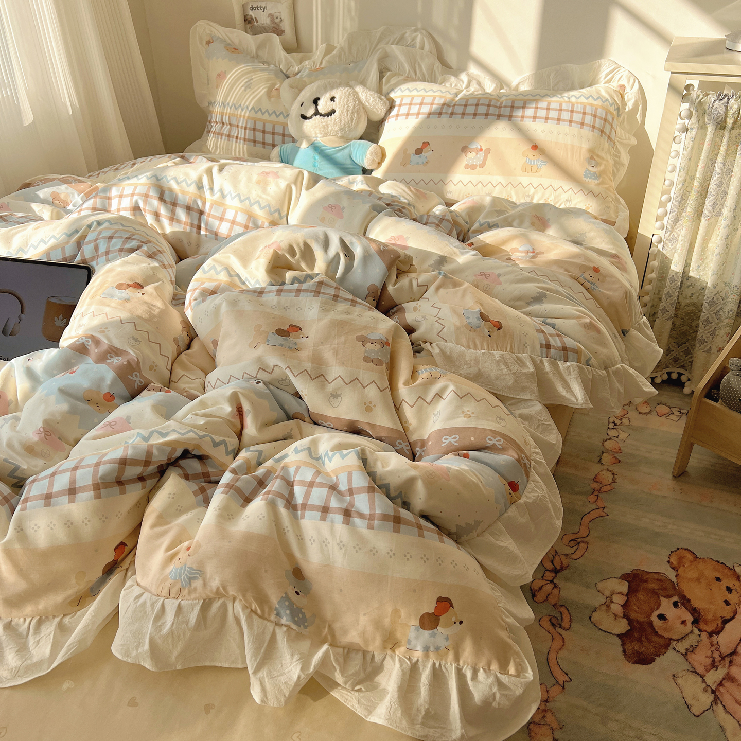 商品名称:六巷胡同 2026春夏新款韩系花边款卡通40支13070全棉四件套(第二系列)-风格二 花边费尔岛狗狗