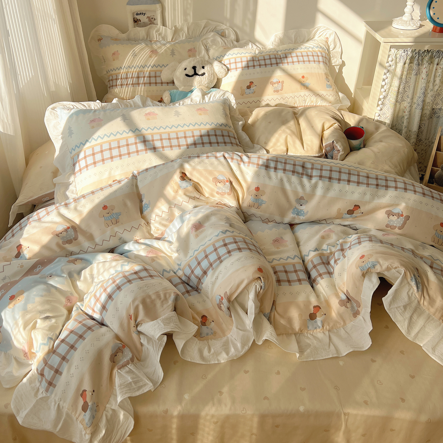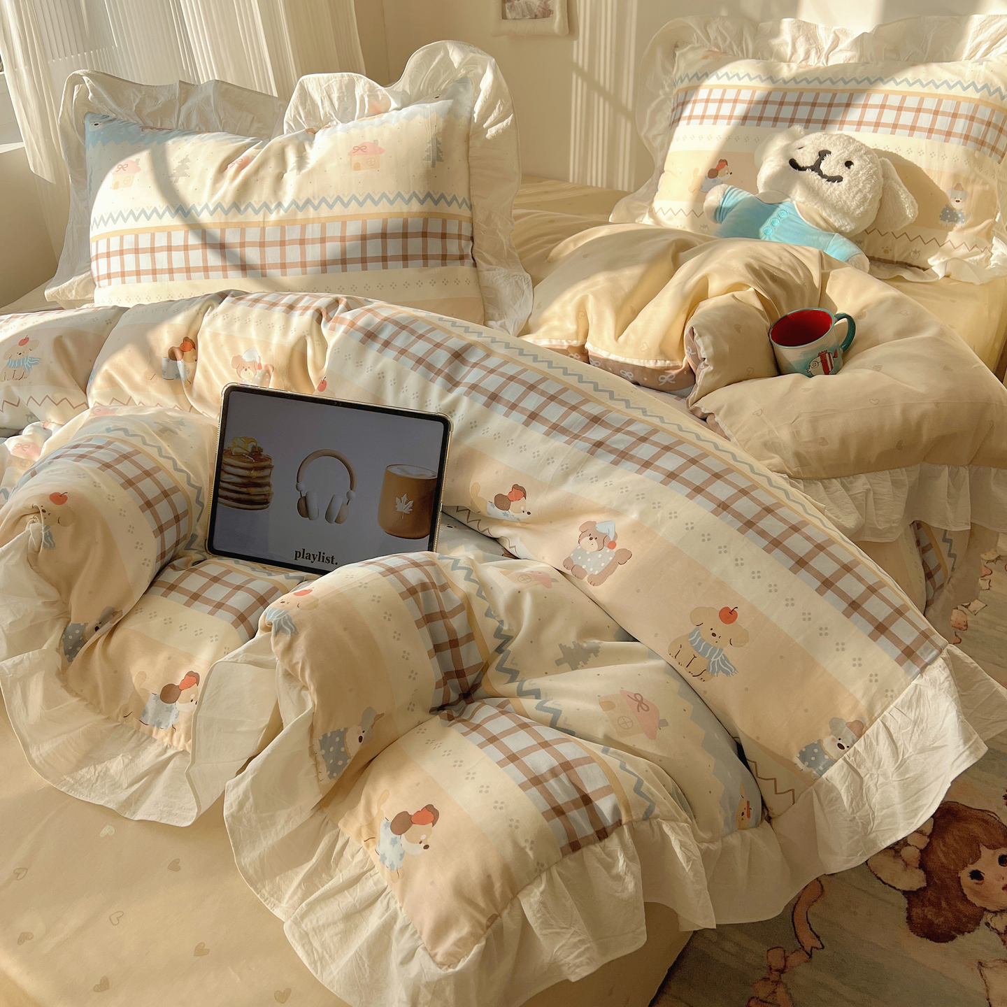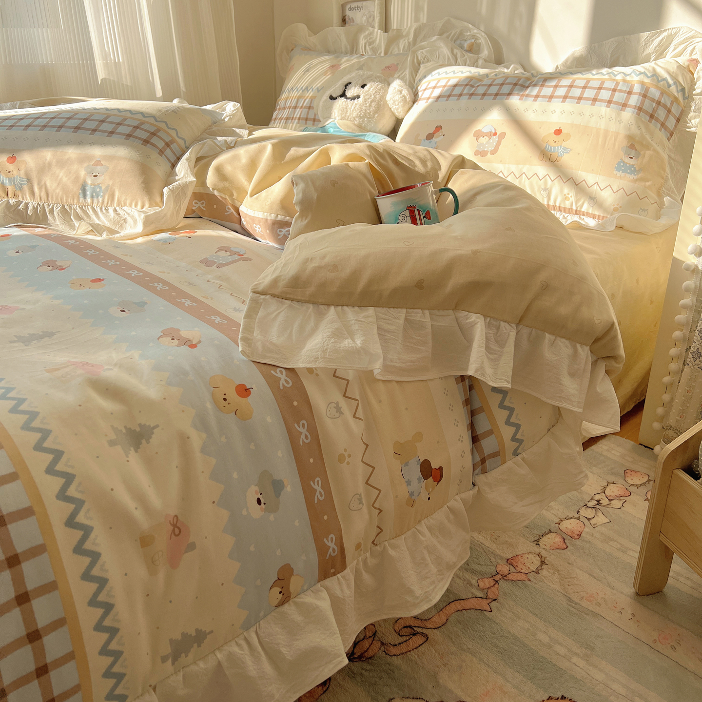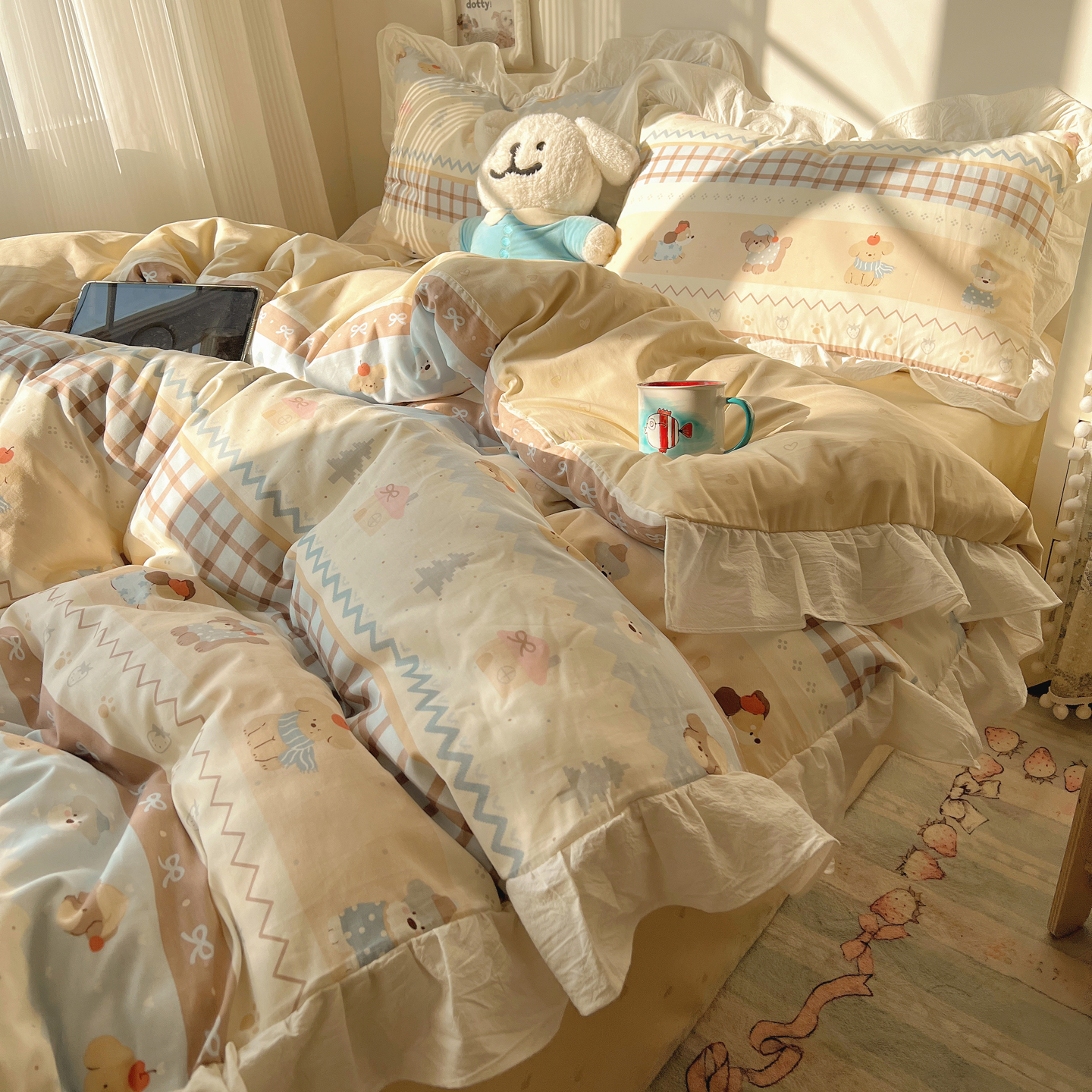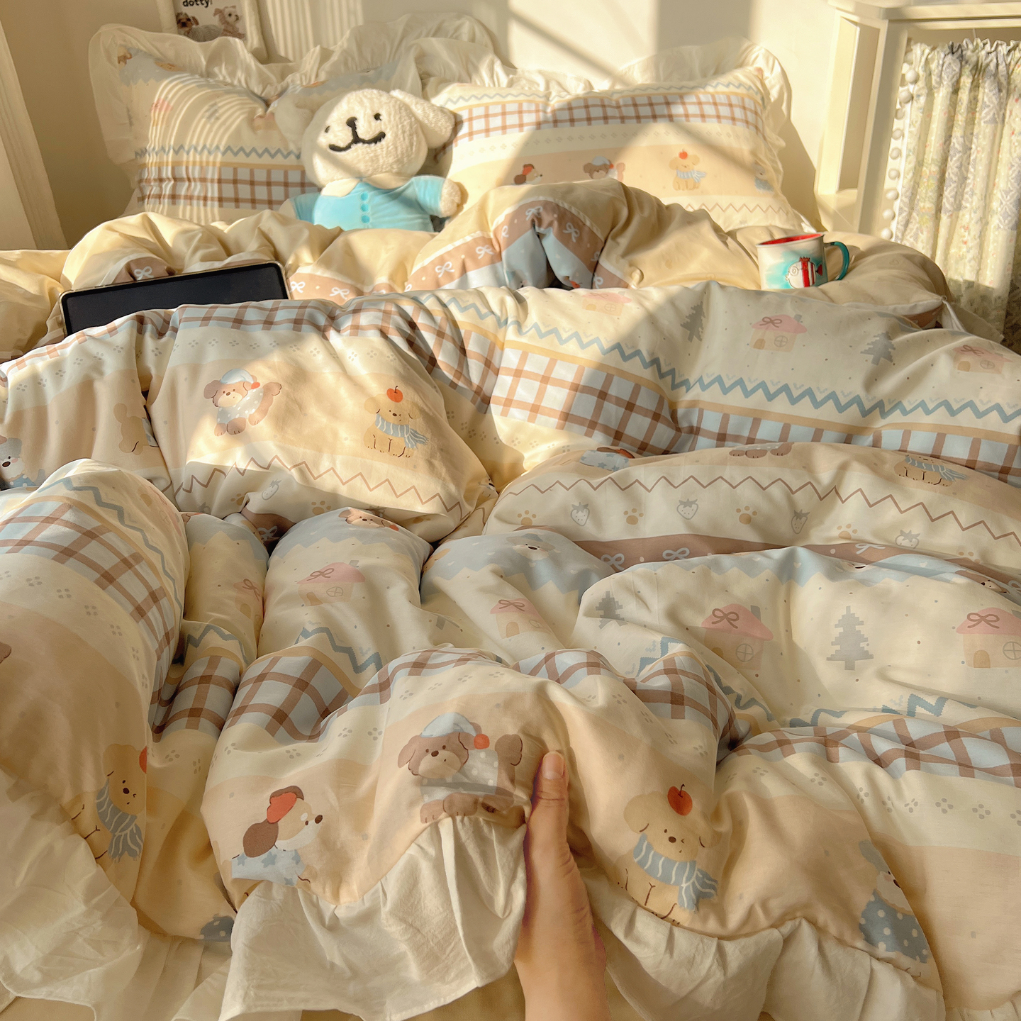 商品名称:六巷胡同 2026春夏新款韩系花边款卡通40支13070全棉四件套(第二系列)-风格二 花边费尔岛狗狗