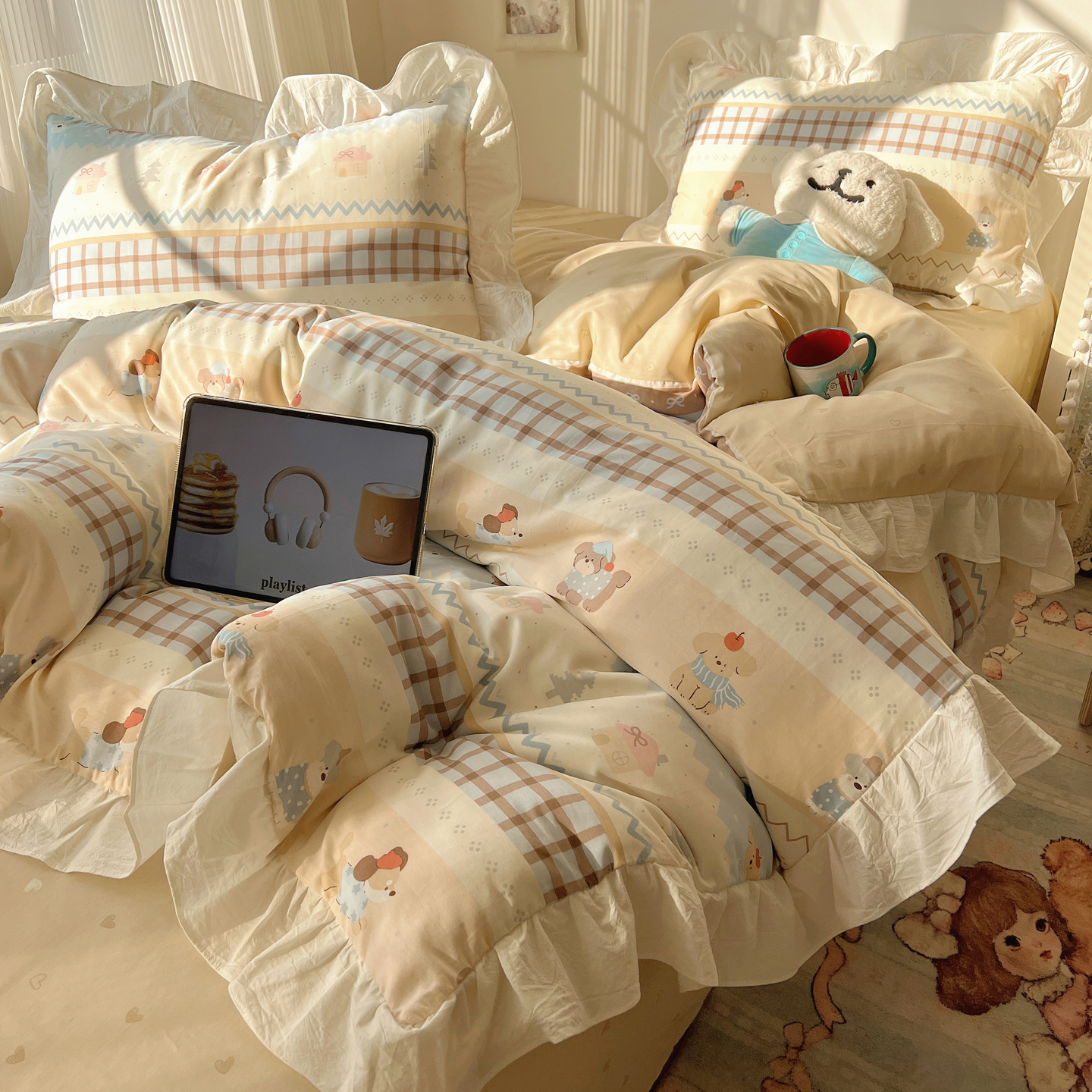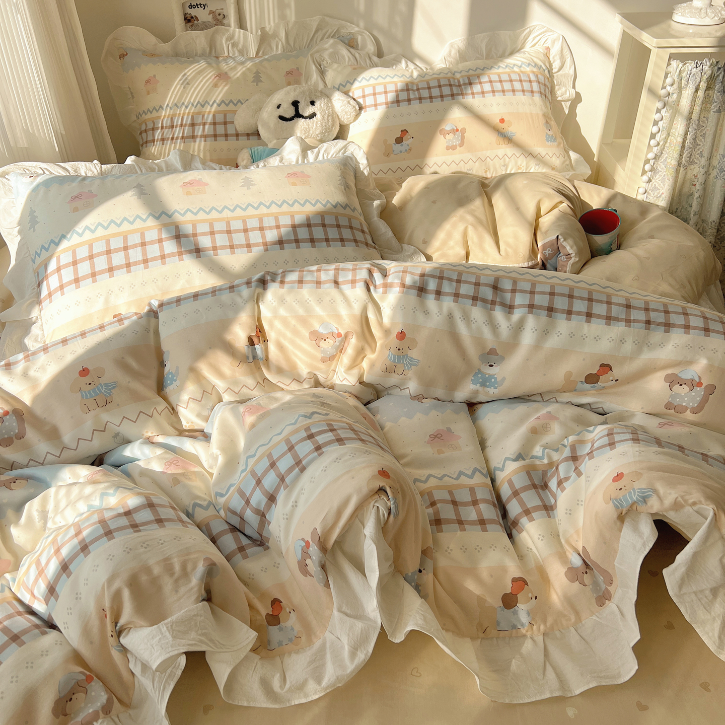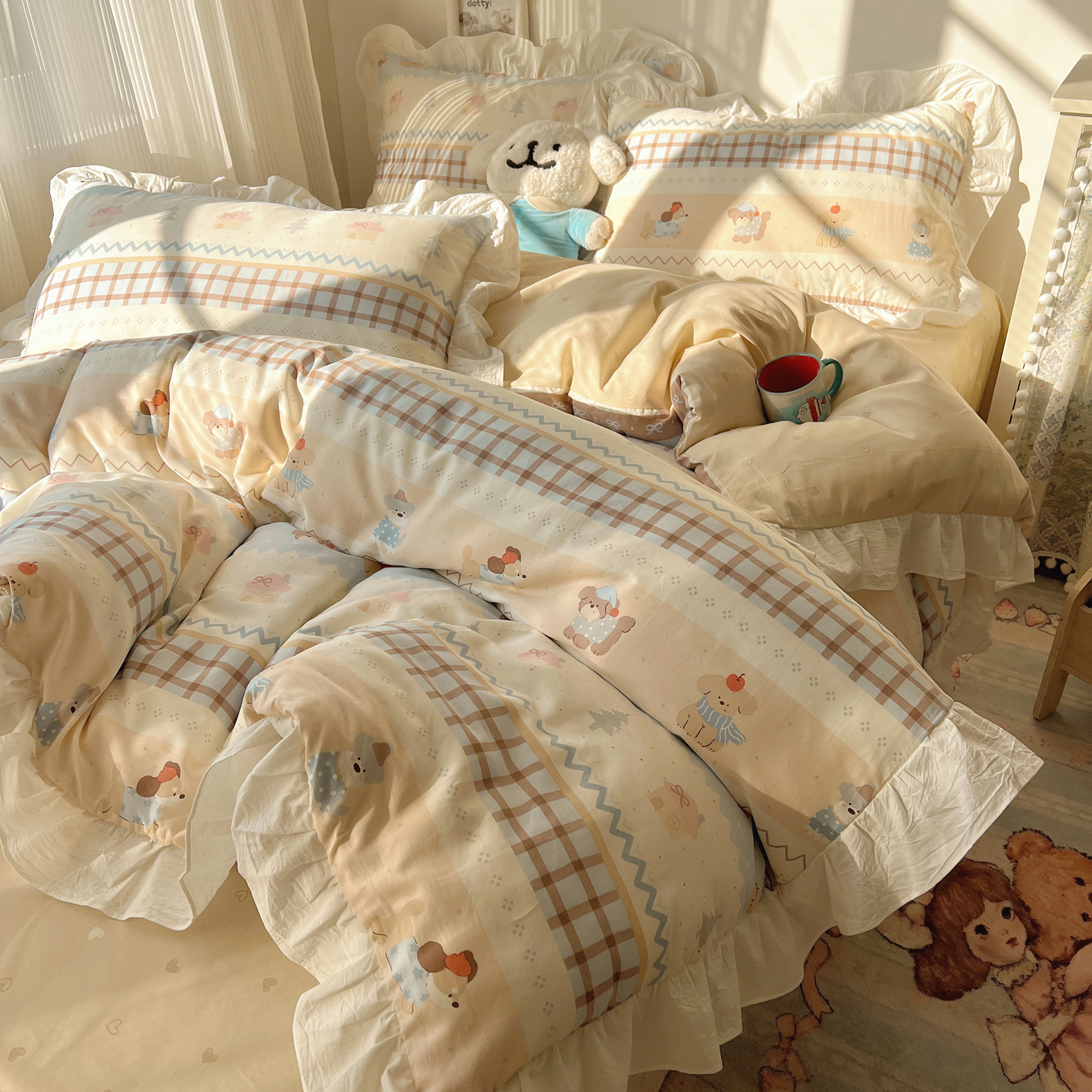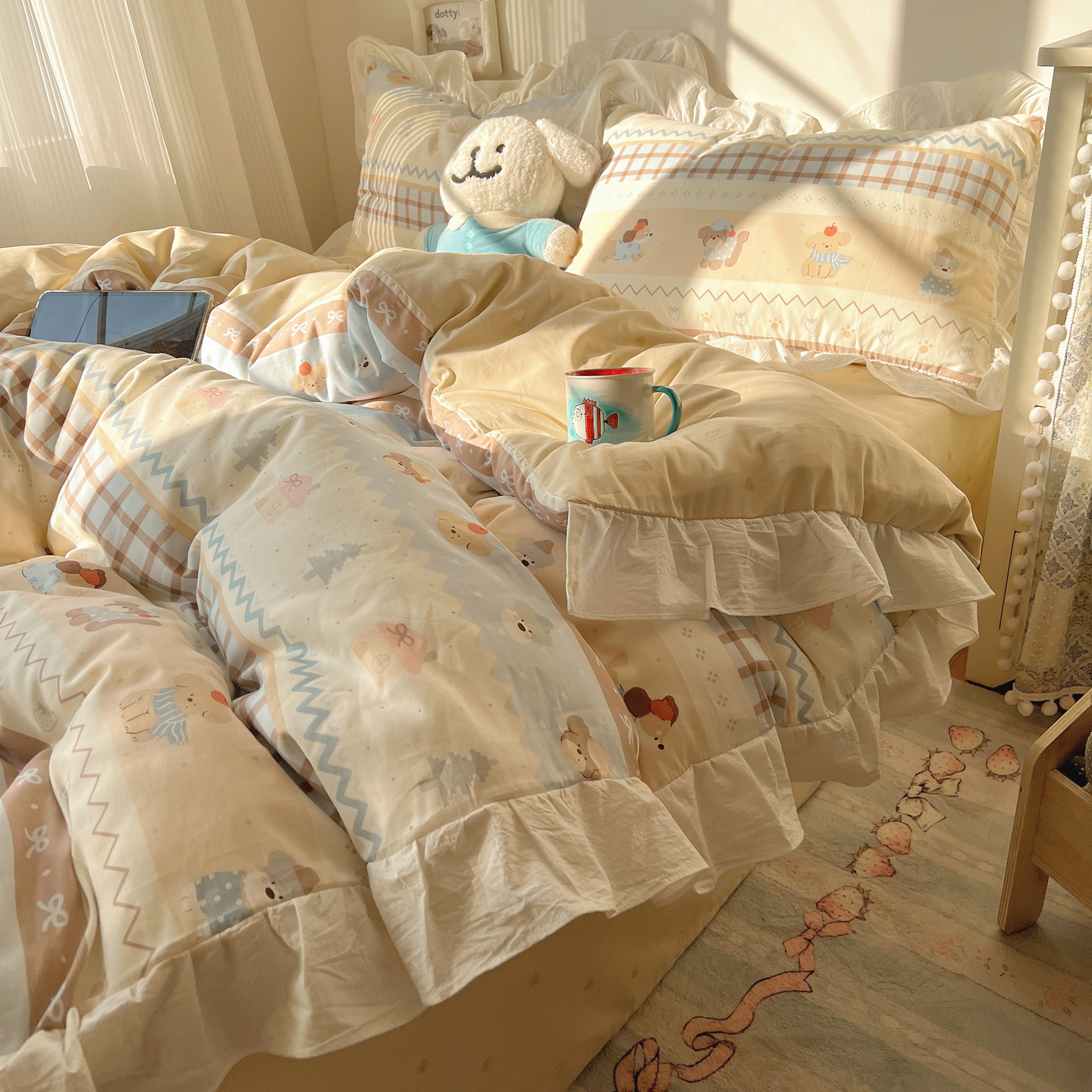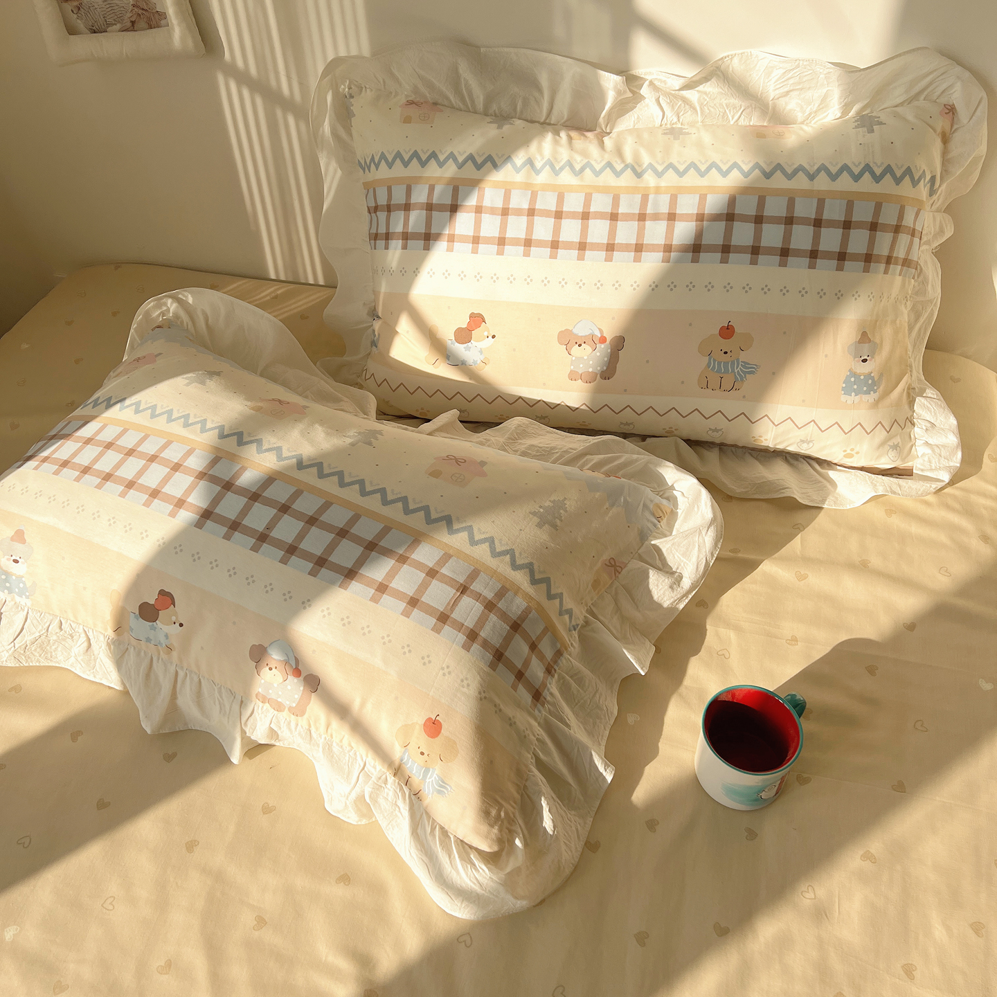 商品名称:六巷胡同 2026春夏新款韩系花边款卡通40支13070全棉四件套(第二系列)-风格二 花边费尔岛狗狗