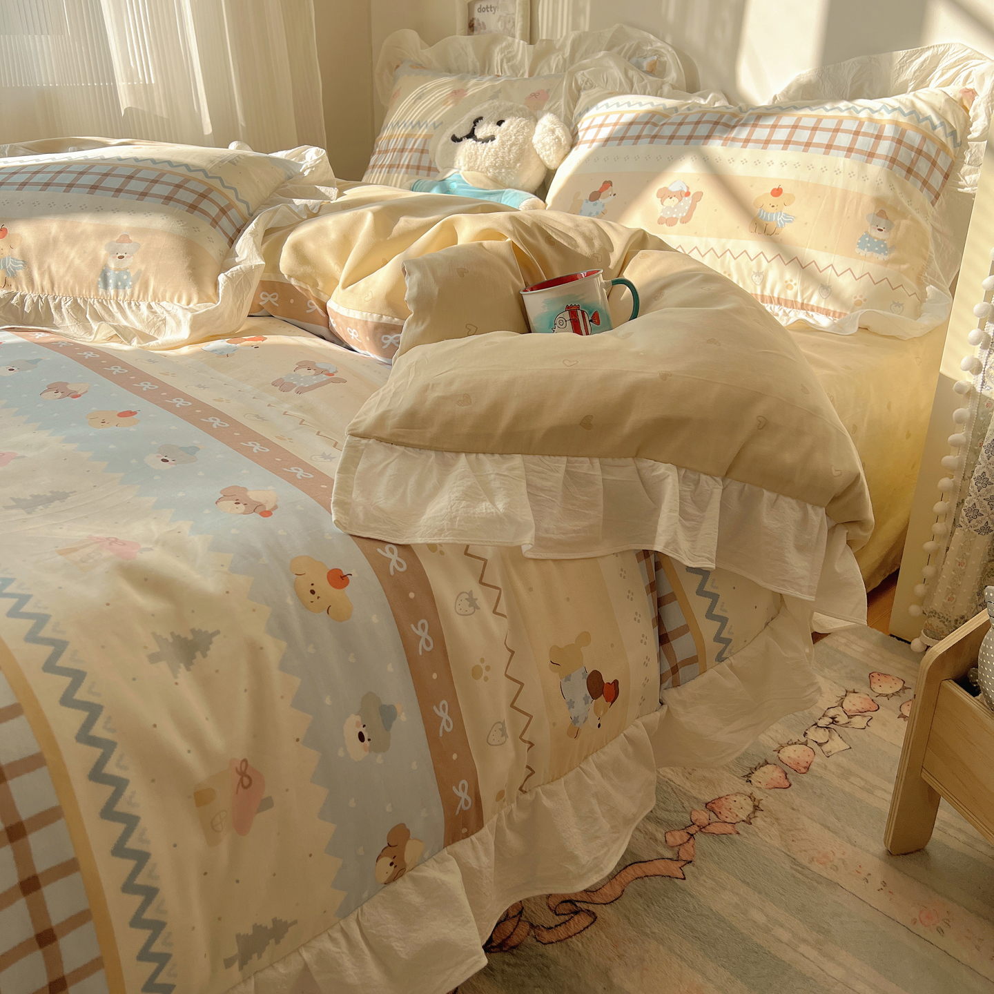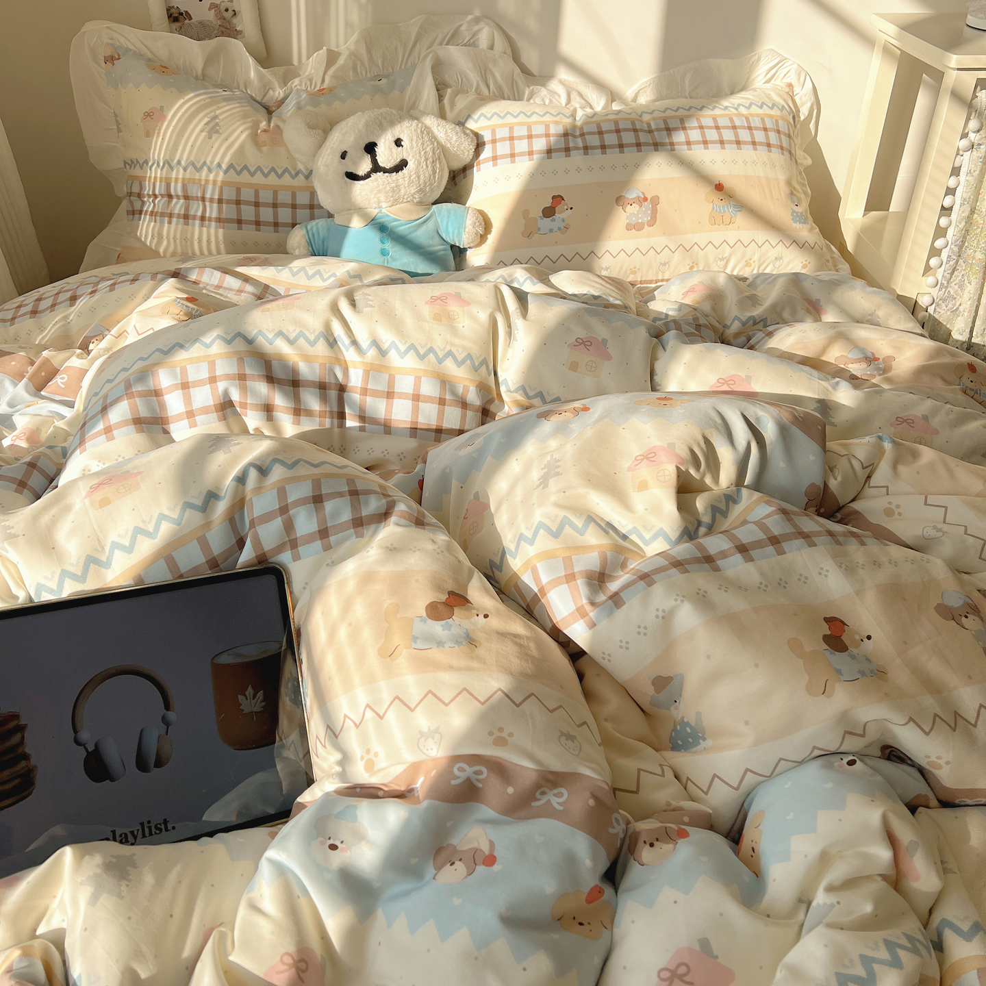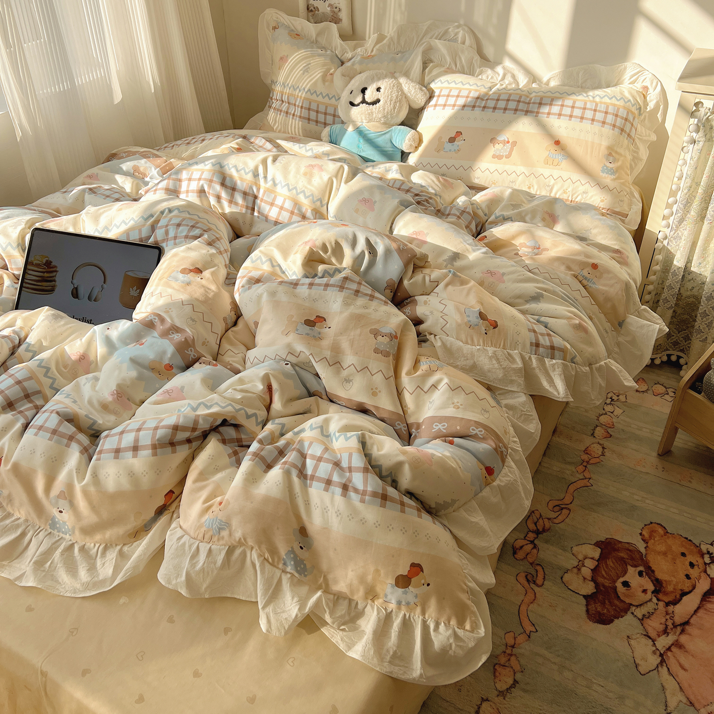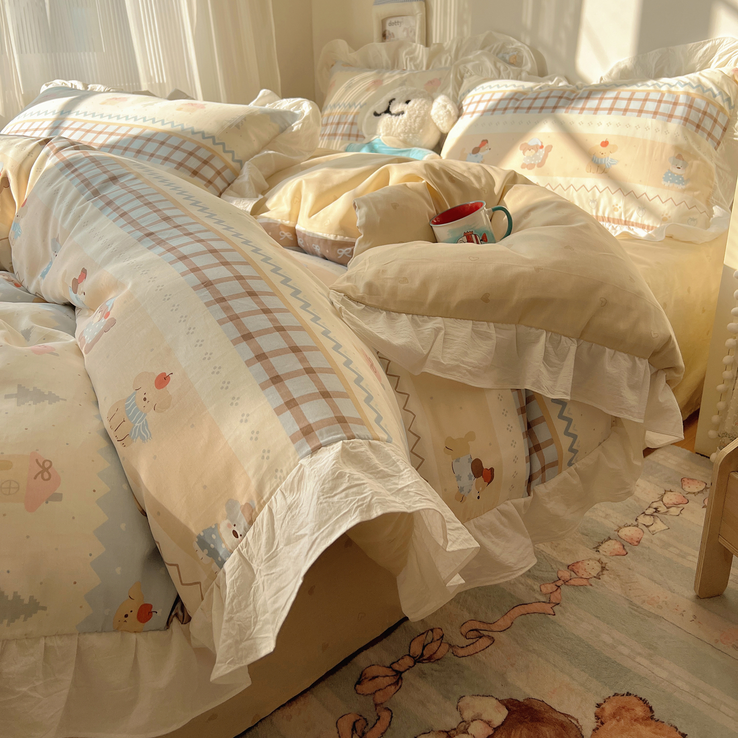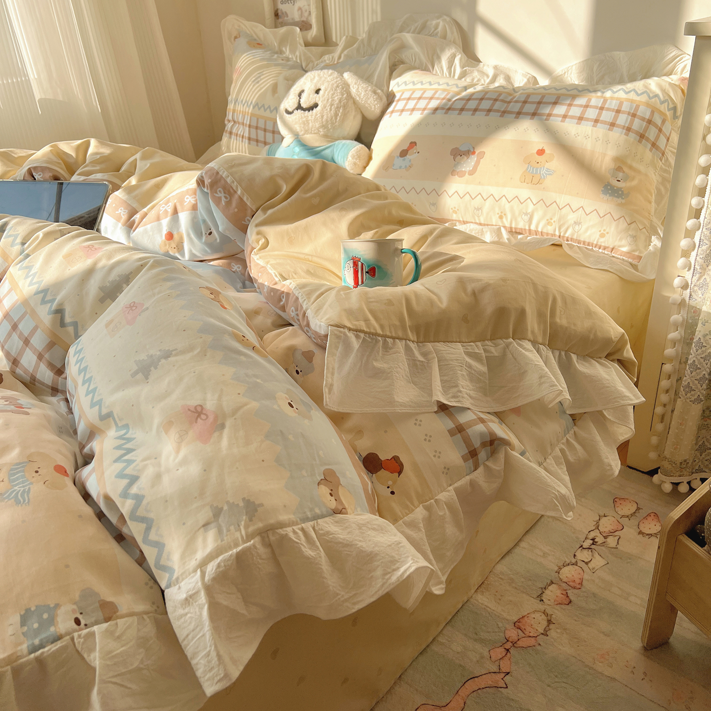 商品名称:六巷胡同 2026春夏新款韩系花边款卡通40支13070全棉四件套(第二系列)-风格二 花边费尔岛狗狗