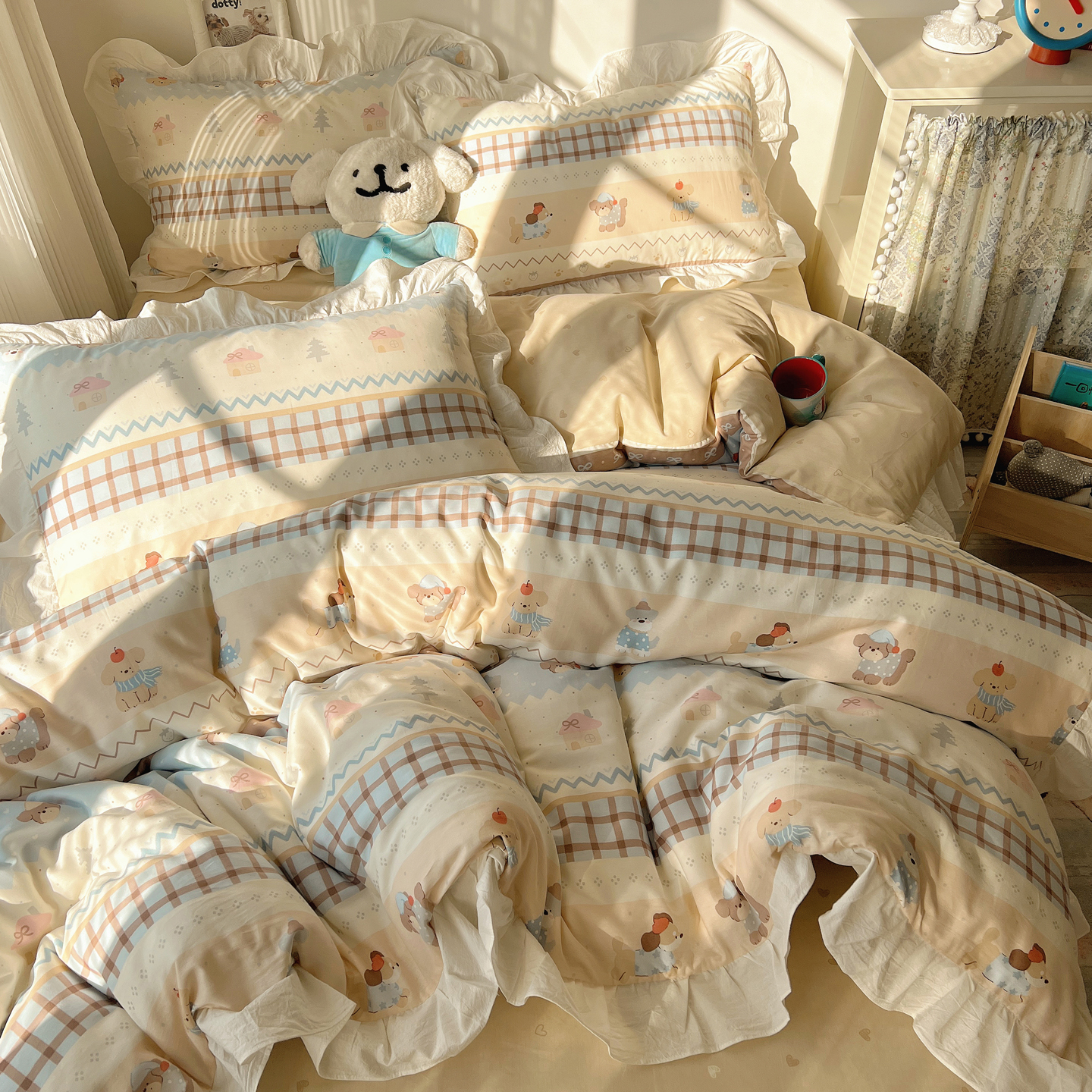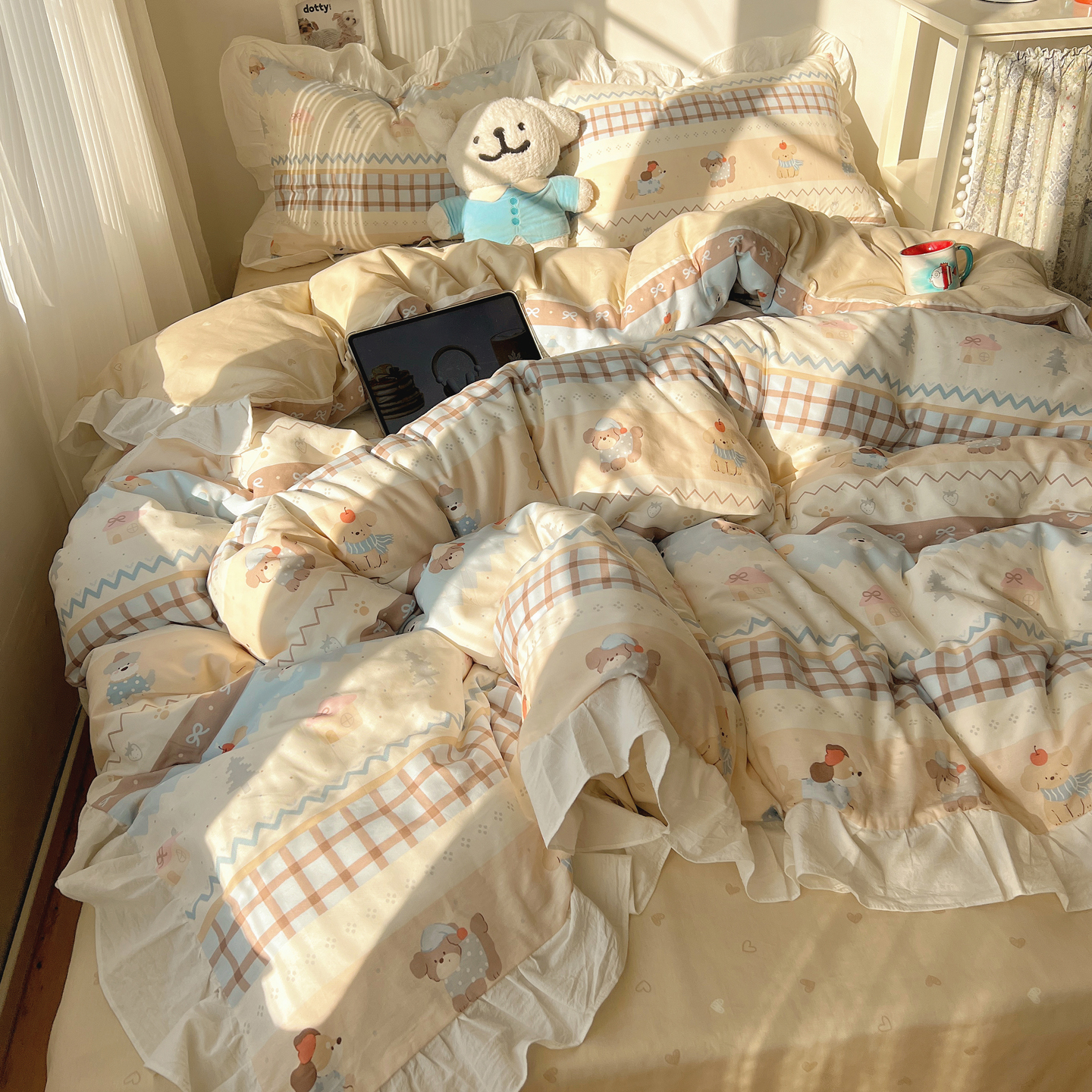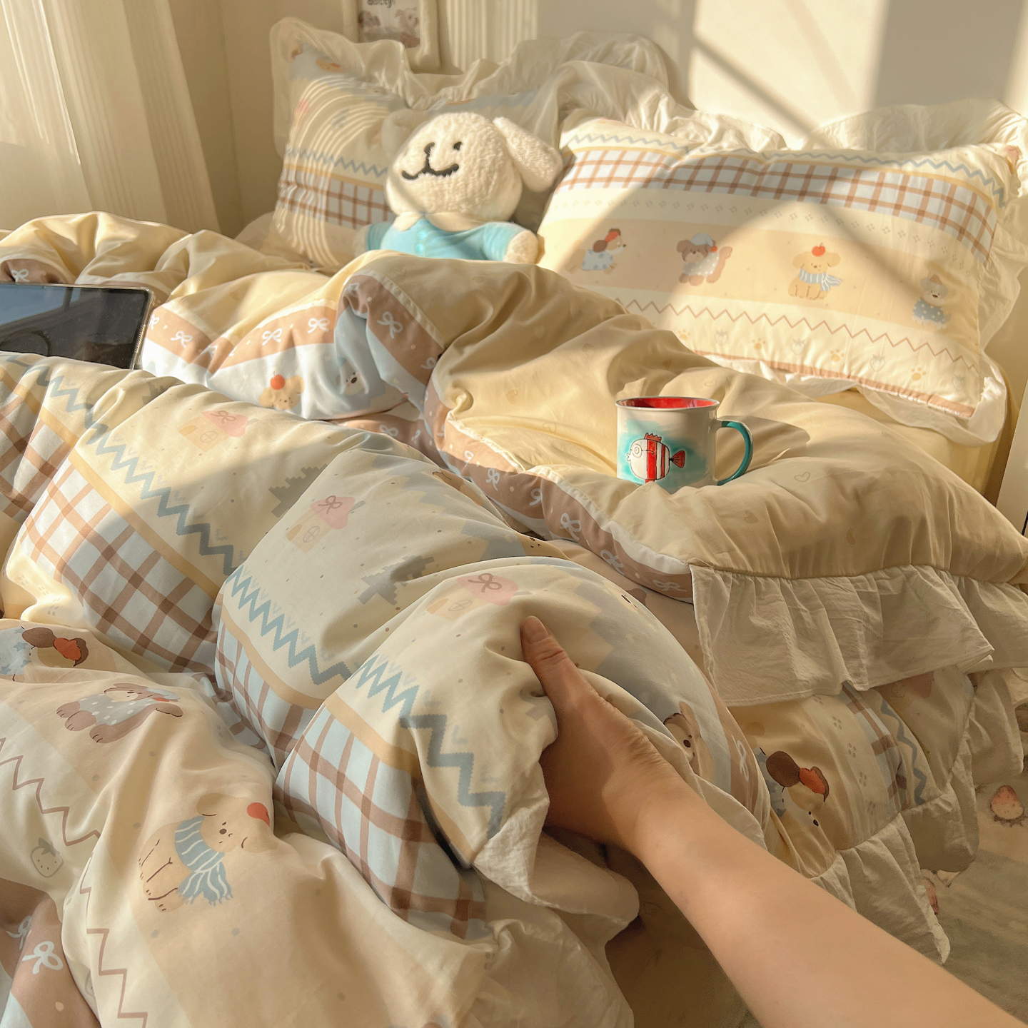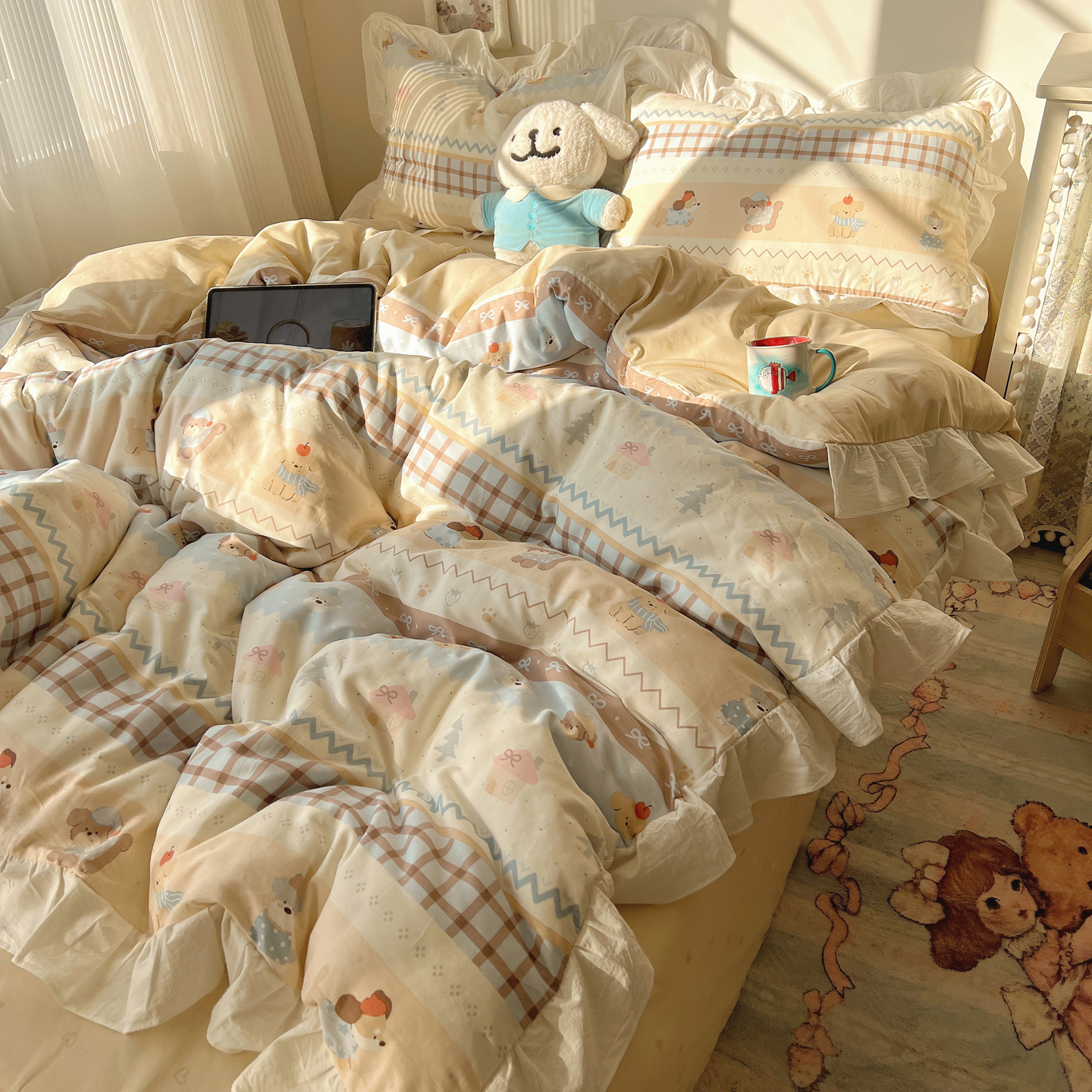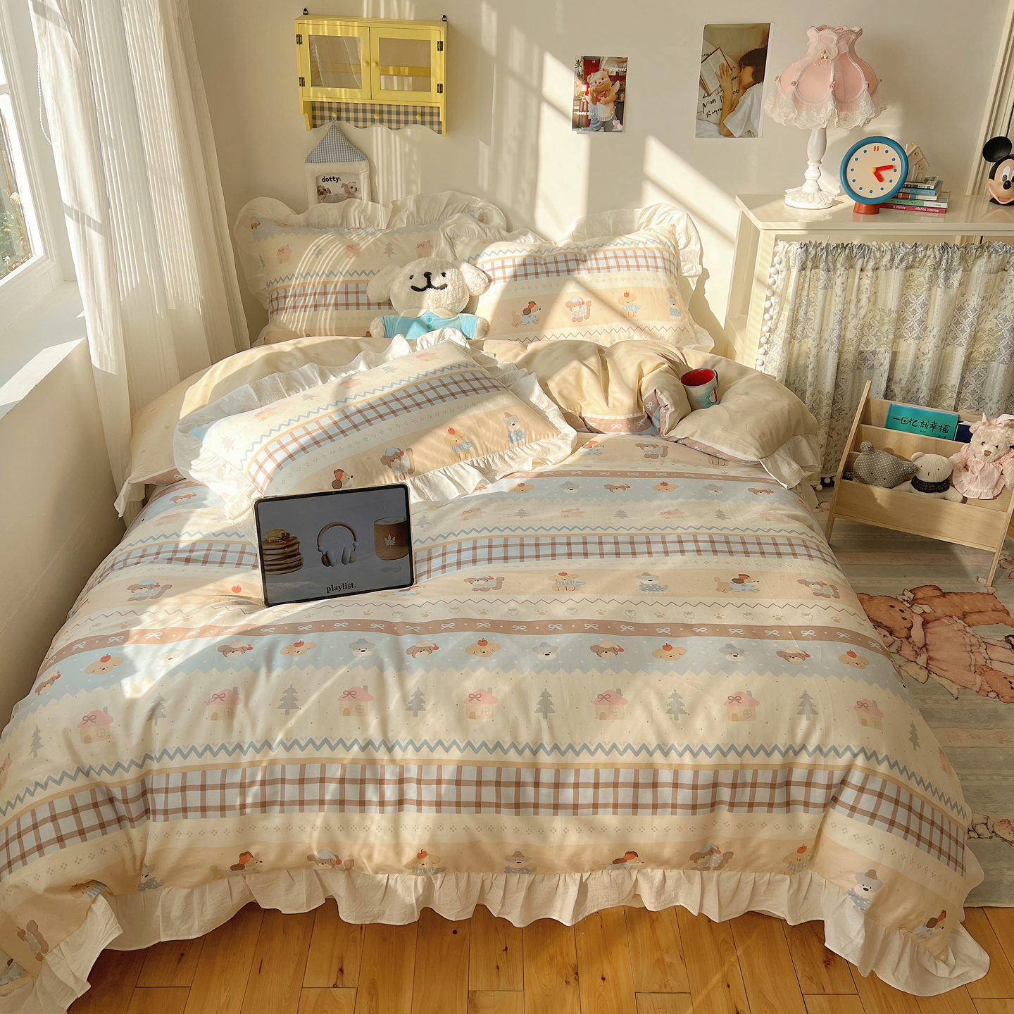 商品名称:六巷胡同 2026春夏新款韩系花边款卡通40支13070全棉四件套(第二系列)-风格二 花边费尔岛狗狗