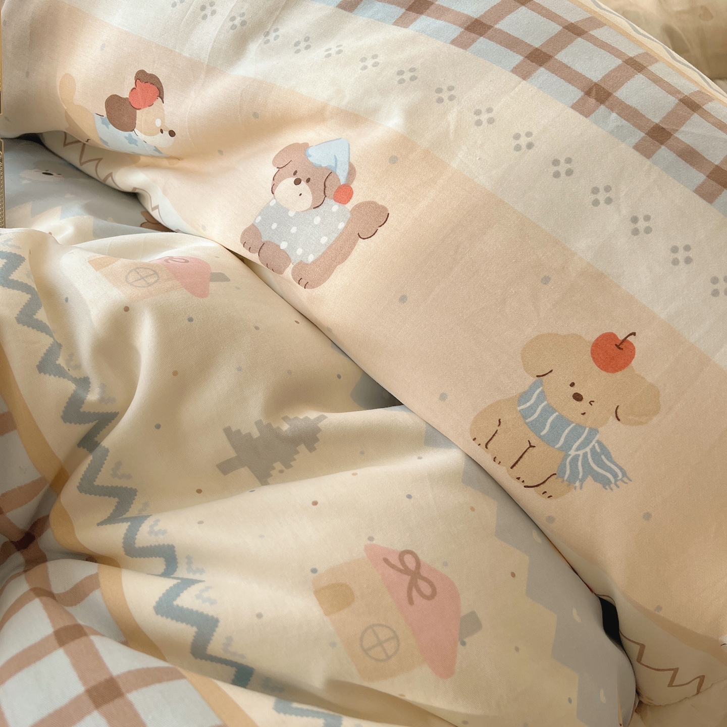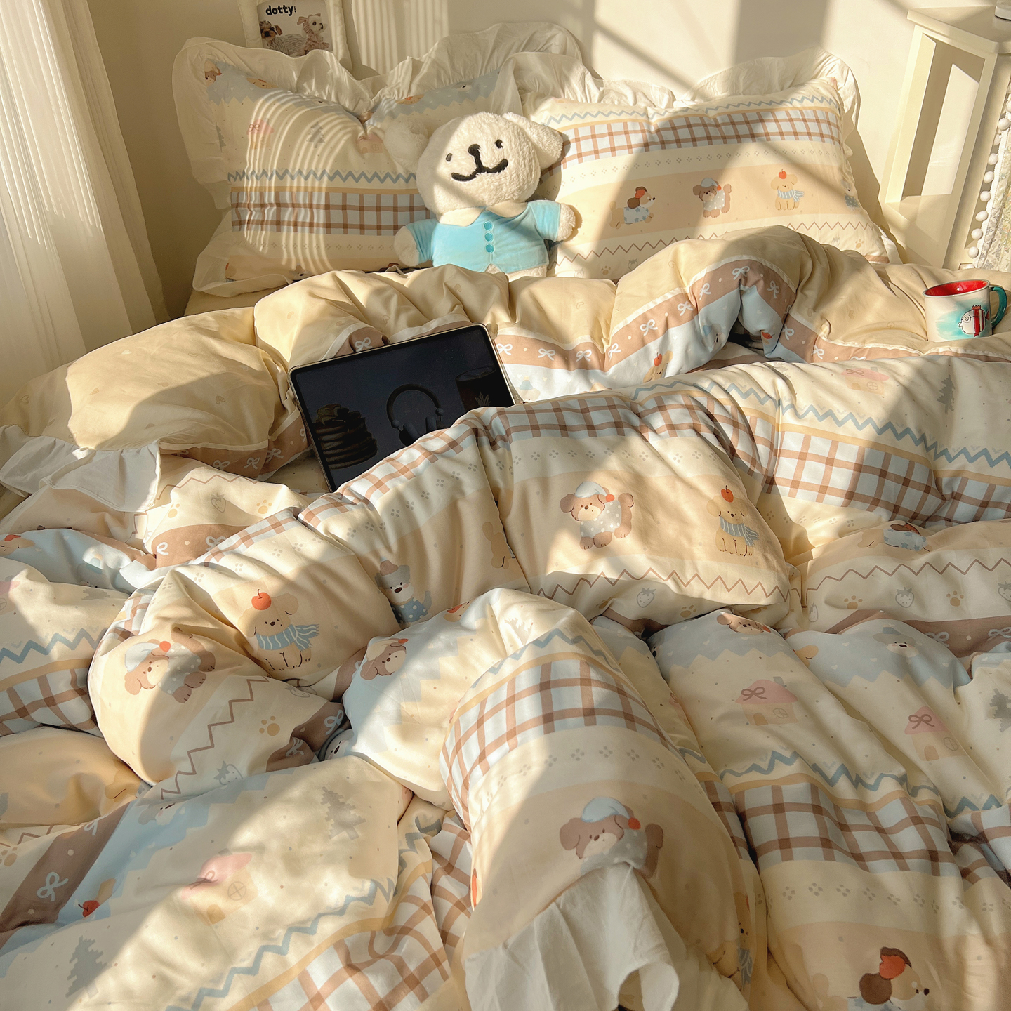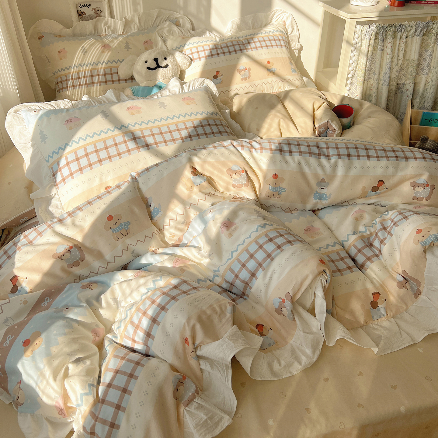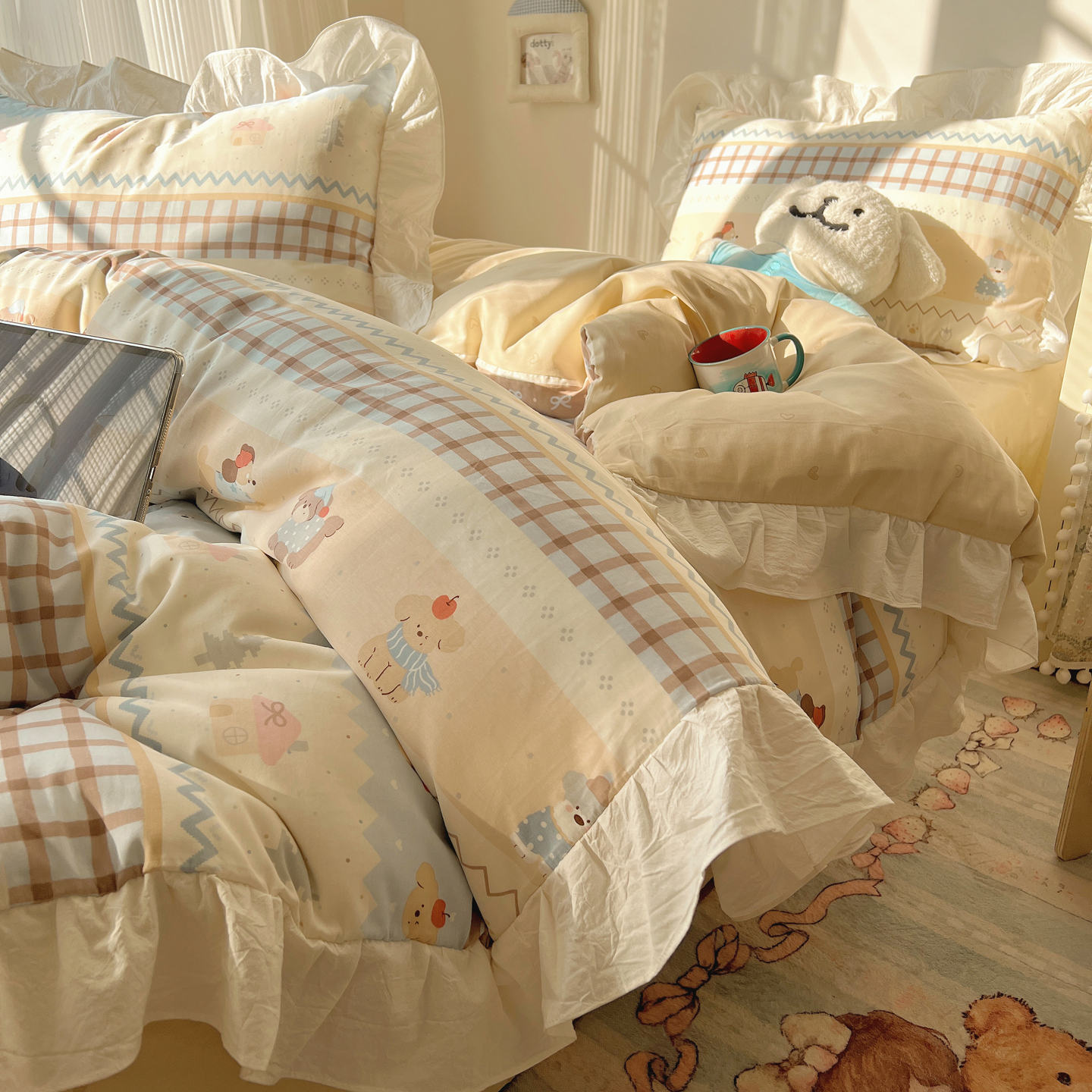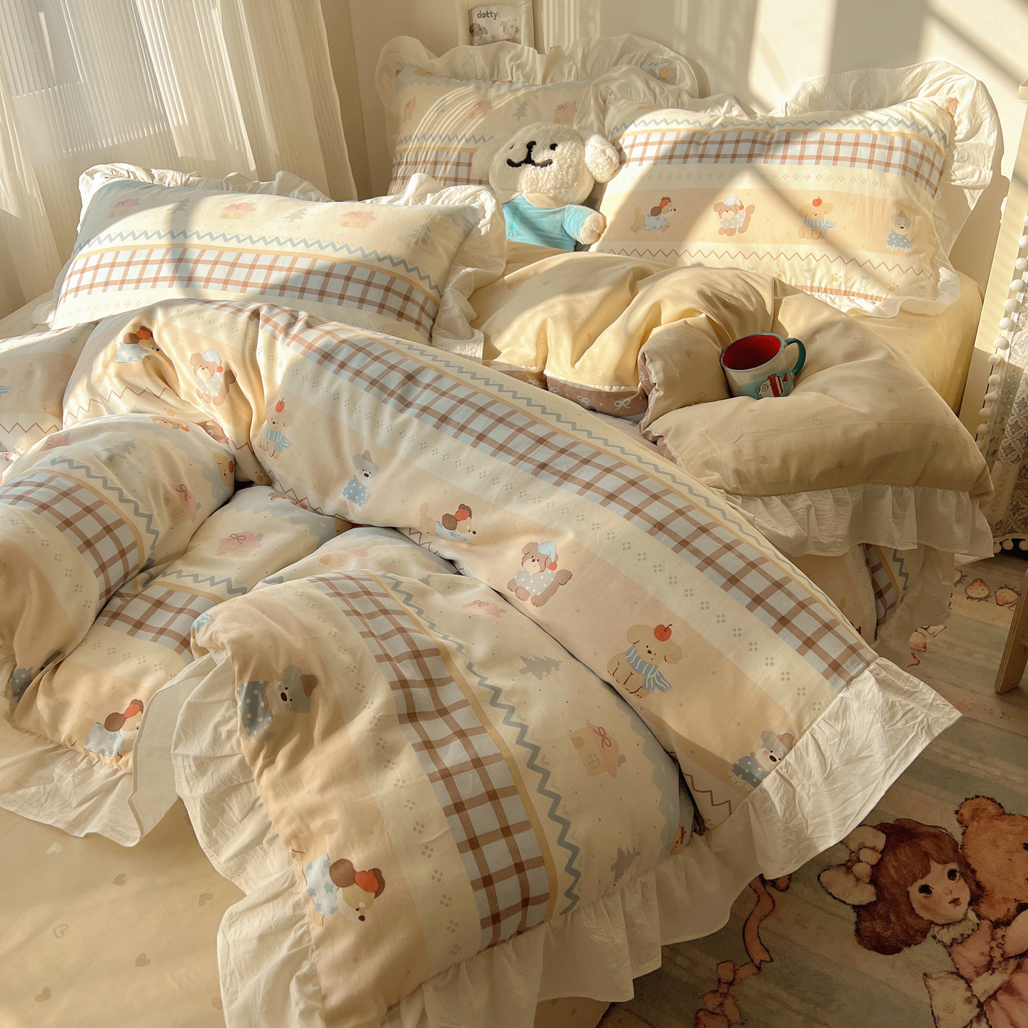 商品名称:六巷胡同 2026春夏新款韩系花边款卡通40支13070全棉四件套(第二系列)-风格二 花边费尔岛狗狗