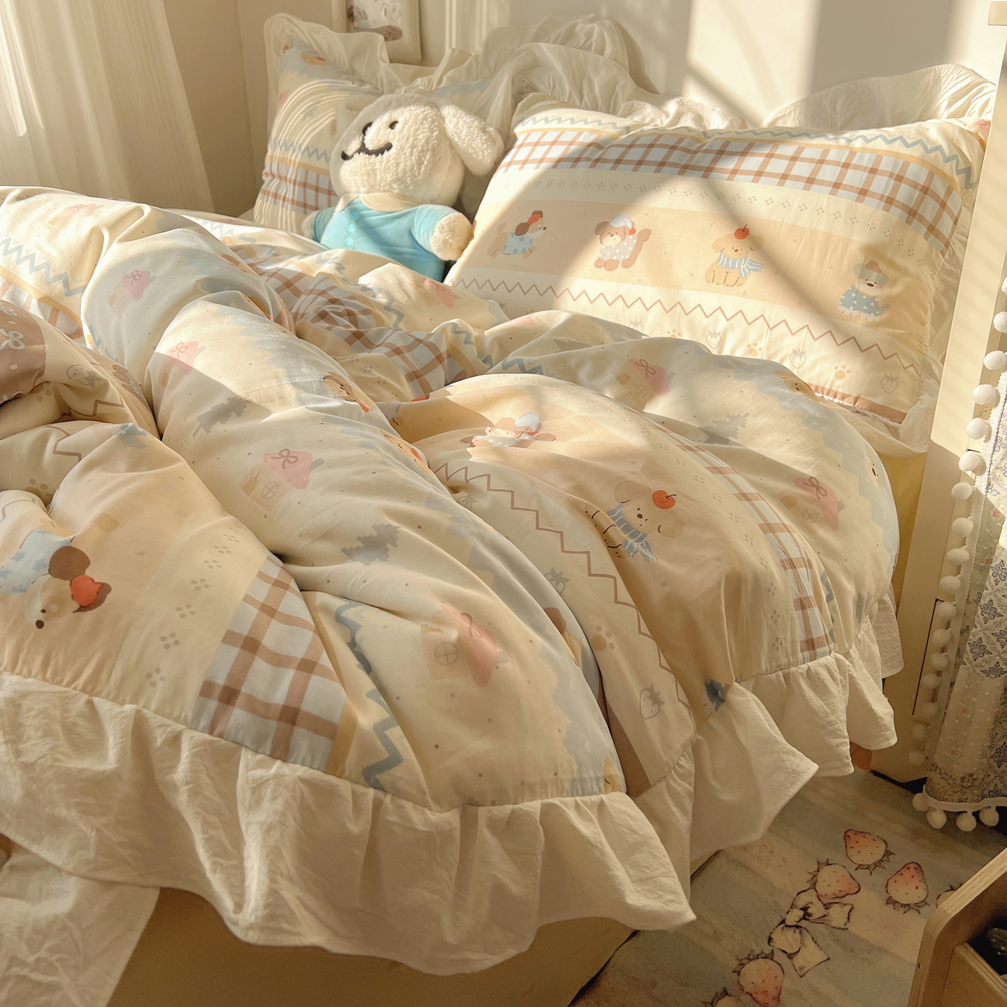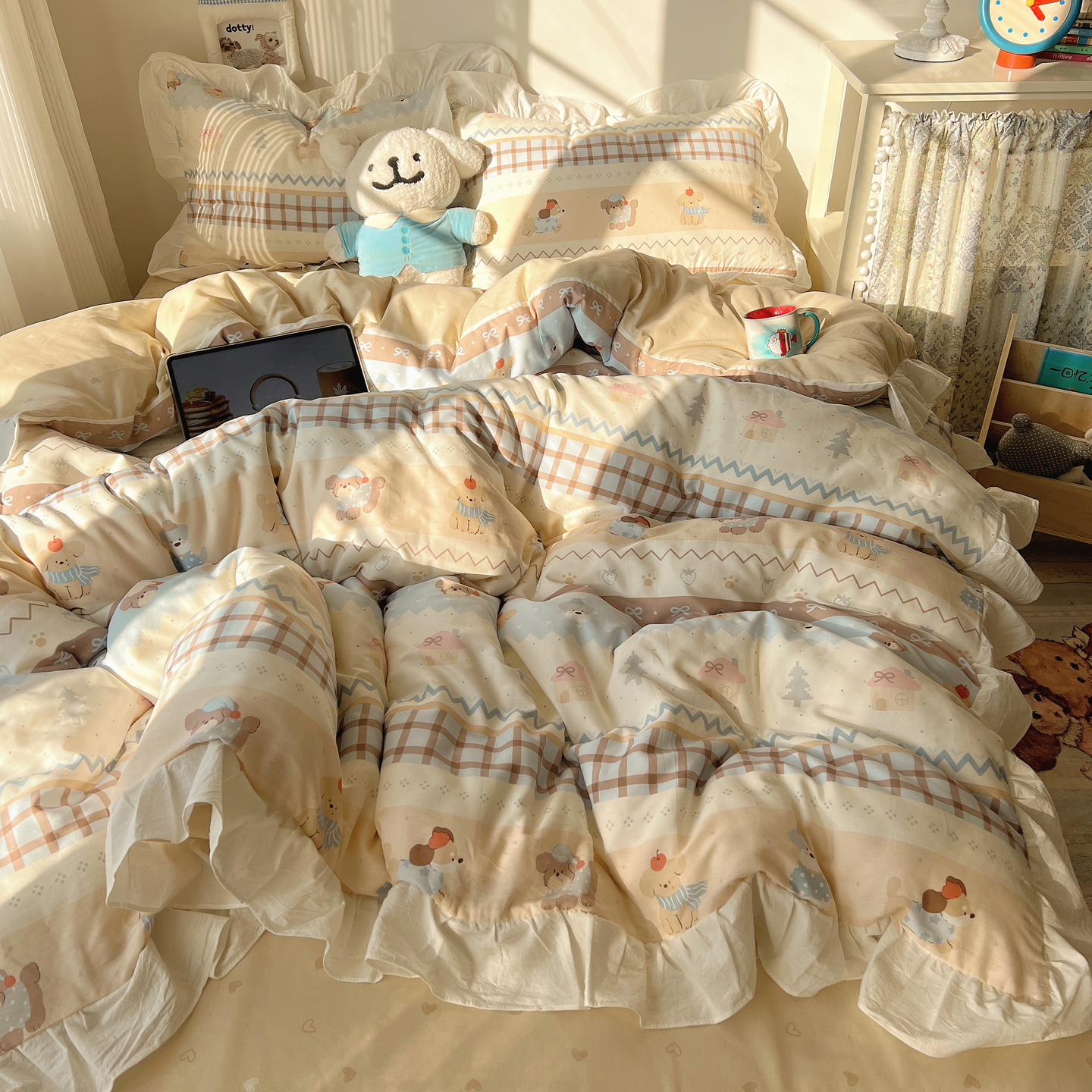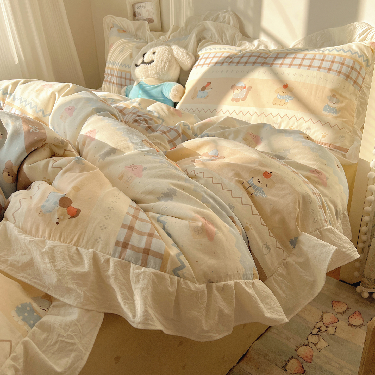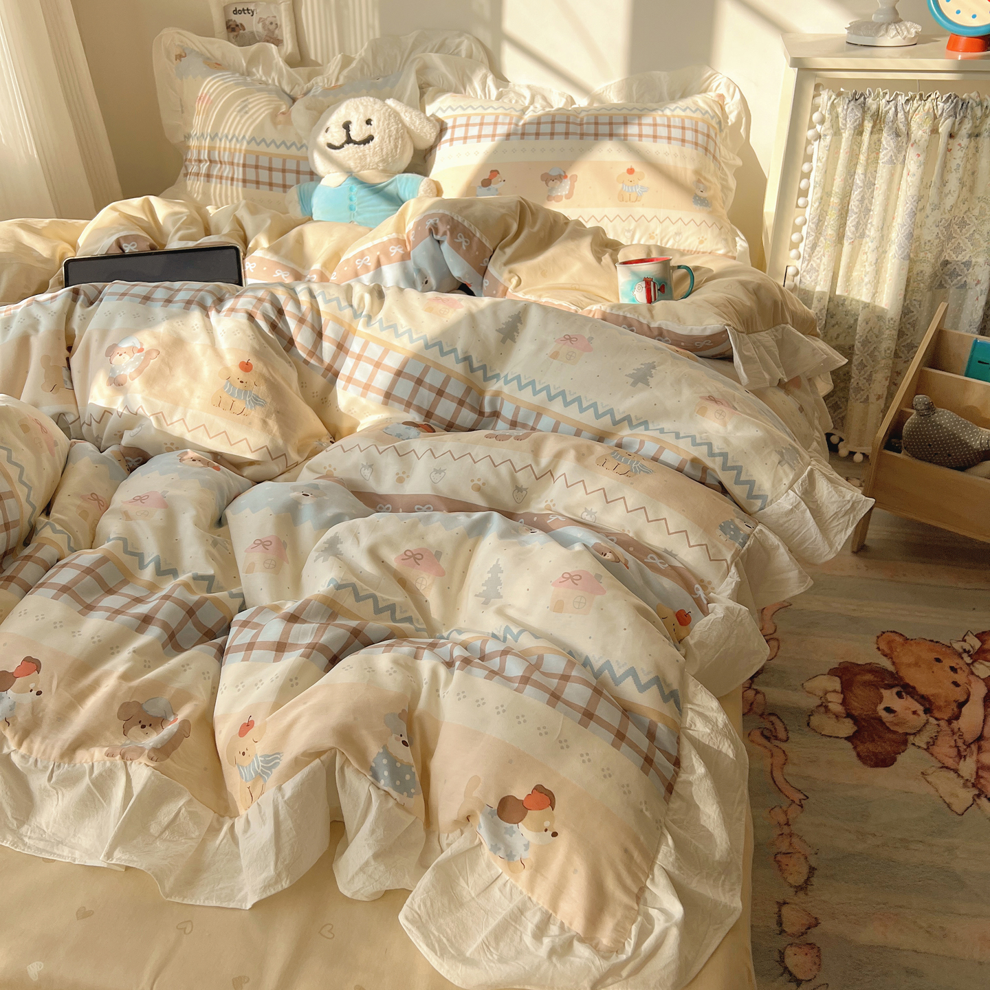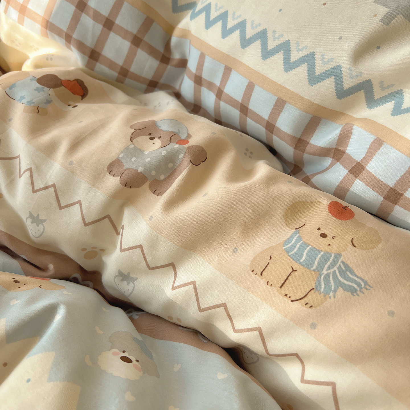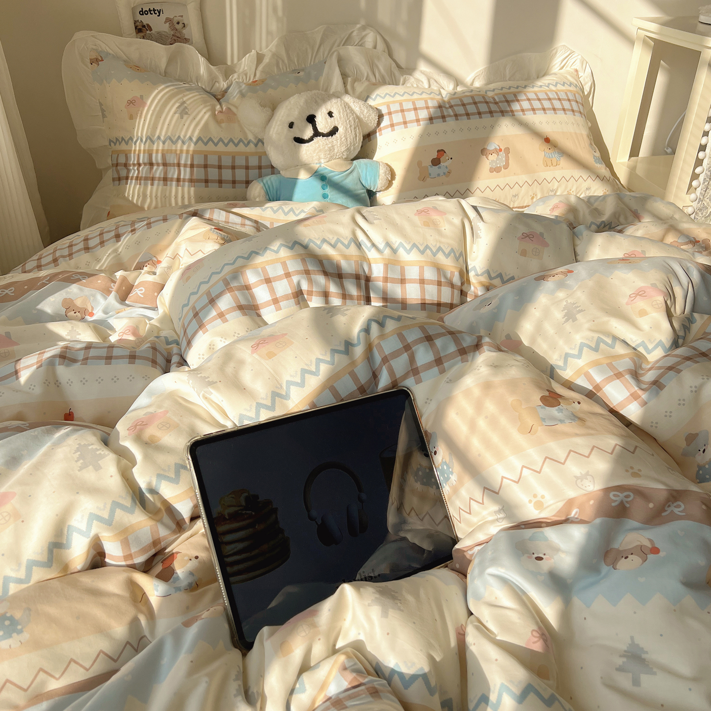 商品名称:六巷胡同 2026春夏新款韩系花边款卡通40支13070全棉四件套(第二系列)-风格二 花边费尔岛狗狗
