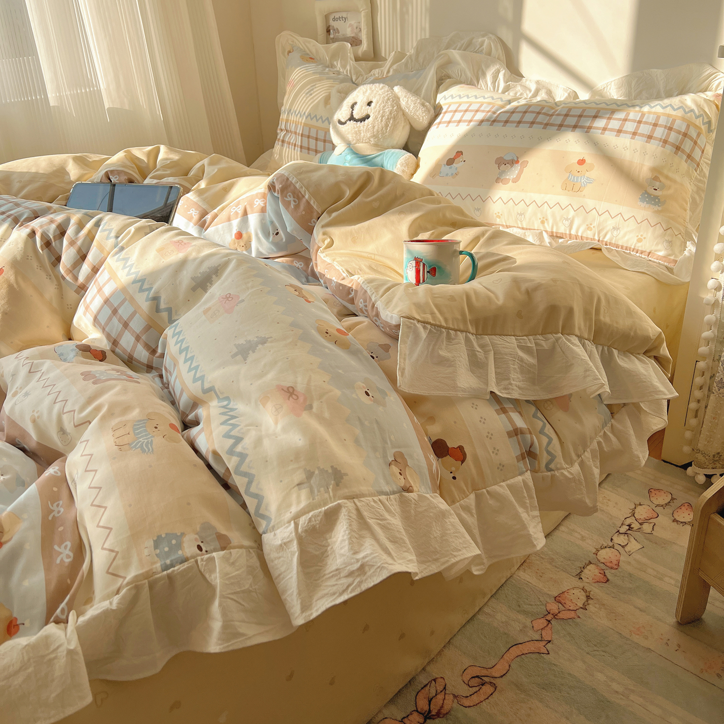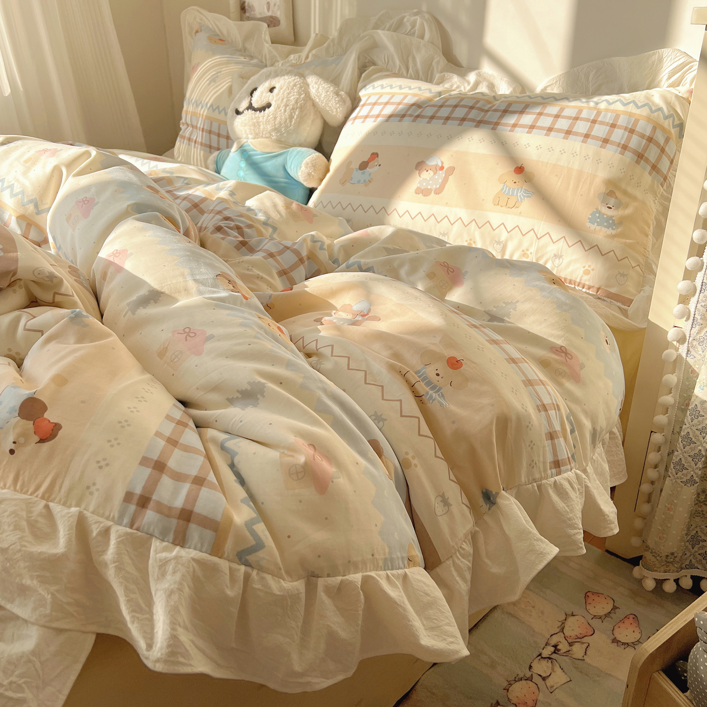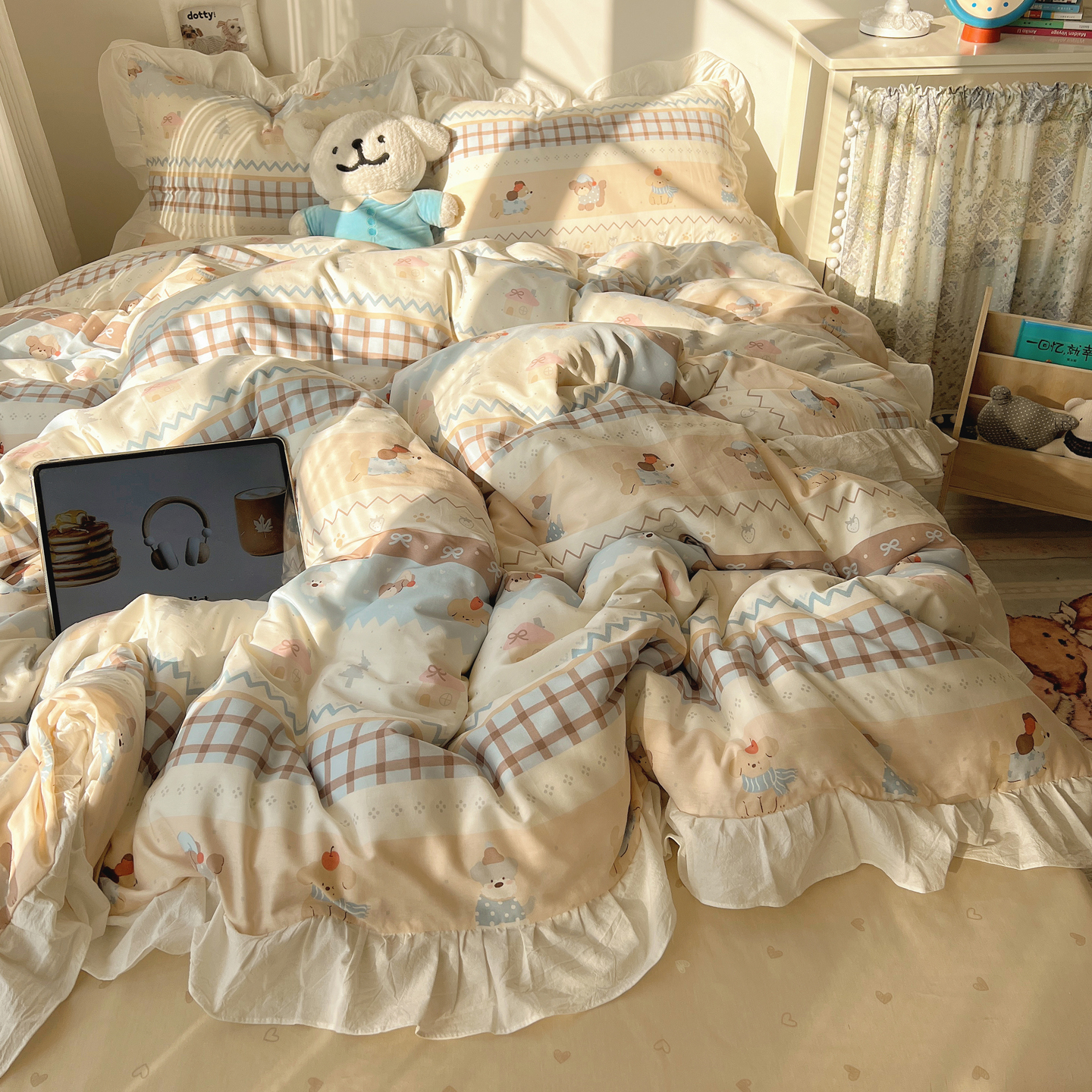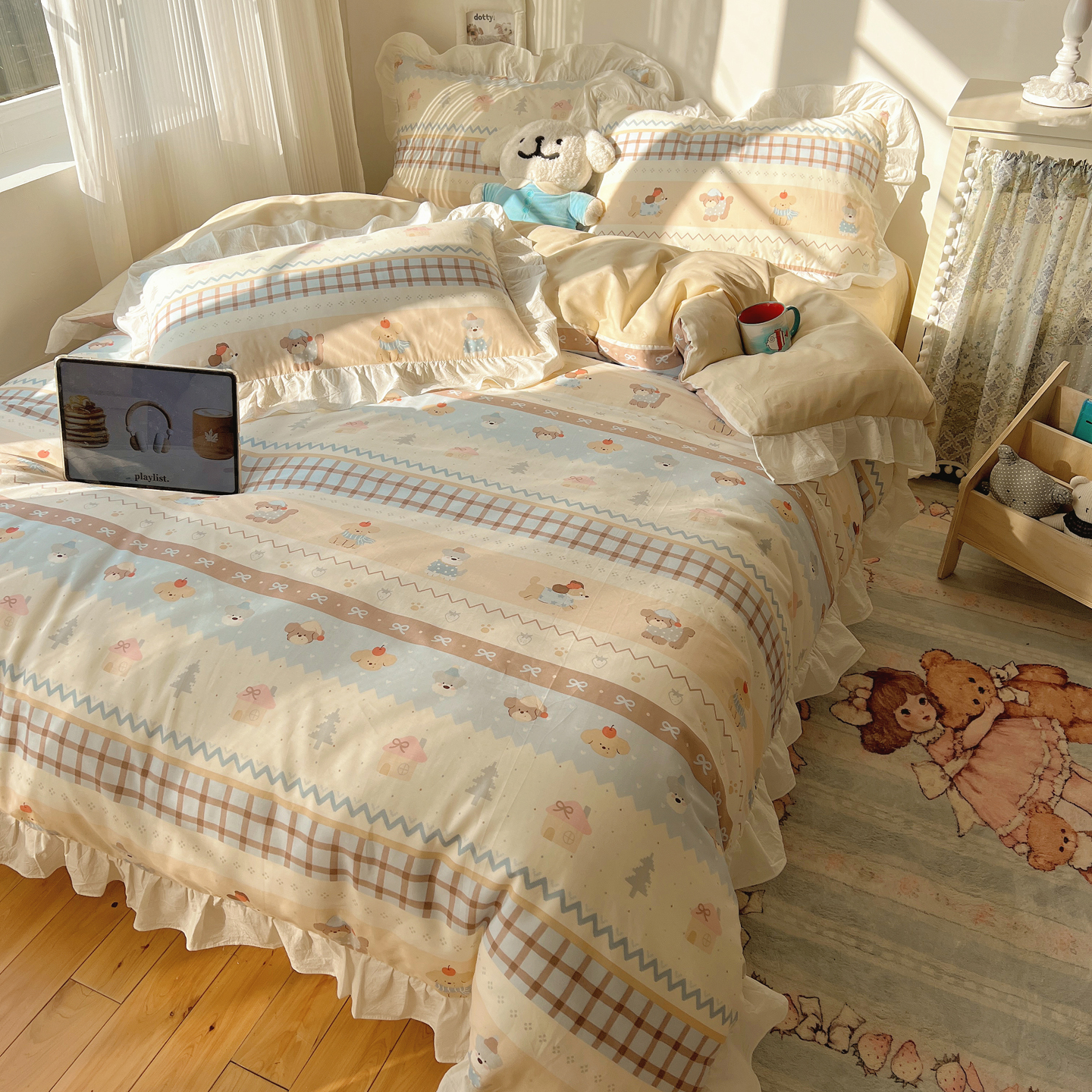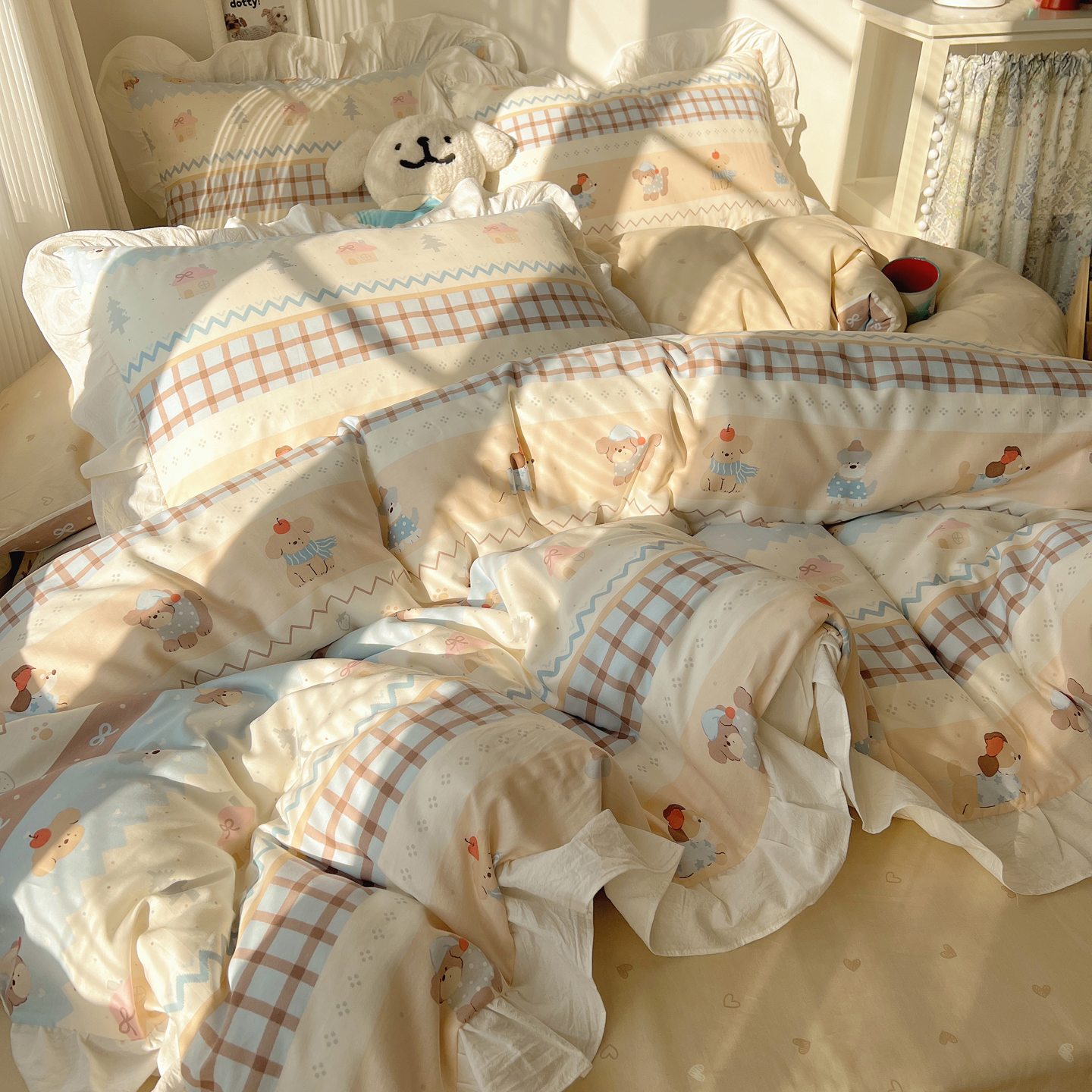 商品名称:六巷胡同 2026春夏新款韩系花边款卡通40支13070全棉四件套(第二系列)-风格二 花边费尔岛狗狗