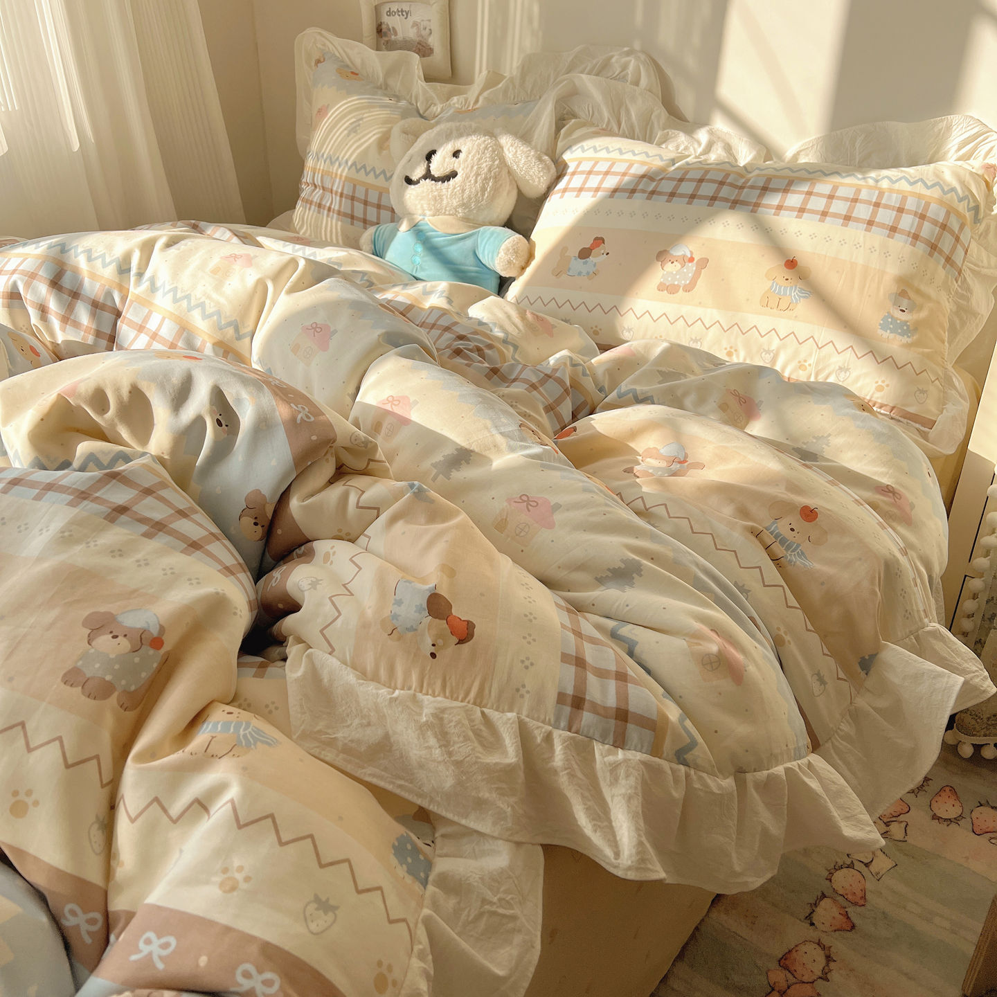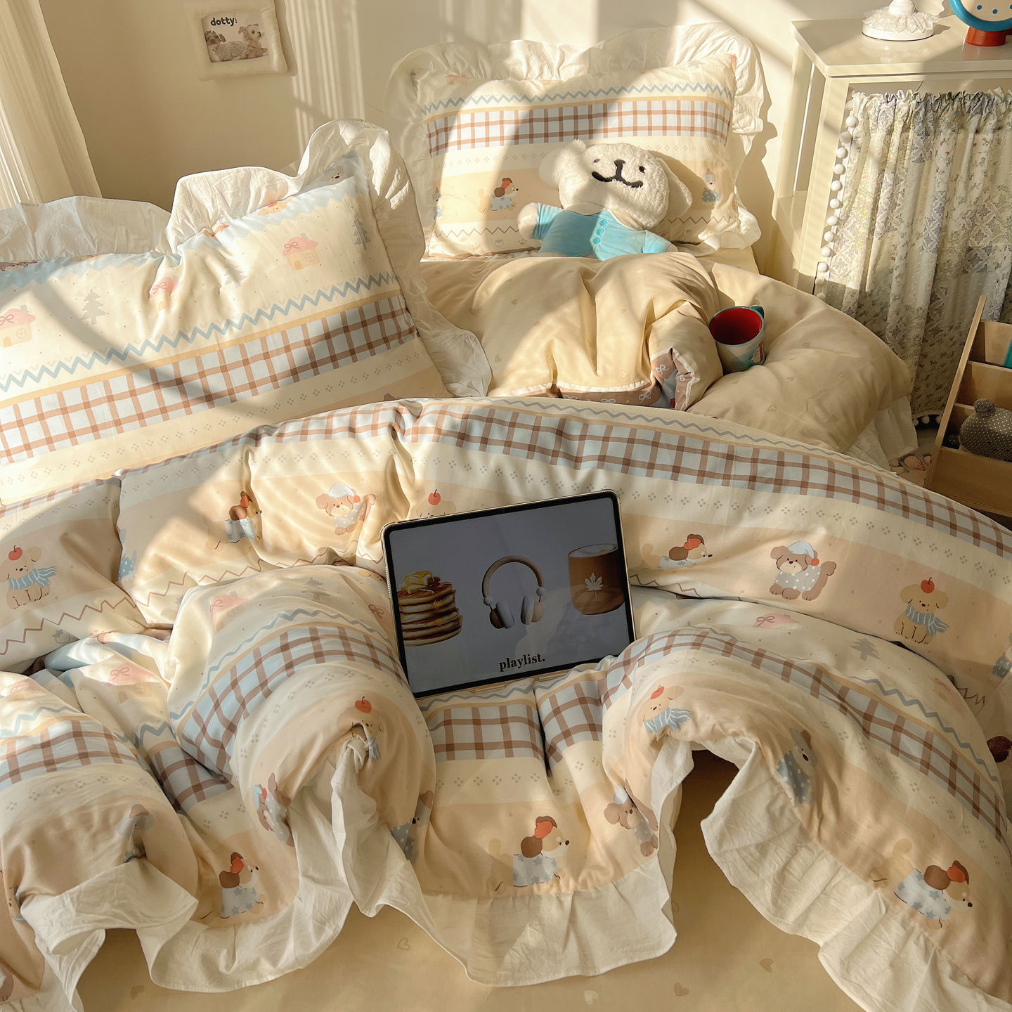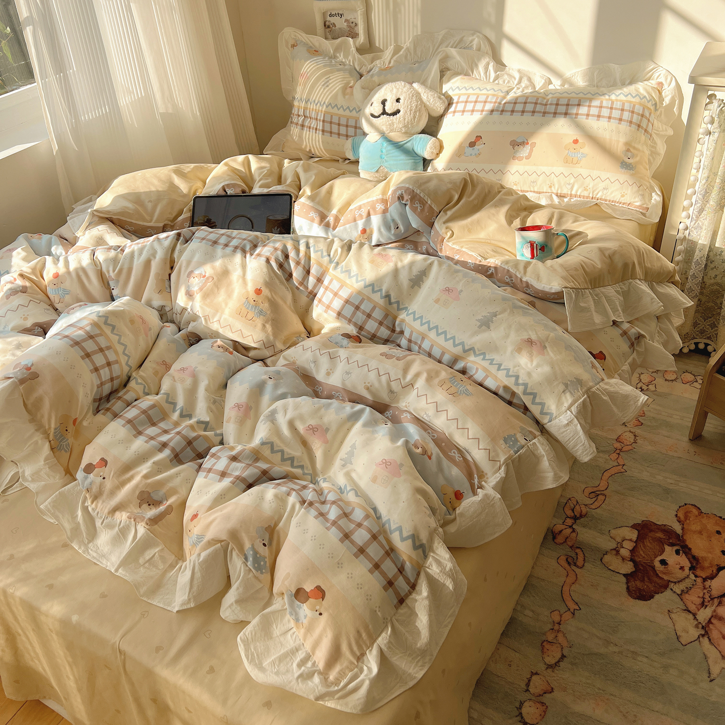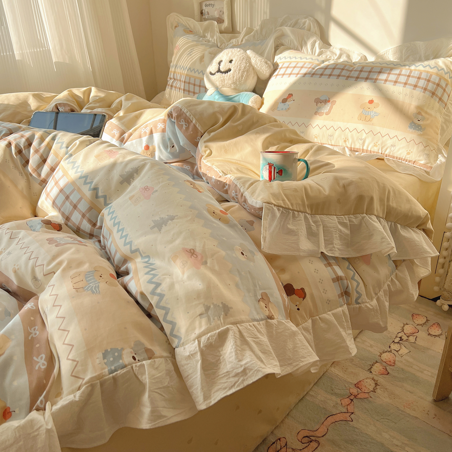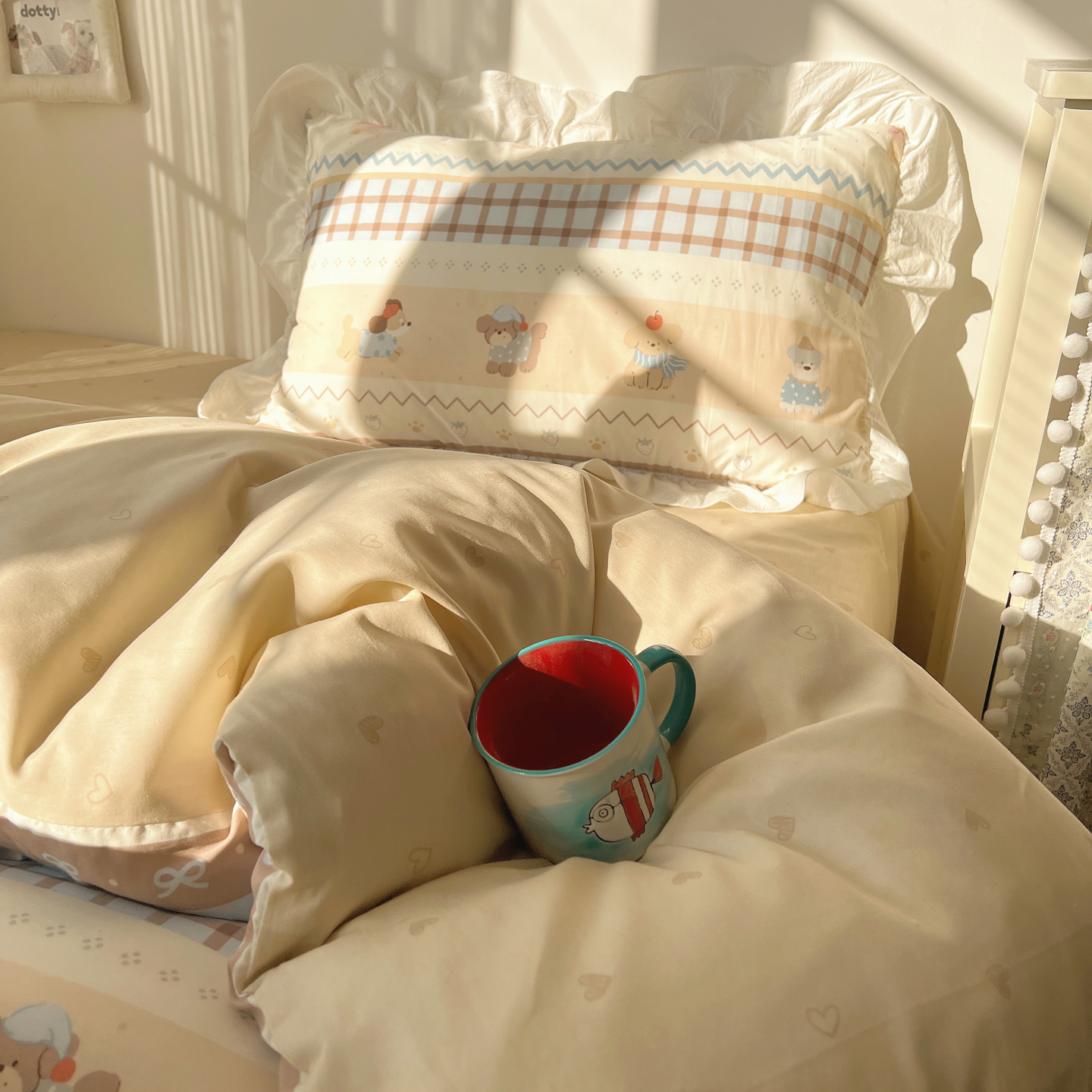 商品名称:六巷胡同 2026春夏新款韩系花边款卡通40支13070全棉四件套(第二系列)-风格二 花边费尔岛狗狗