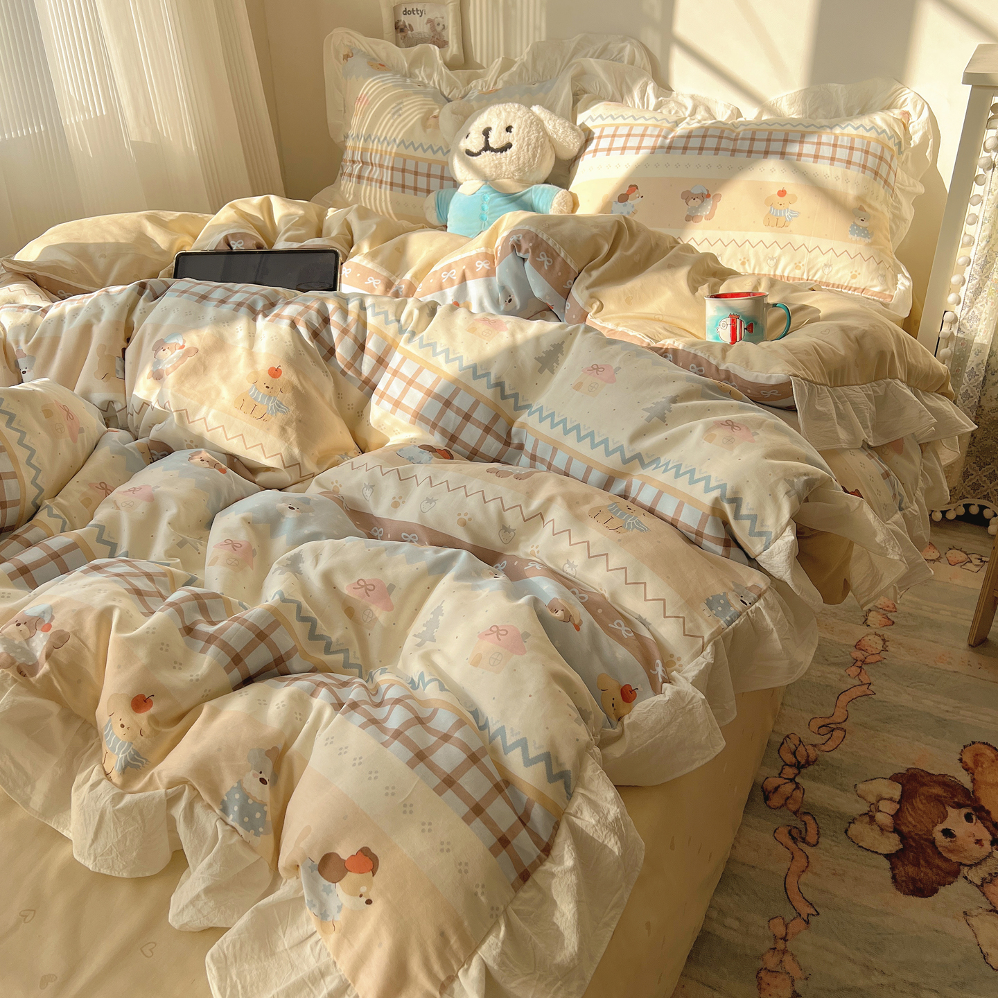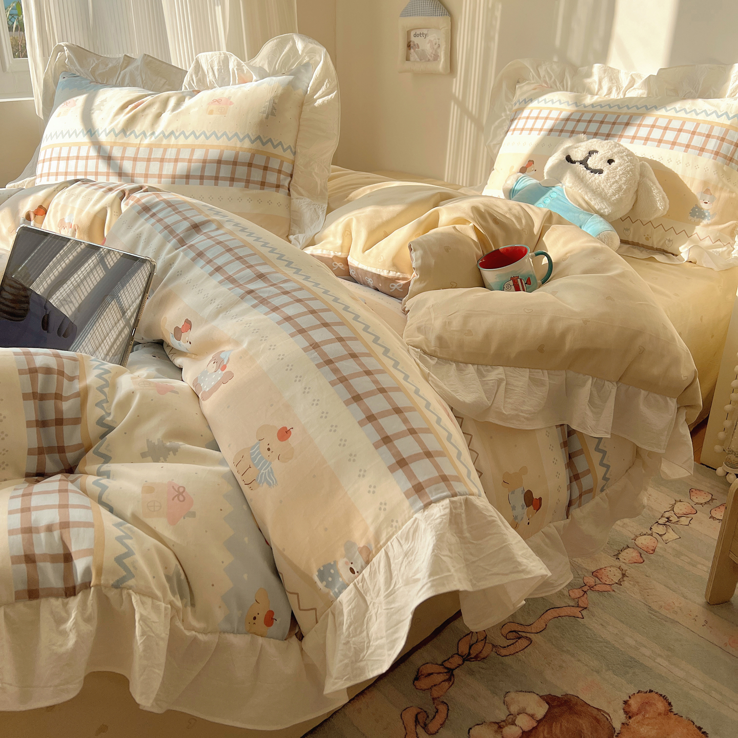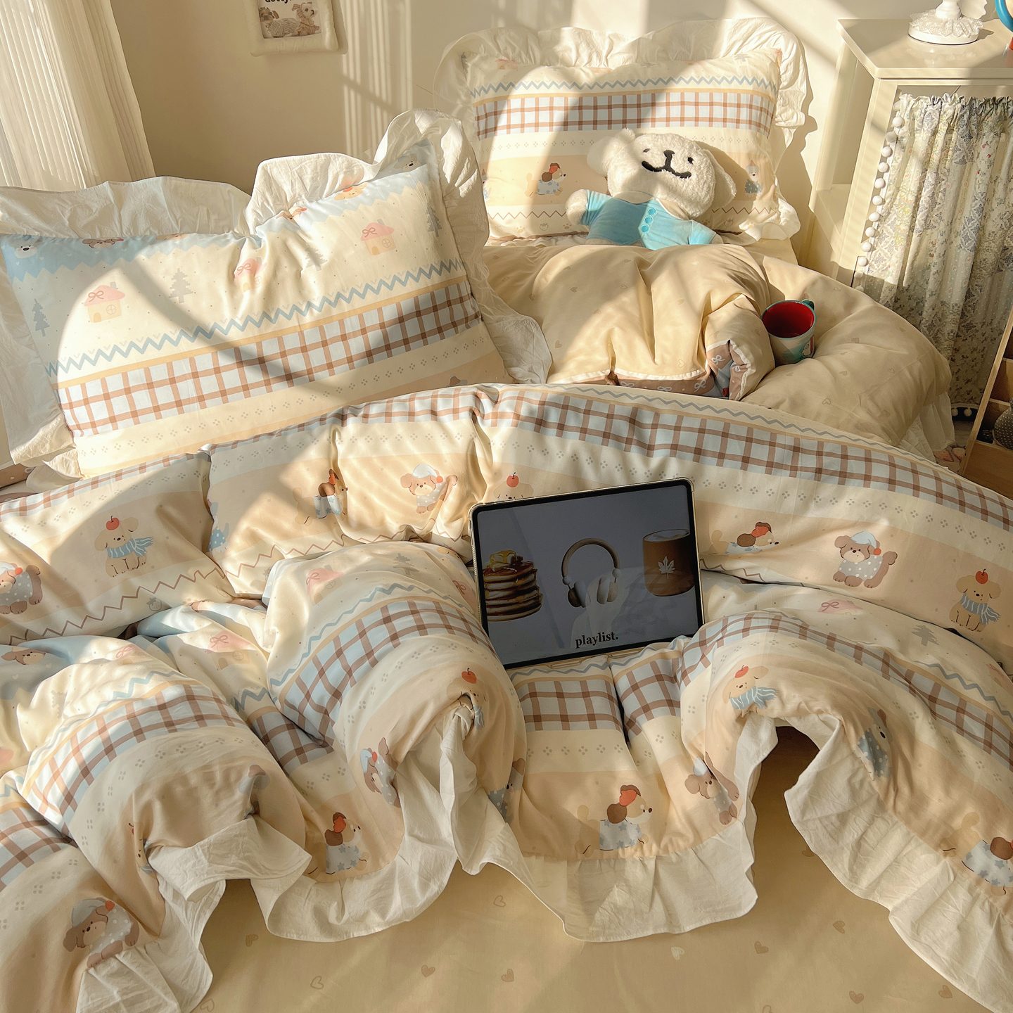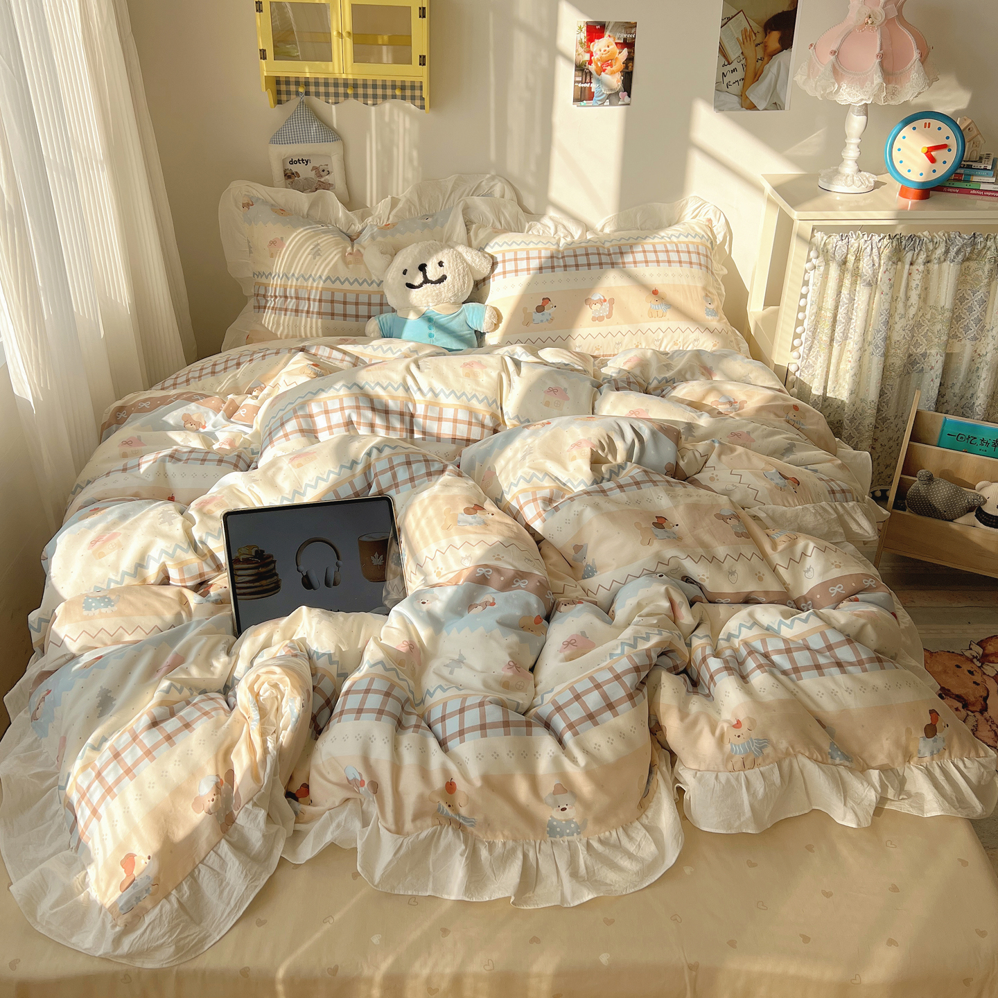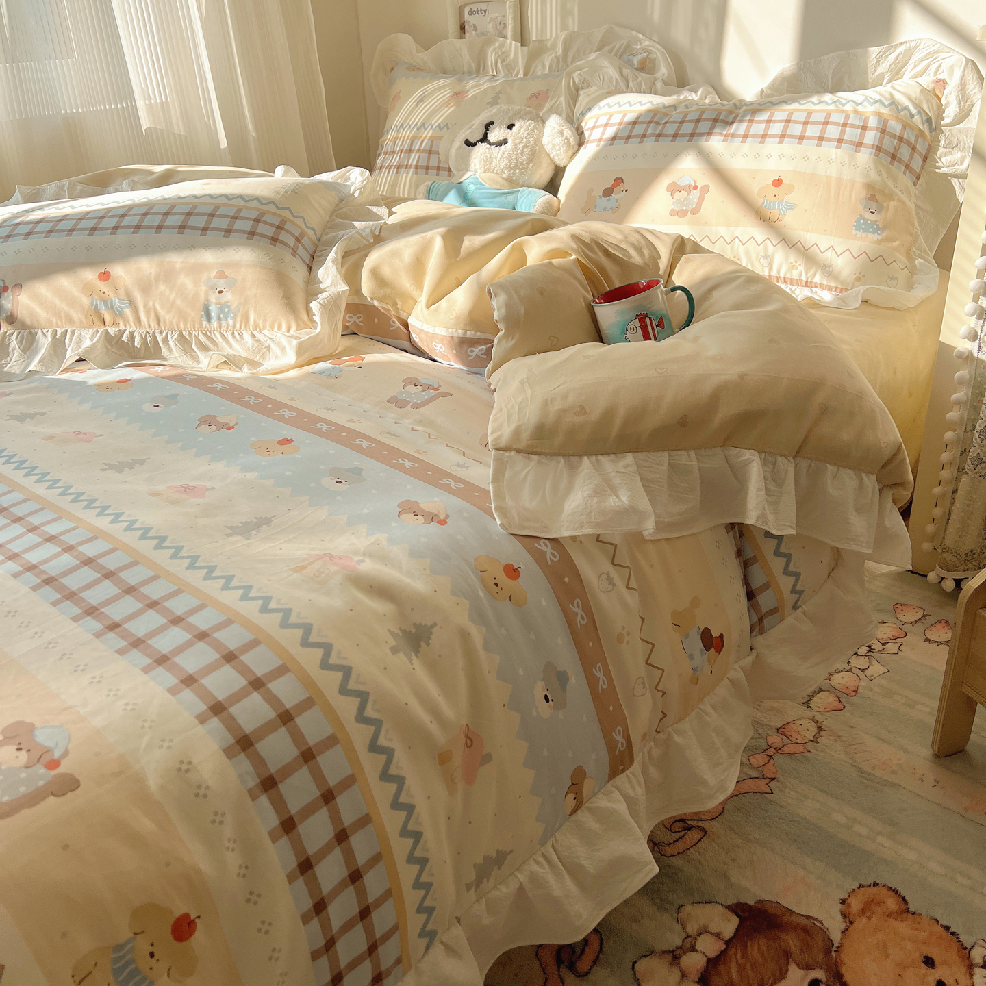 商品名称:六巷胡同 2026春夏新款韩系花边款卡通40支13070全棉四件套(第二系列)-风格二 花边费尔岛狗狗