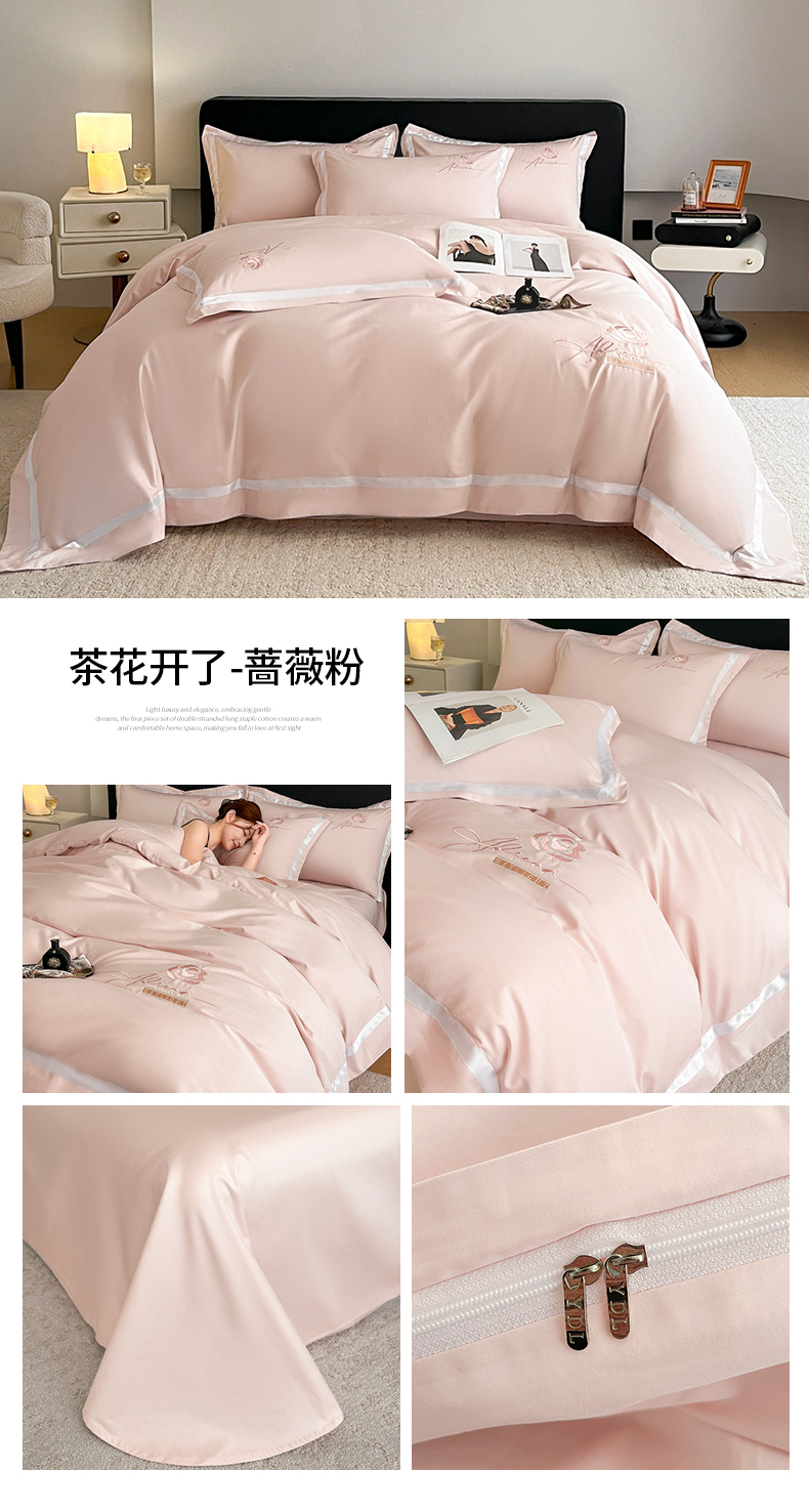商品名称:新方向 【控价 提供买家秀】2026新款刺绣50s双股全棉贡缎长绒棉四件套-茶花开了(控价 标准328元 加大348元) 茶花开了-蔷薇粉