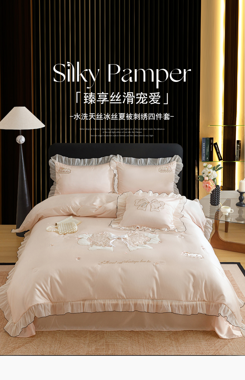 (总)绒棉世家 2026新款提花冰丝刺绣床盖四件套,蝴蝶结-粉玉,蝴蝶结-奶白,蝴蝶结-雅紫
