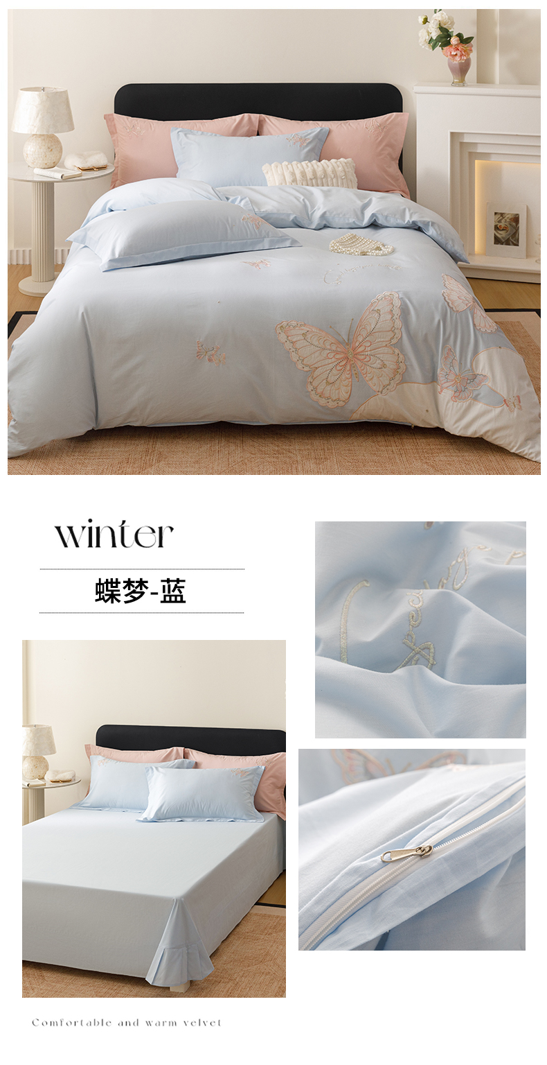 绒棉世家 2026直播热款纯棉全棉100%刺绣四件套百分百 蝶梦-蓝