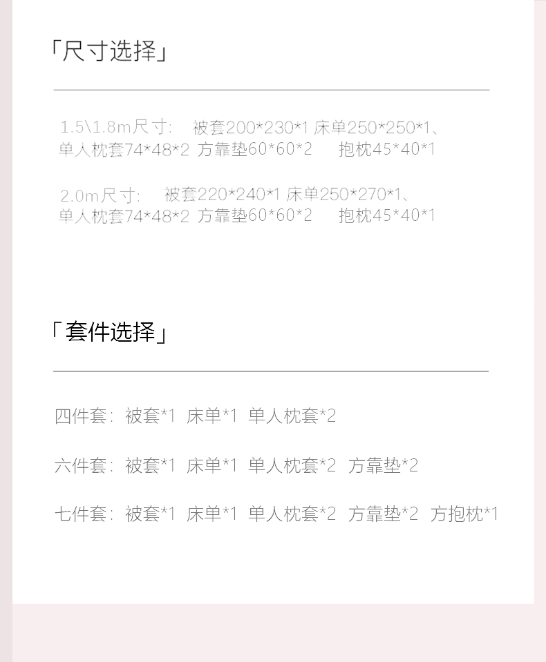 [{"sp_id":11,"sp_name":"\u989c\u8272","sp_format":2,"sp_list":[{"sp_value_id":1665,"sp_value_name":"\u7231\u76f8\u968f","sp_value_image":{"id":999,"path":"https:\/\/img3.91jf.com\/ghelp\/2026\/20260407\/20260407125828_501920.jpg"},"sp_value_video":{"id":0,"img":"","path":"","time":0,"download_num":0,"play_num":0},"price":"220.00","storage":2500,"weight":"3.000","is_check_weight":0,"plus_price":"","sp_sort":0}]},{"sp_id":10,"sp_name":"\u5c3a\u5bf8","sp_format":1,"sp_list":[{"sp_value_id":41,"sp_value_name":"1.5m\u5e8a\u5355\u6b3e\u56db\u4ef6\u5957","sp_value_image":{"id":0,"path":""},"sp_value_video":{"id":0,"img":"","path":"","time":0,"download_num":0,"play_num":0},"price":"220.00","storage":500,"weight":"3.000","is_check_weight":0,"plus_price":"","sp_sort":5},{"sp_value_id":42,"sp_value_name":"1.8m\u5e8a\u5355\u6b3e\u56db\u4ef6\u5957","sp_value_image":{"id":0,"path":""},"sp_value_video":{"id":0,"img":"","path":"","time":0,"download_num":0,"play_num":0},"price":"220.00","storage":500,"weight":"3.000","is_check_weight":0,"plus_price":"","sp_sort":6},{"sp_value_id":43,"sp_value_name":"2.0m\u5e8a\u5355\u6b3e\u56db\u4ef6\u5957","sp_value_image":{"id":0,"path":""},"sp_value_video":{"id":0,"img":"","path":"","time":0,"download_num":0,"play_num":0},"price":"235.00","storage":500,"weight":"3.000","is_check_weight":0,"plus_price":"","sp_sort":7},{"sp_value_id":44,"sp_value_name":"\u65b9\u57ab\u5957\/\u5bf9","sp_value_image":{"id":0,"path":""},"sp_value_video":{"id":0,"img":"","path":"","time":0,"download_num":0,"play_num":0},"price":"45.00","storage":500,"weight":"0.500","is_check_weight":0,"plus_price":"","sp_sort":8},{"sp_value_id":45,"sp_value_name":"\u5c0f\u62b1\u6795\/\u53ea","sp_value_image":{"id":0,"path":""},"sp_value_video":{"id":0,"img":"","path":"","time":0,"download_num":0,"play_num":0},"price":"35.00","storage":500,"weight":"0.500","is_check_weight":0,"plus_price":"","sp_sort":9}]}]