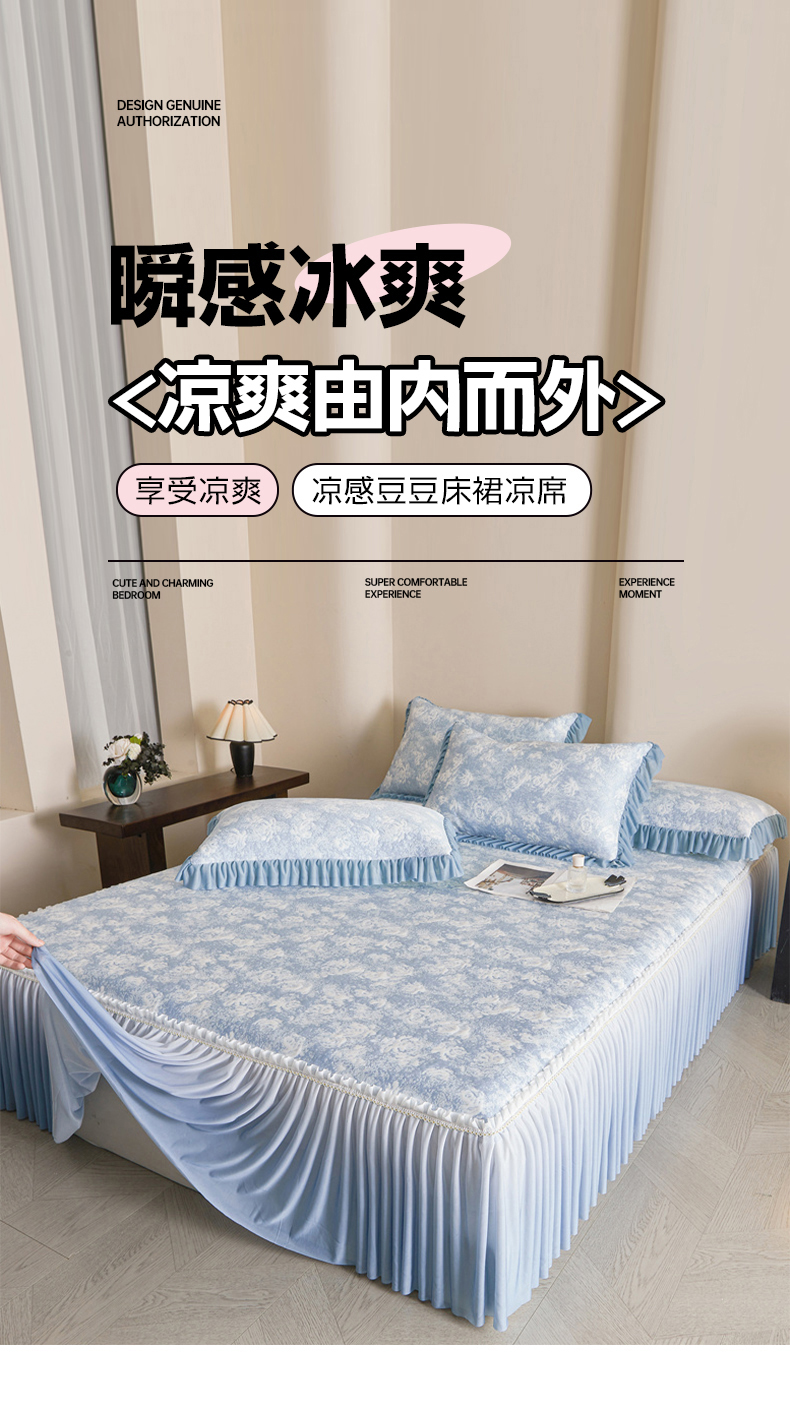 喜梦缘家纺 2026新款PE冰豆豆冰丝床裙款凉席席子-玫瑰系列 蓝玫瑰
