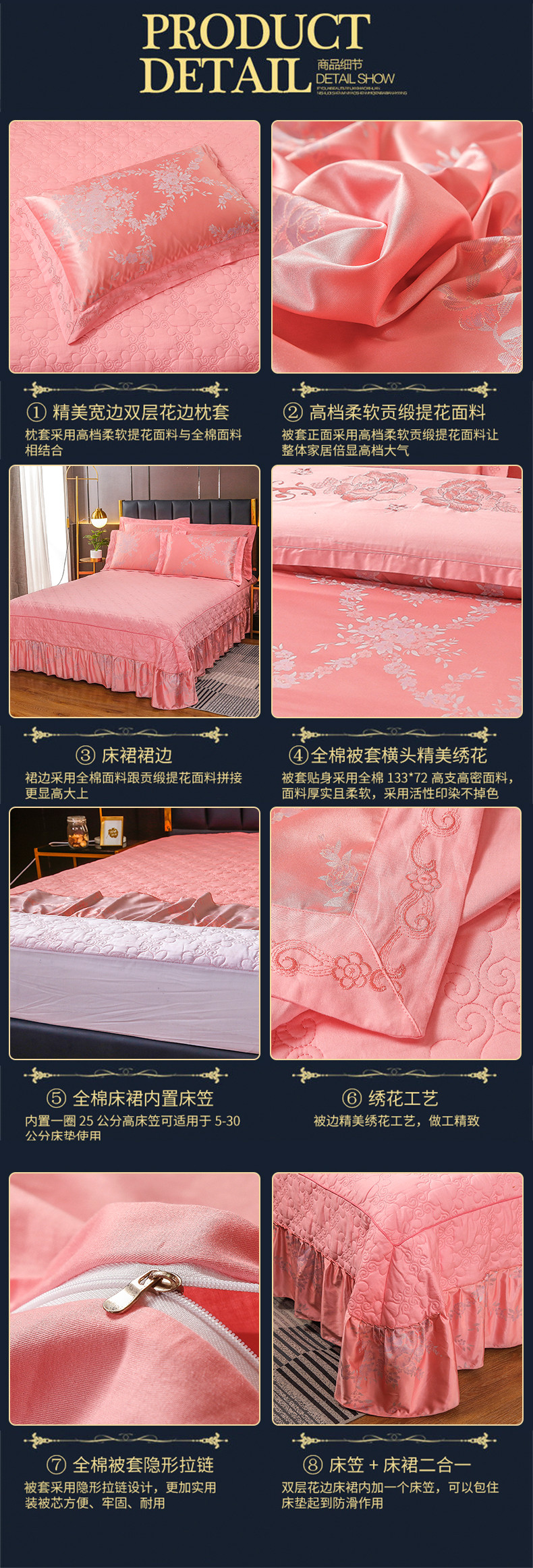 商品名称:福丽莱家纺 2023新款贡缎提花床裙四件套(夹棉)情梦花逸-粉玉