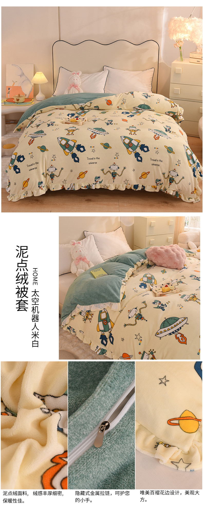 • 91家纺网 家纺一手货源 找家纺 甜之梦家纺 2025新款韩版泥点绒单被套(任何尺寸都可定做) 太空机器人米白
