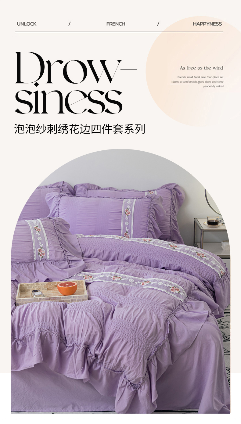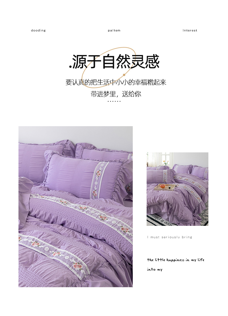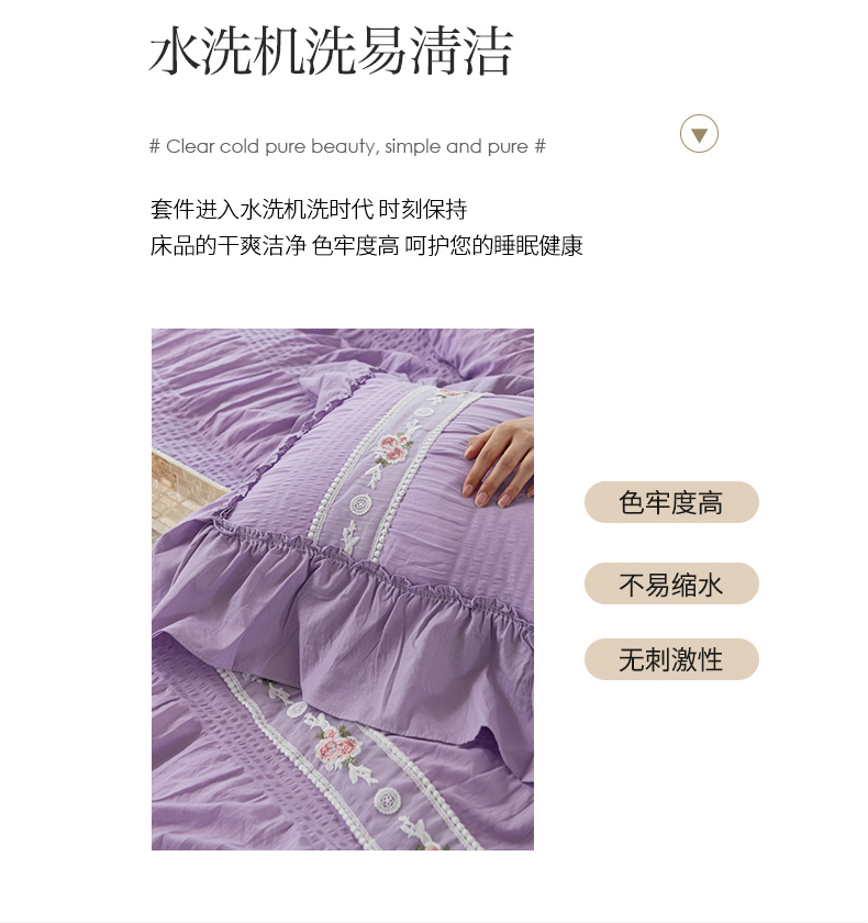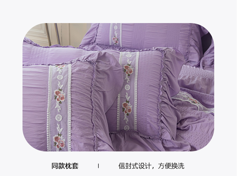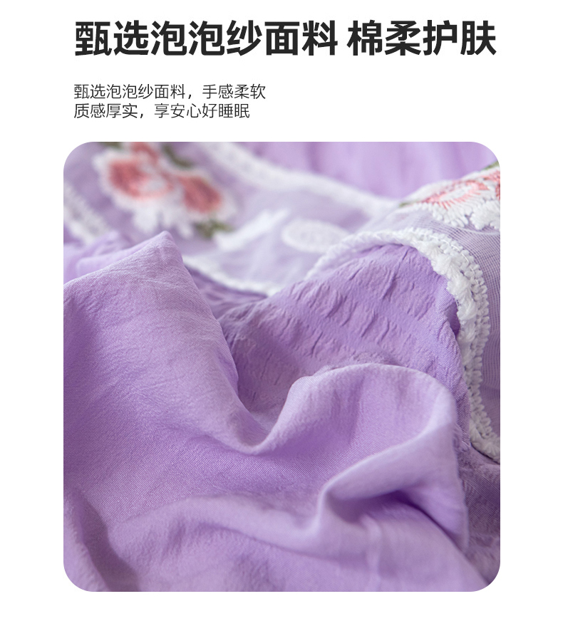 当前位置: 91家纺网 > 商品网购 > 床品套件 > 四件套 > 水洗棉四件套 > 你好美丽 2025新款泡泡纱刺绣花边四件套 泡泡纱-薰衣紫
