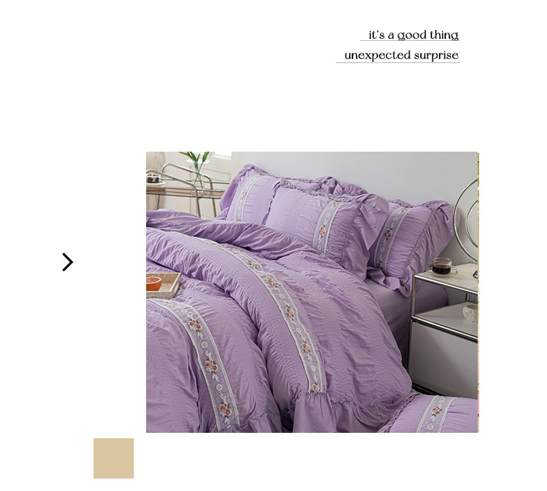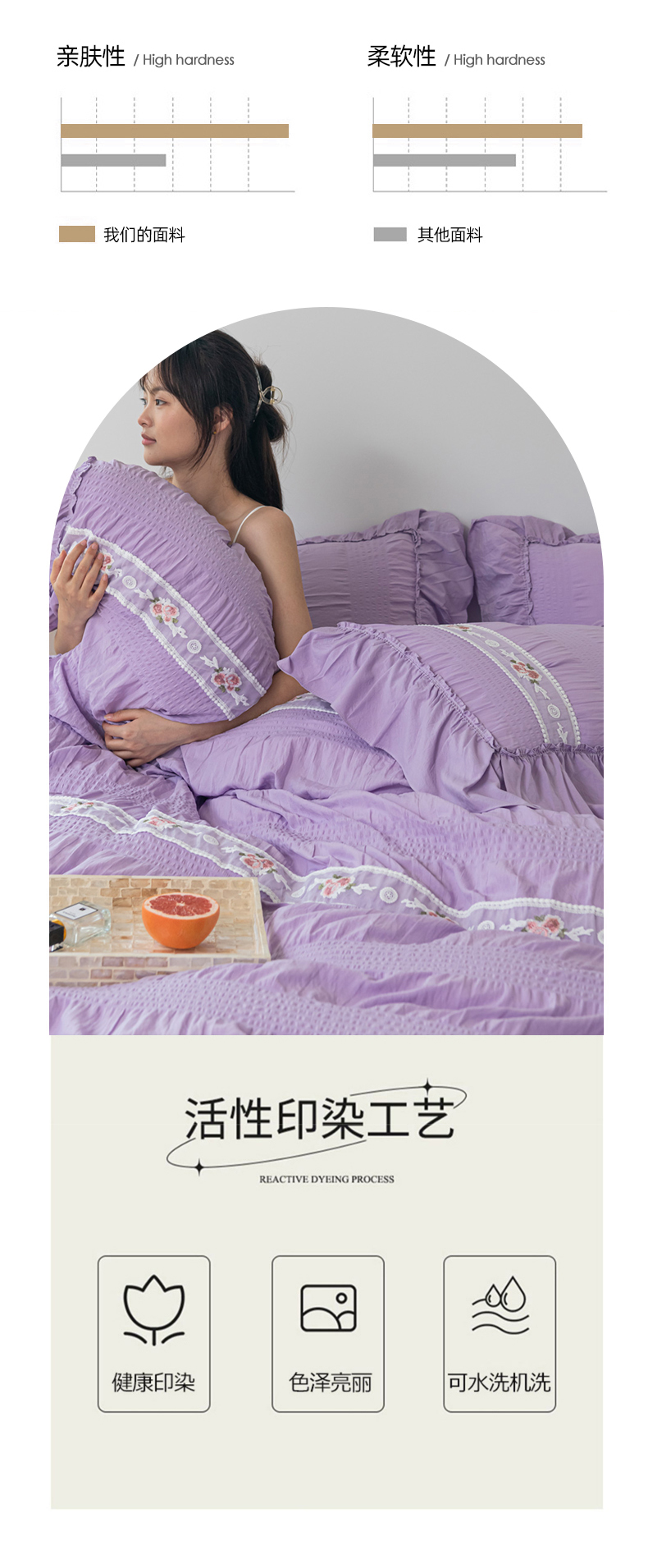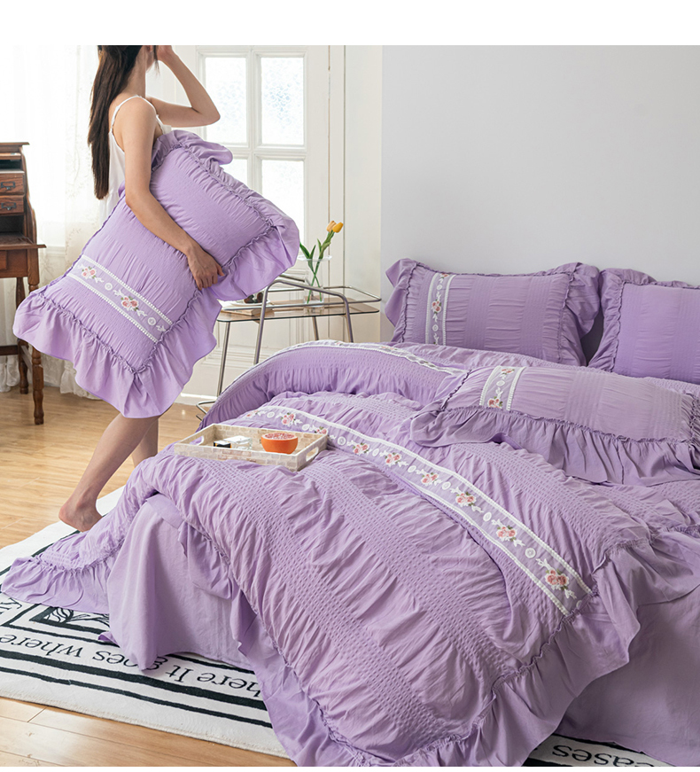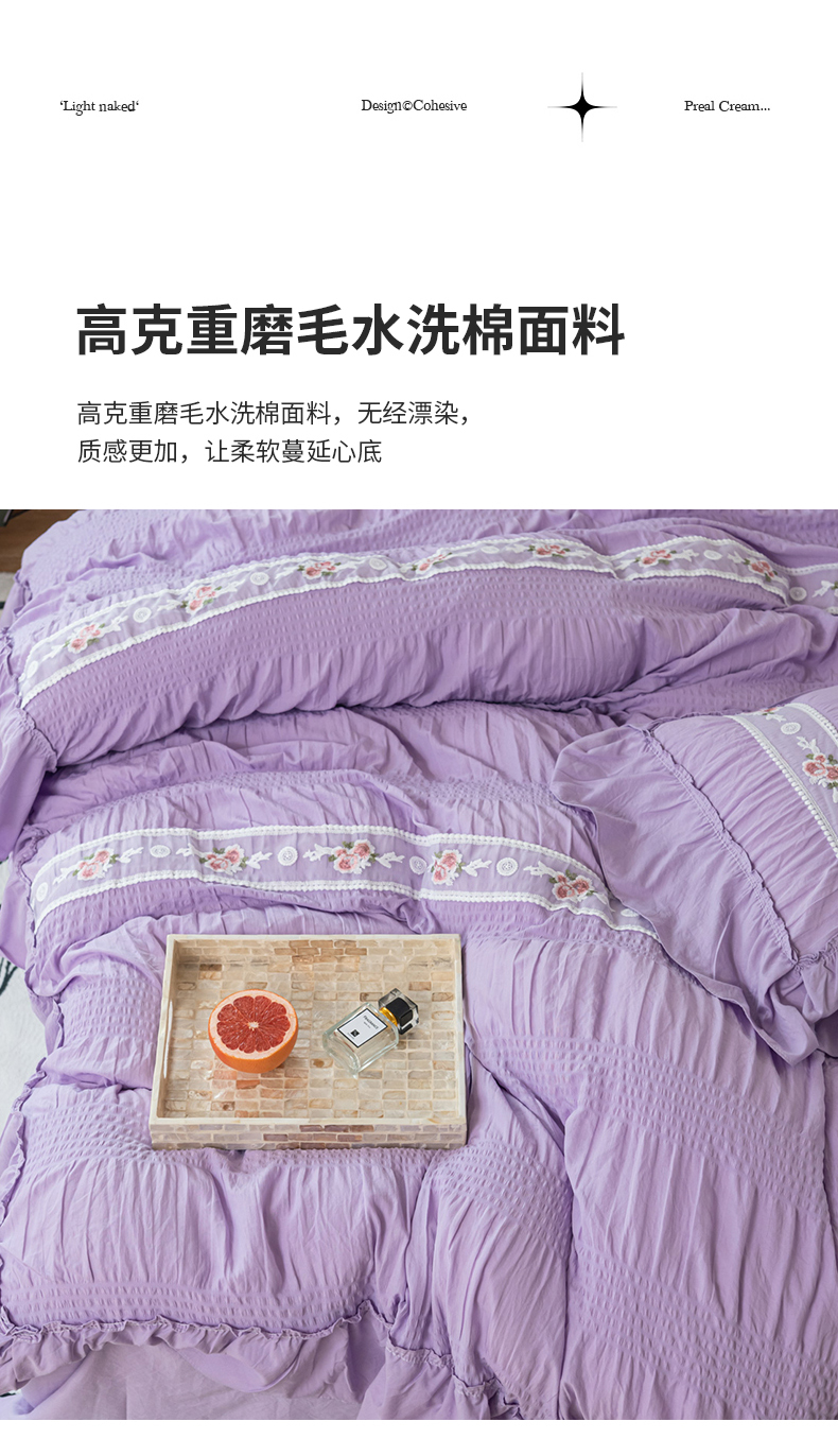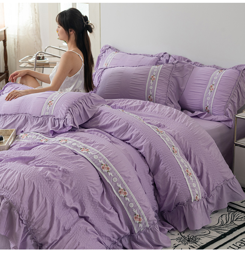 当前位置: 91家纺网 > 商品网购 > 床品套件 > 四件套 > 水洗棉四件套 > 你好美丽 2025新款泡泡纱刺绣花边四件套 泡泡纱-薰衣紫