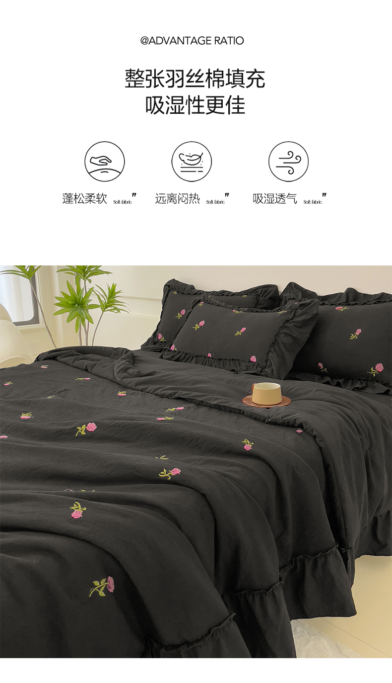 商品名称:你好美丽 2025新款水洗棉麻刺绣荷叶边夏被四件套-初荷 初荷-黑玫瑰