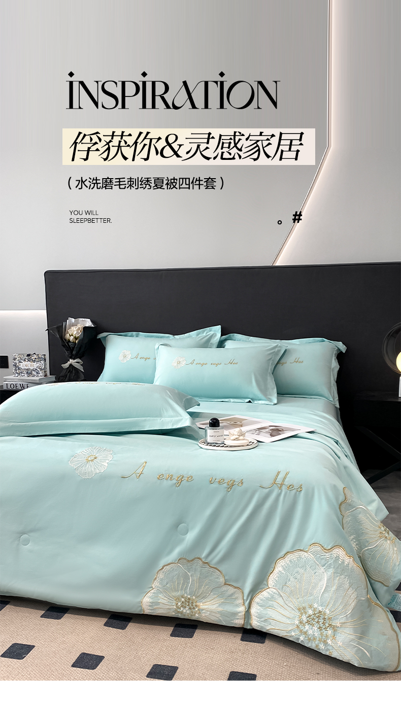 你好美丽 2025新款水洗磨毛刺绣夏被四件套-花开盛夏 花开盛夏-绿