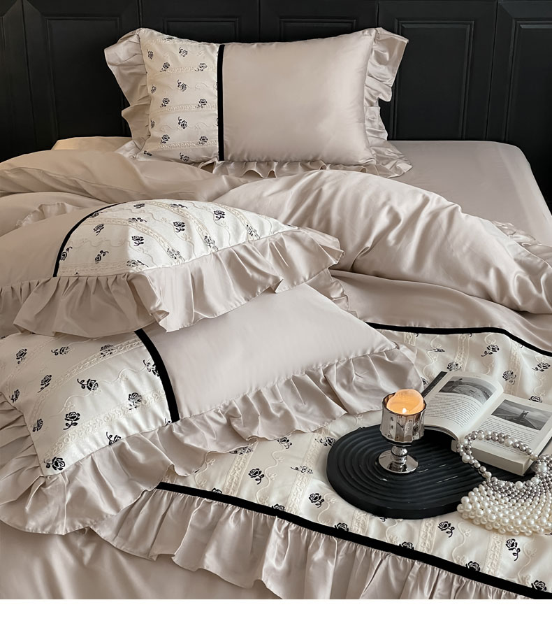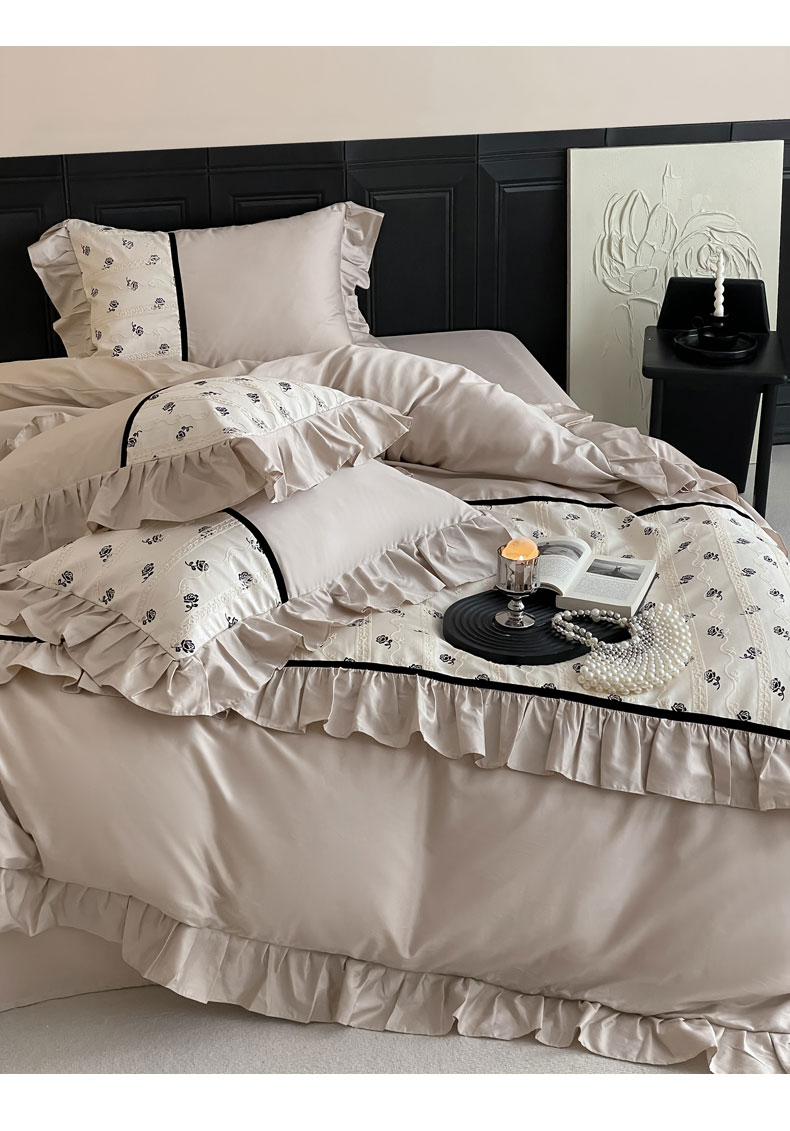 惯盈家纺 2024新款100支贡缎长绒棉荷叶边四件套-奥黛丽 灰咖