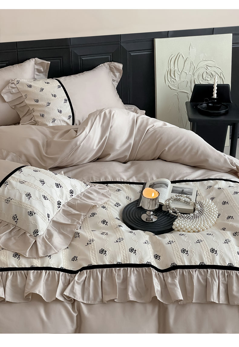 商品名称:惯盈家纺 2024新款100支贡缎长绒棉荷叶边四件套-奥黛丽 灰咖