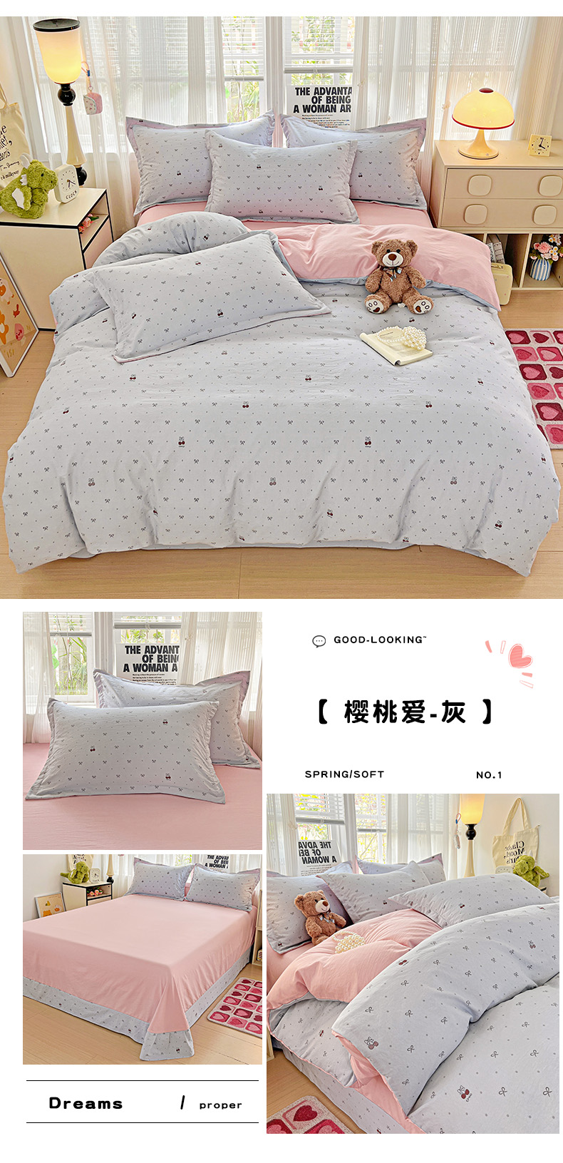 当前位置: 91家纺网 > 商品网购 > 床品套件 > 四件套 > 全棉普通四件套 > 欢博莱 2025新款仿纯棉四件套学生宿舍三件套单被套 樱桃爱-灰