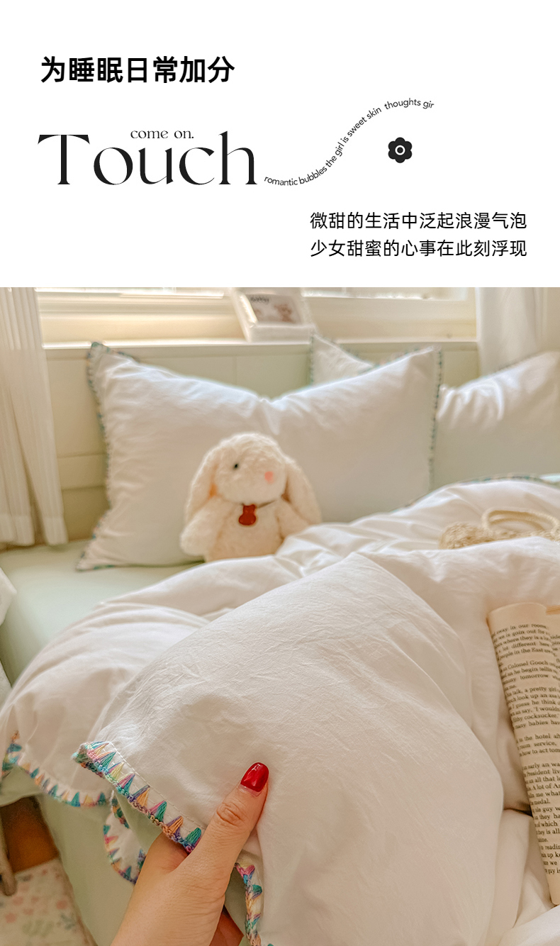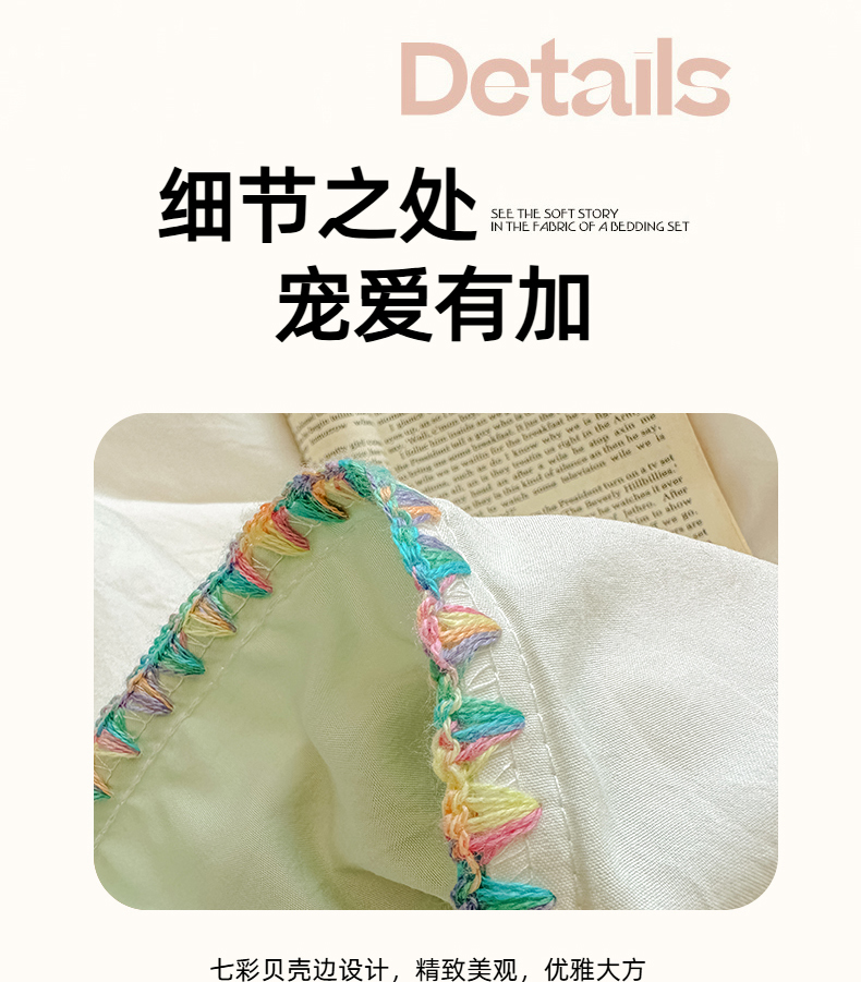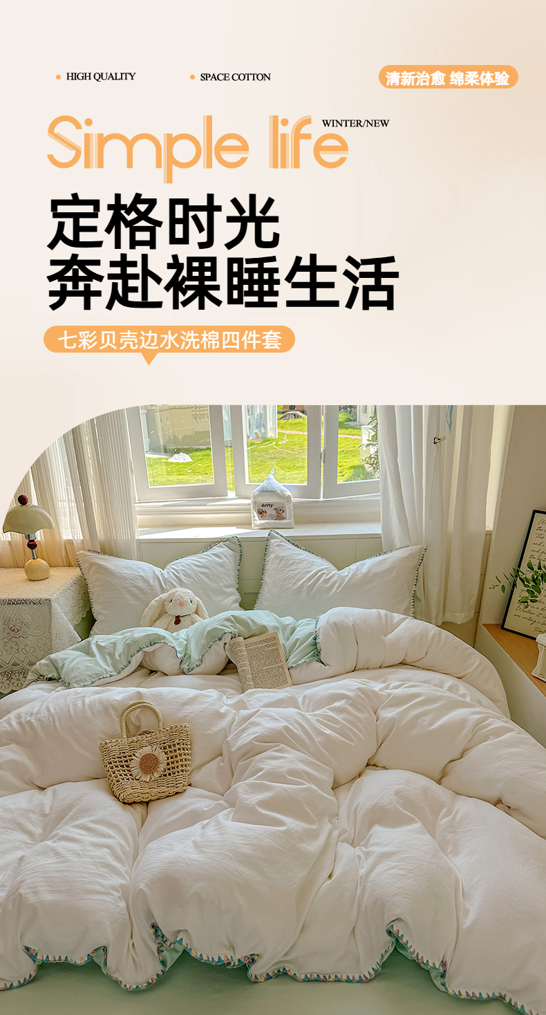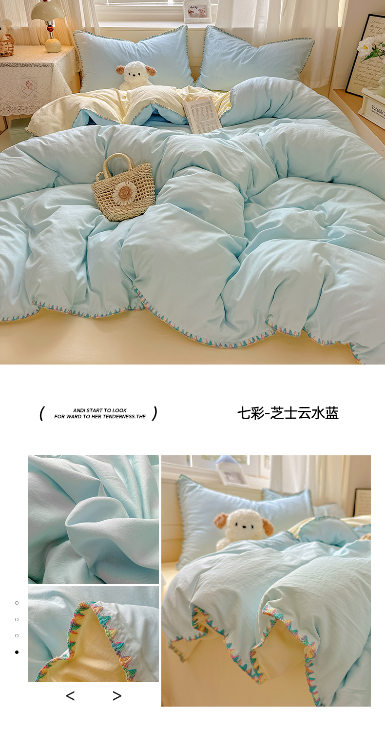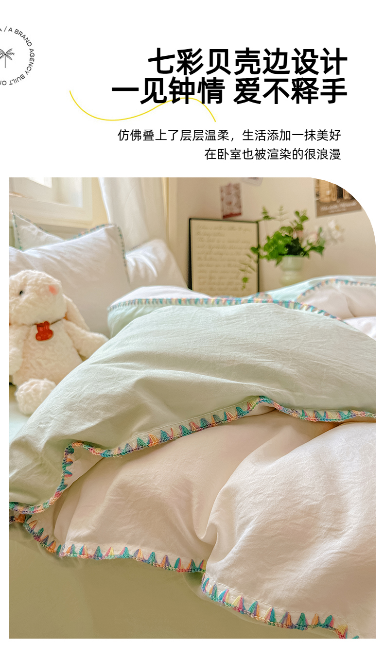 当前位置: 91家纺网 > 商品网购 > 床品套件 > 四件套 > 水洗棉四件套 > 冕悠家纺 2025新款A类七彩贝壳边水洗棉四件套 七彩-云水蓝奶白
