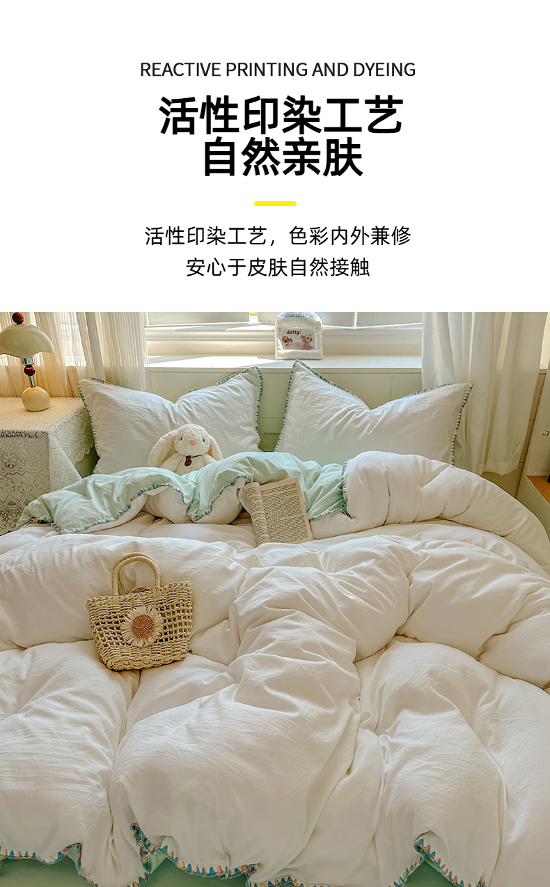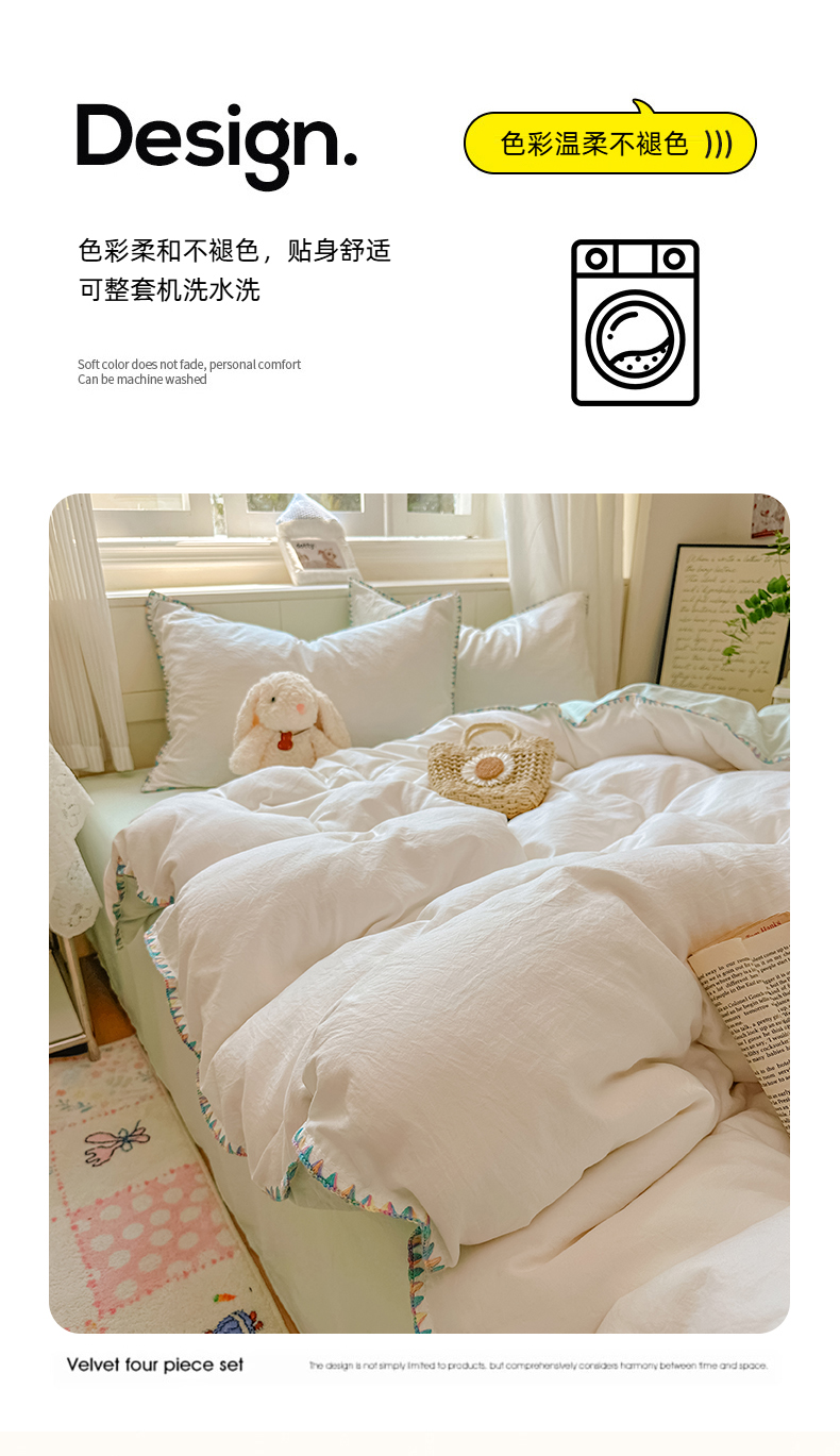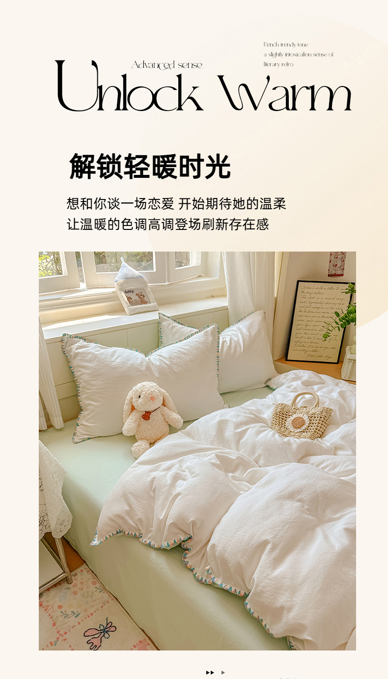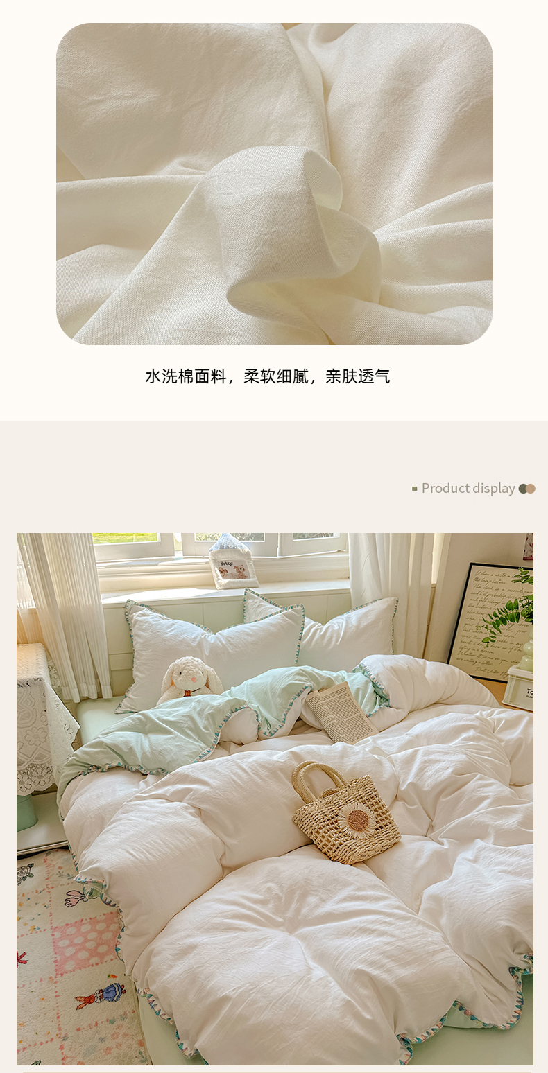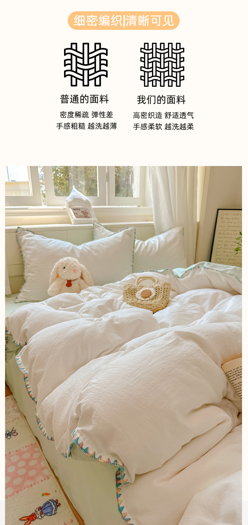 当前位置: 91家纺网 > 商品网购 > 床品套件 > 四件套 > 水洗棉四件套 > 冕悠家纺 2025新款A类七彩贝壳边水洗棉四件套 七彩-云水蓝奶白