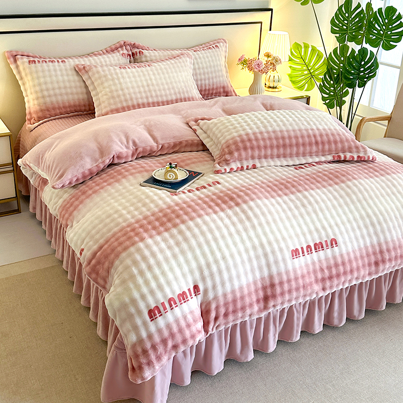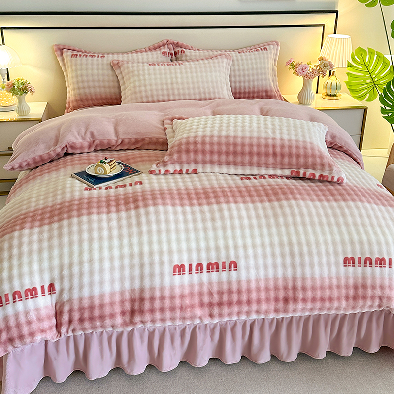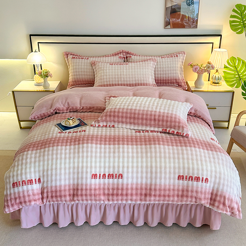 富缦庭 2025新款泡泡牛奶绒床盖款四件套 条纹字母-粉