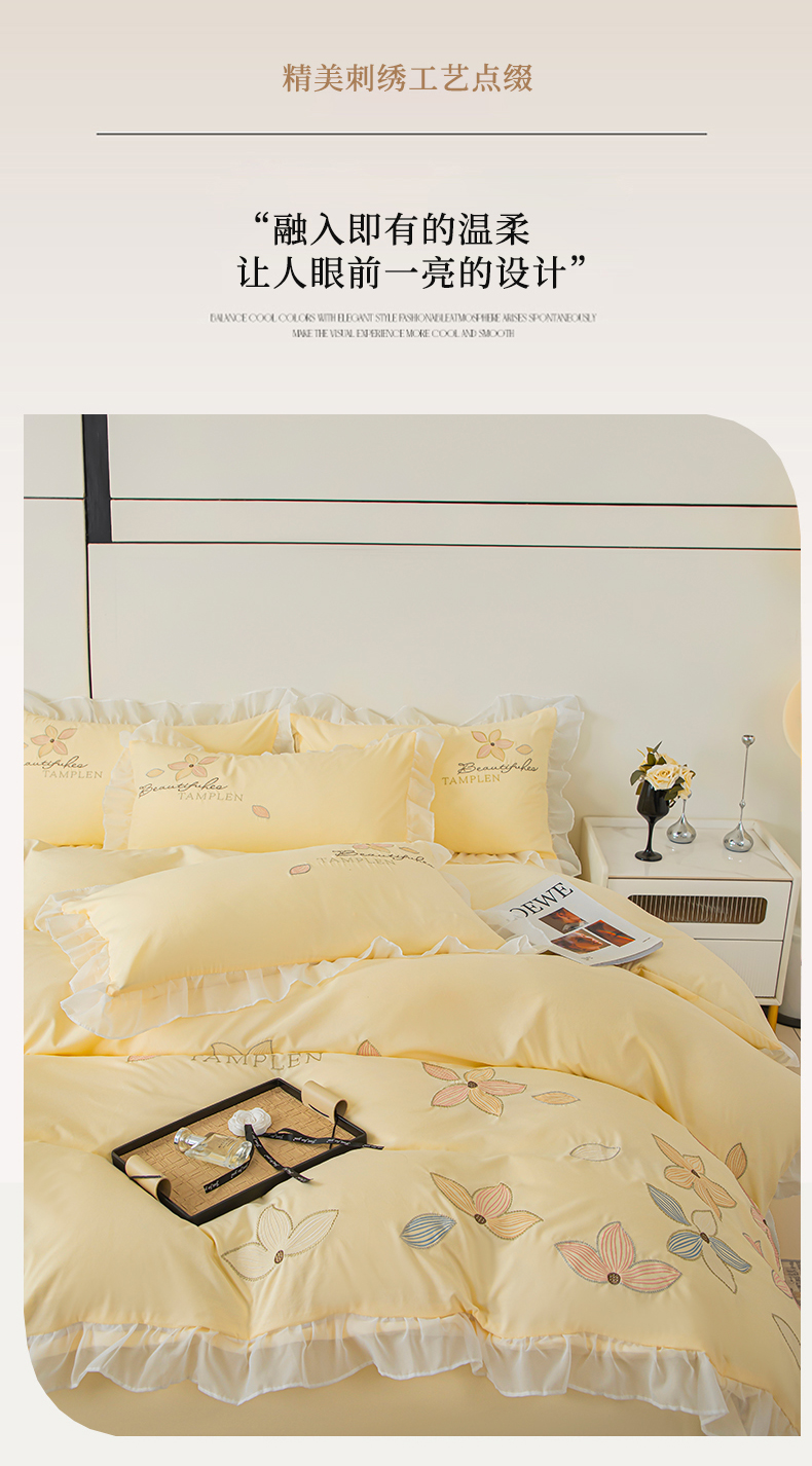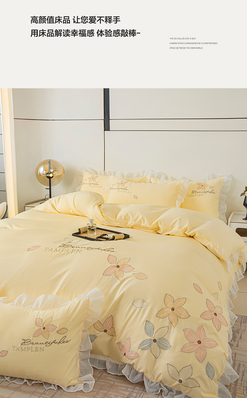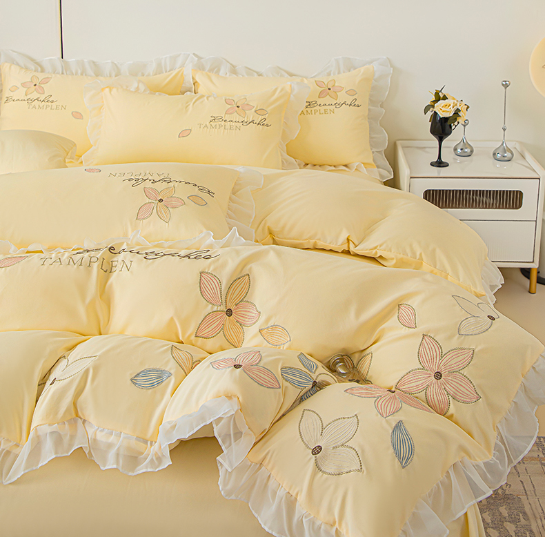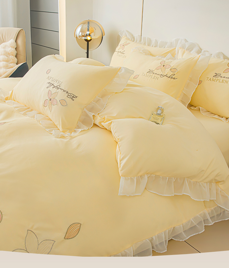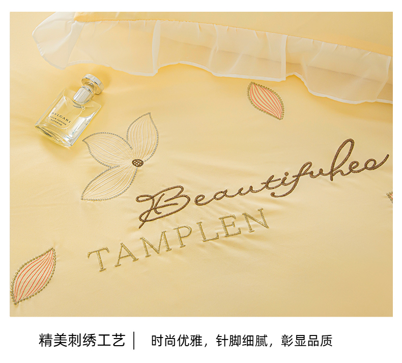 当前位置: 91家纺网 > 商品网购 > 床品套件 > 四件套 > 水洗棉四件套 > 木子家纺 2026新款水洗棉刺绣四件套-花颜系列 花颜-萱草黄