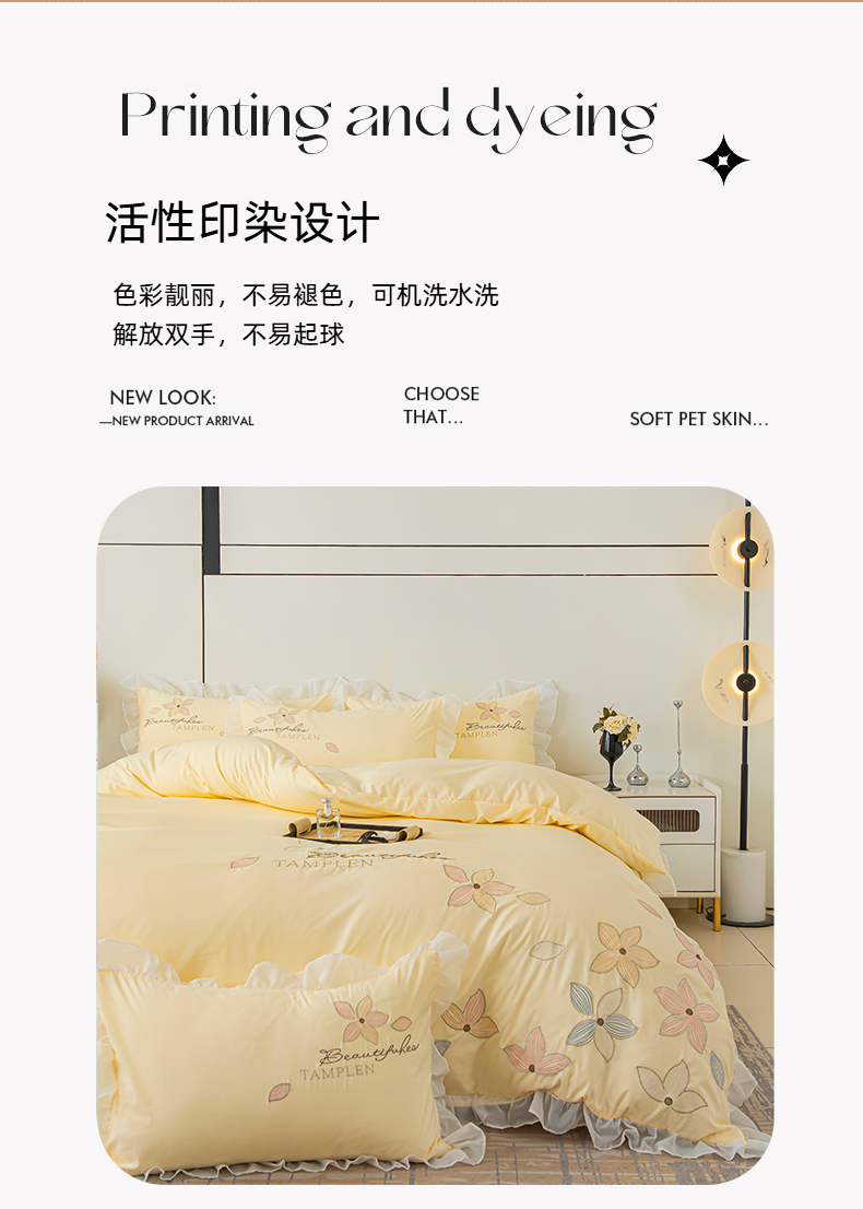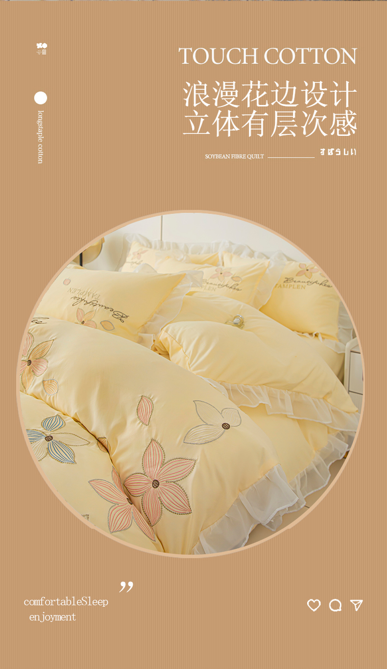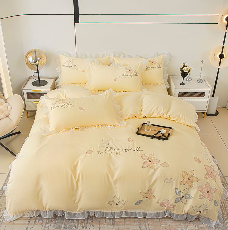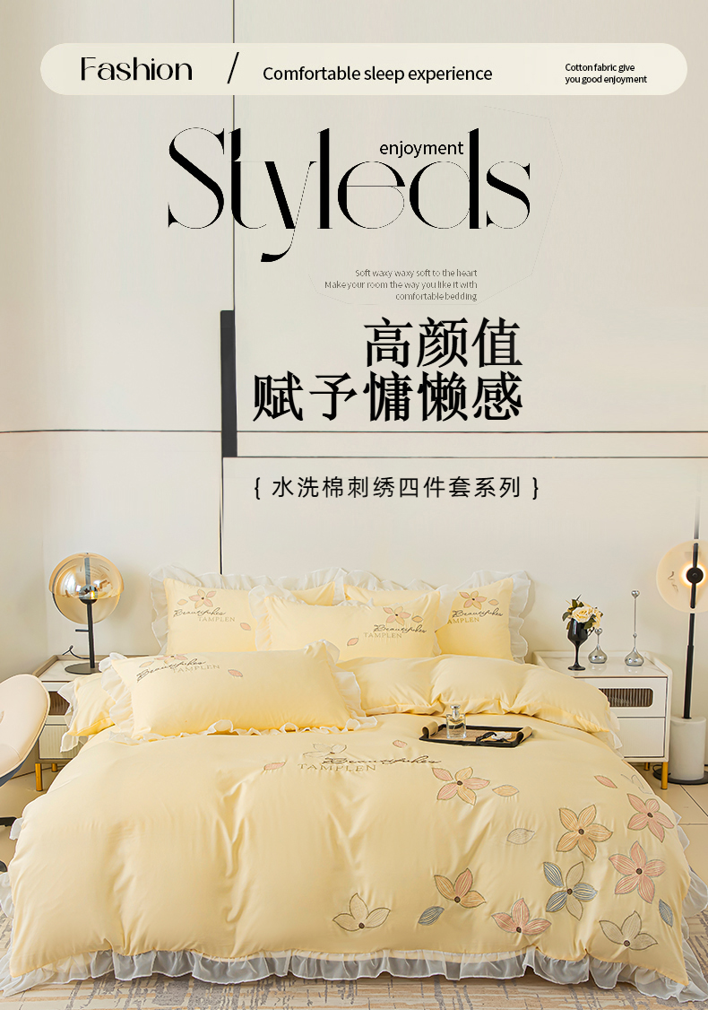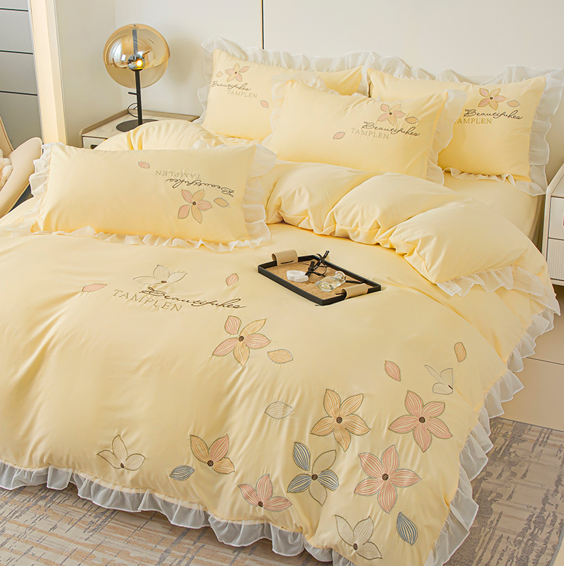 当前位置: 91家纺网 > 商品网购 > 床品套件 > 四件套 > 水洗棉四件套 > 木子家纺 2026新款水洗棉刺绣四件套-花颜系列 花颜-萱草黄
