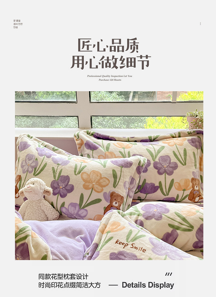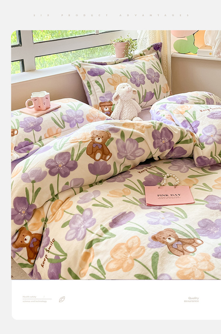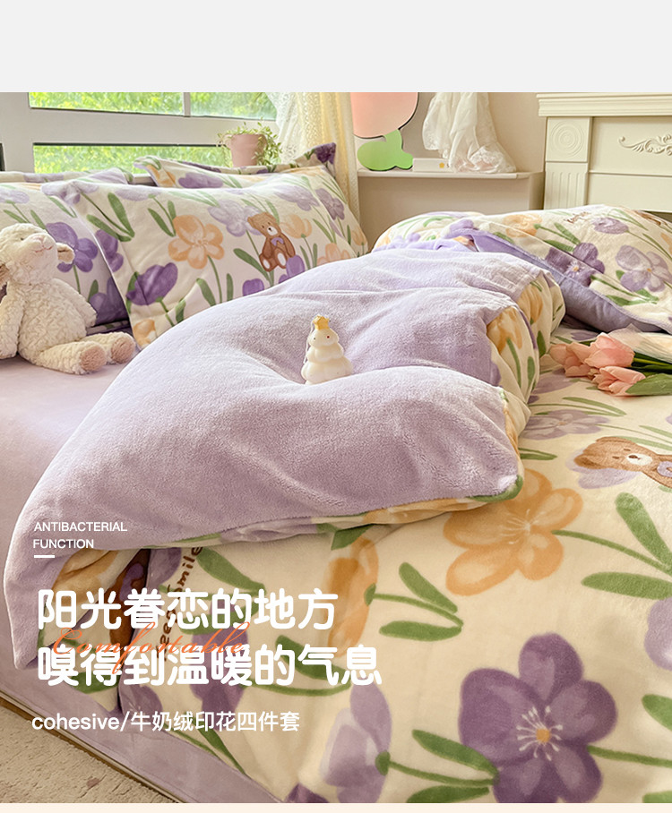 沐棉 2023新款牛奶绒印花+小清新四件套 花园小熊