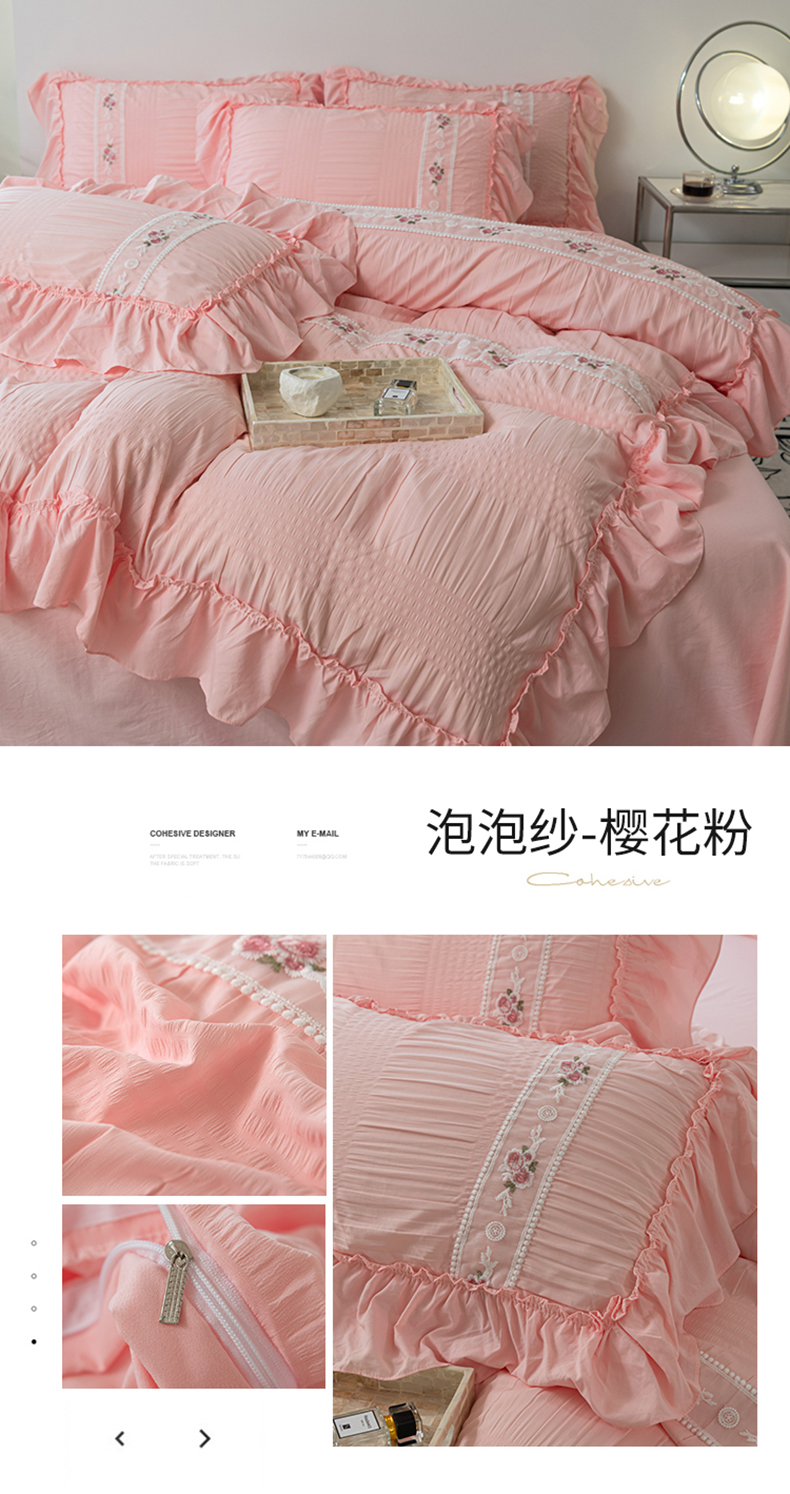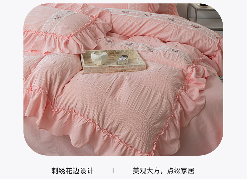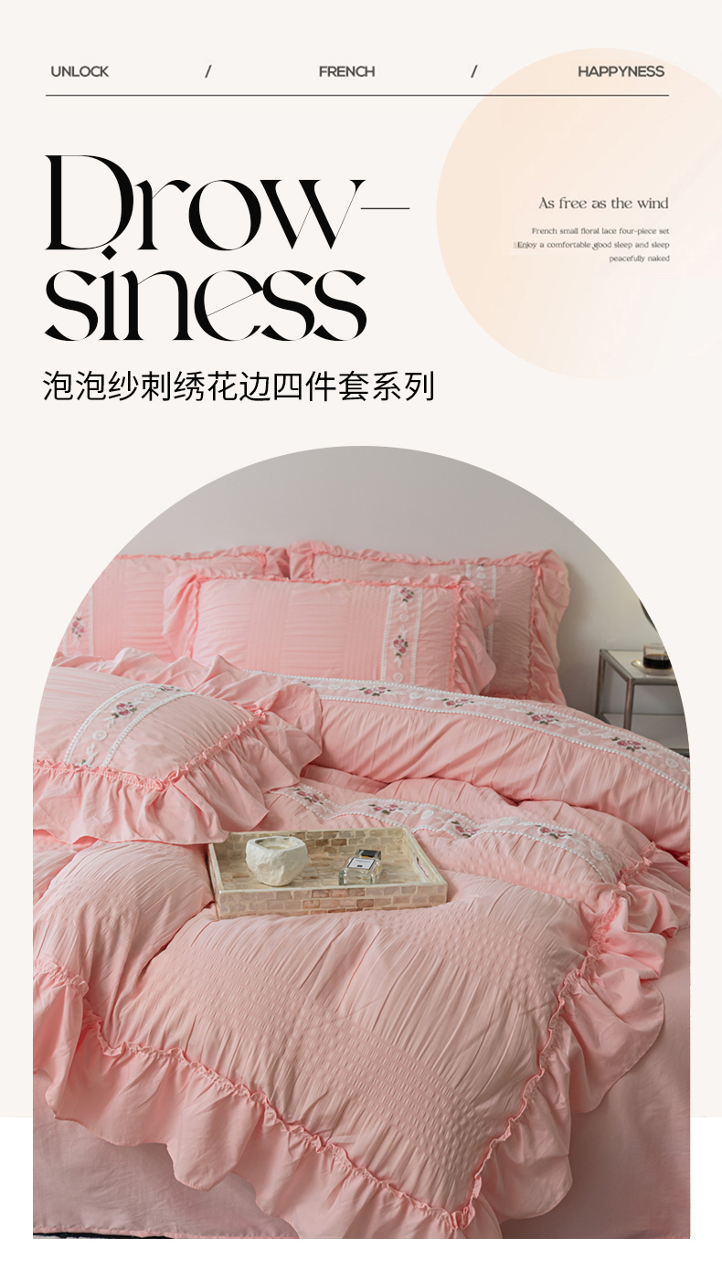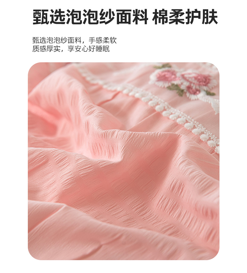 当前位置: 91家纺网 > 商品网购 > 床品套件 > 四件套 > 水洗棉四件套 > 你好美丽 2025新款泡泡纱刺绣花边四件套 泡泡纱-樱花粉