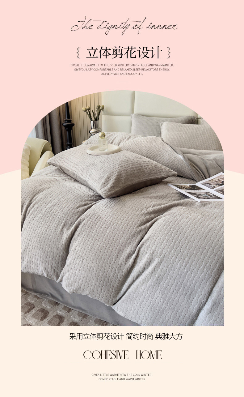 印季 2024新款立体剪花牛奶绒保暖四件套-十字结 高级灰