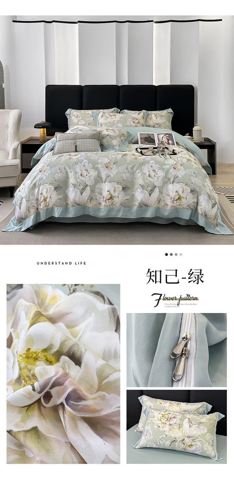 商品名称:娇逸家居 2025新款50支莱赛尔数码印花宽边拼角天丝四件套(可搭配同系列夏被和床盖) 知己-绿