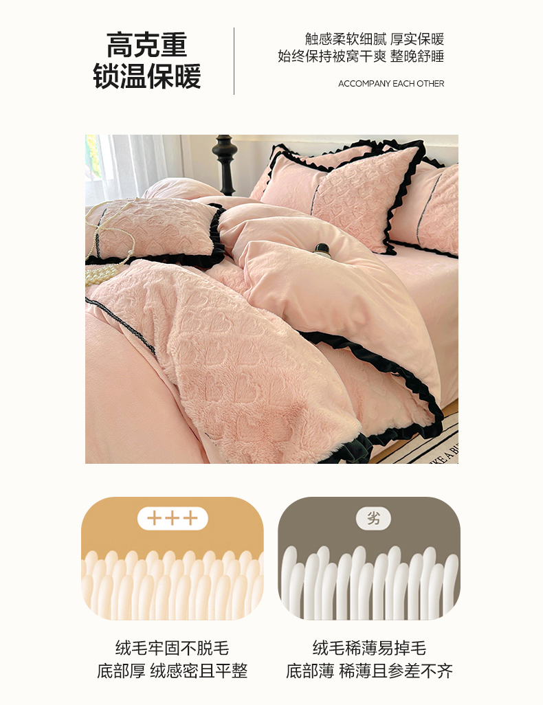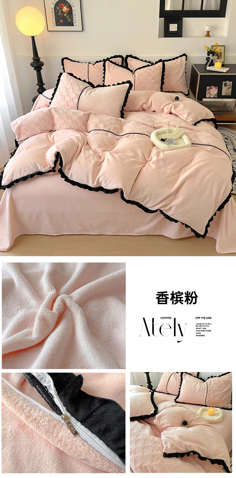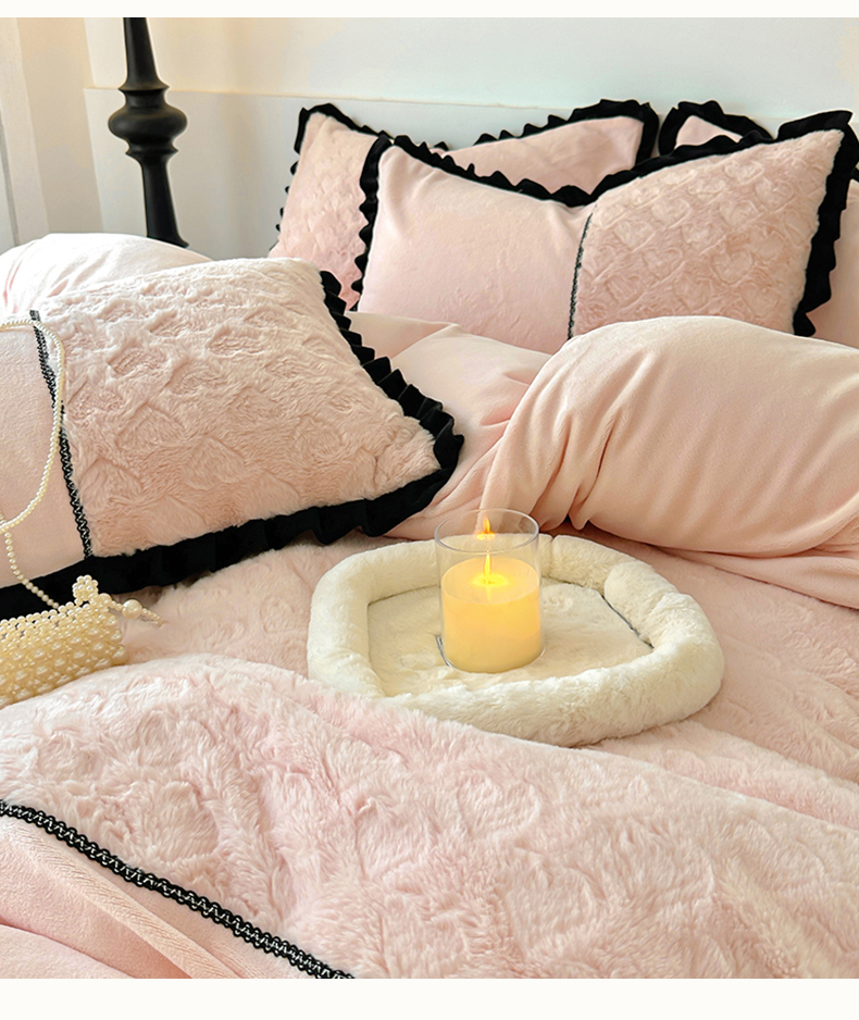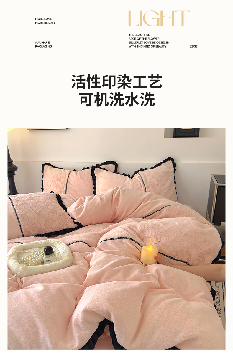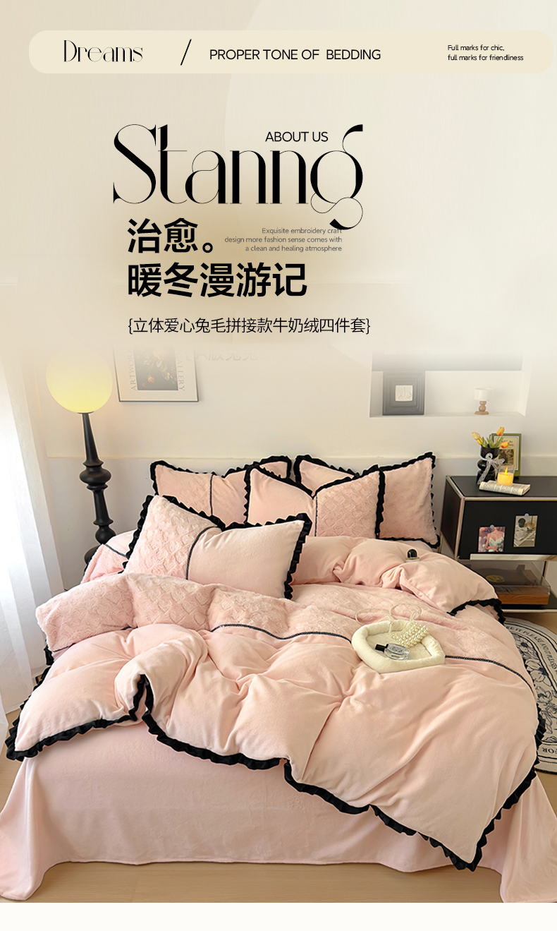 商品名称:春光里 2024新款立体爱心兔毛拼接款牛奶绒四件套 香槟粉